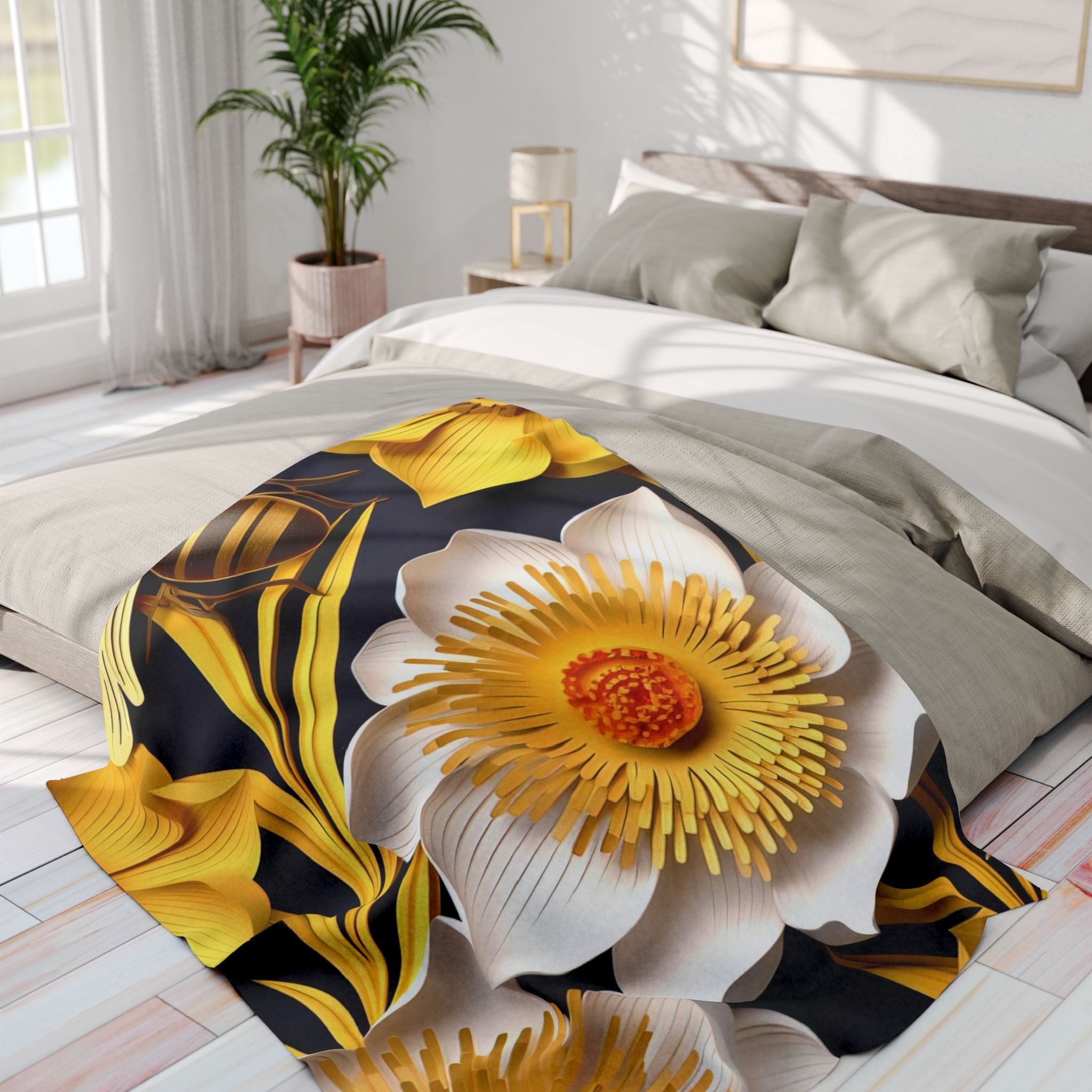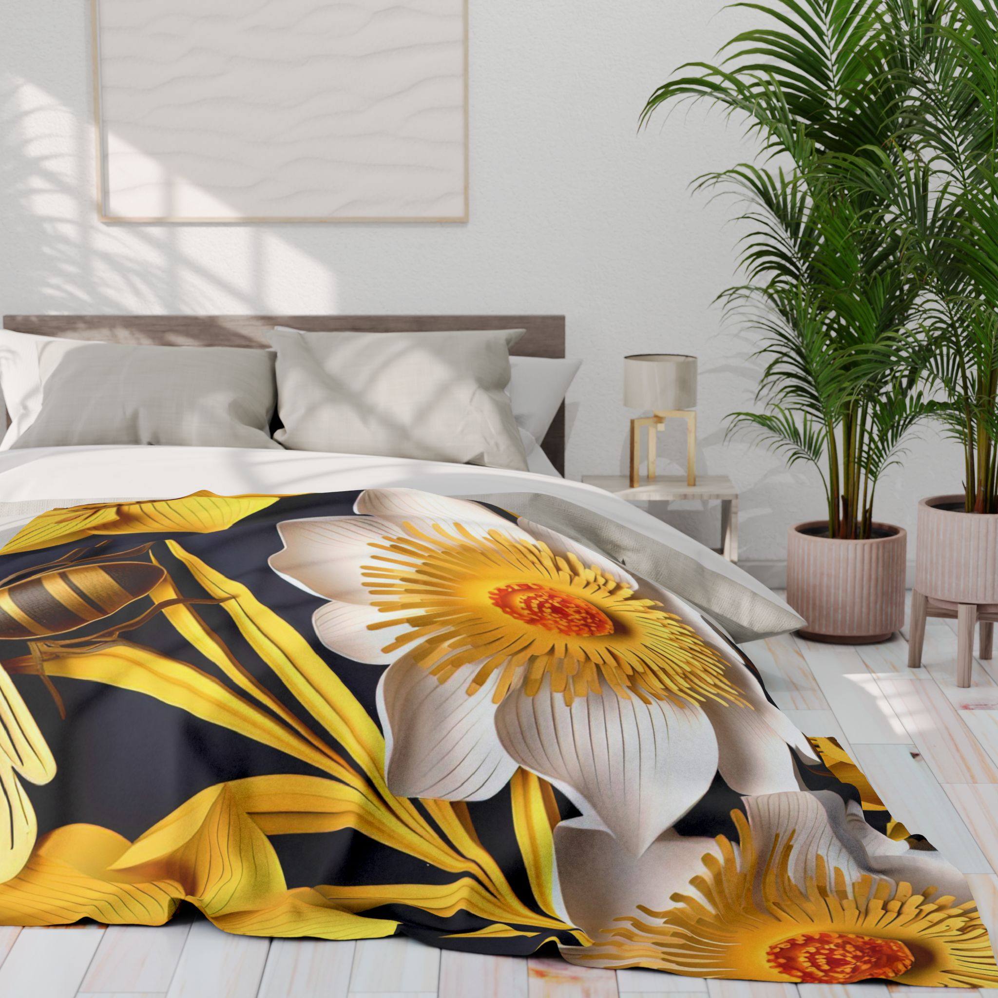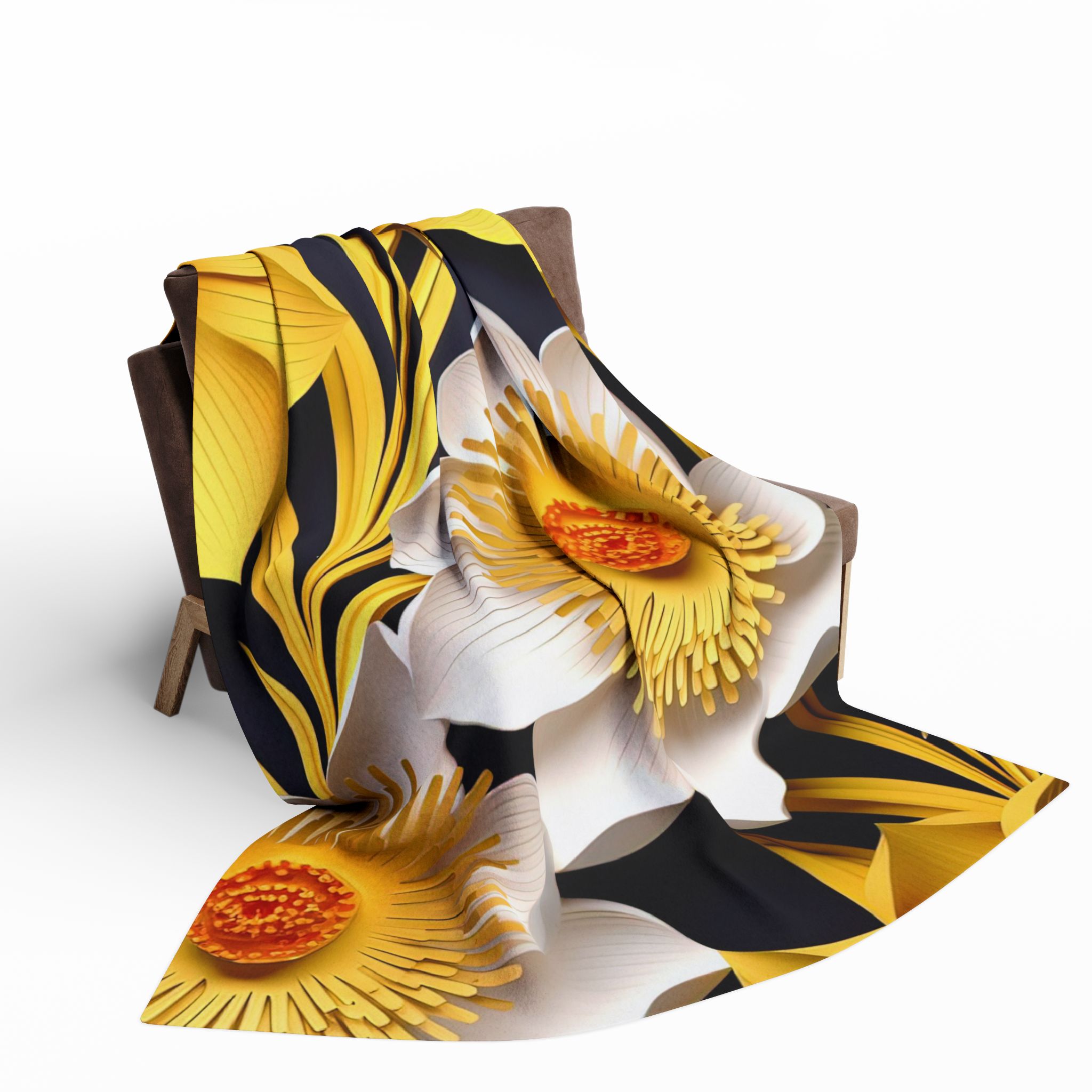 This soft polyester blanket featuring 3D spring yellow flowers with a bee gives a cozy and comforting vibe, perfect for snuggling up on chilly evenings. Ideal for nature lovers and those who appreciate vibrant floral designs. Relevant for springtime celebrations, Mother’s Day, and Easter.