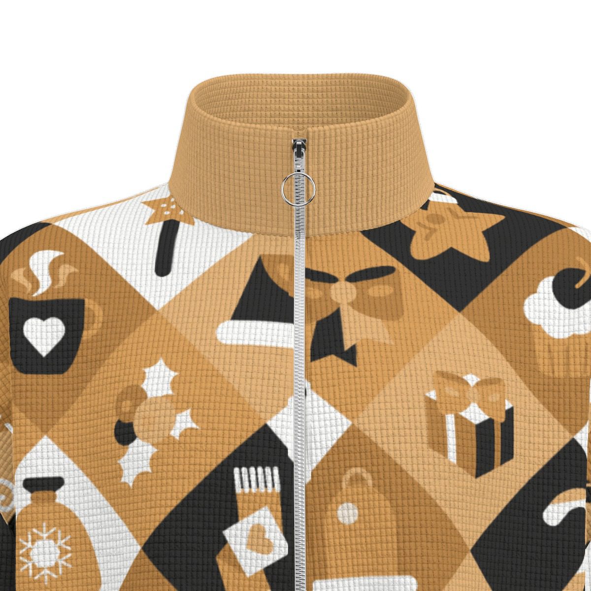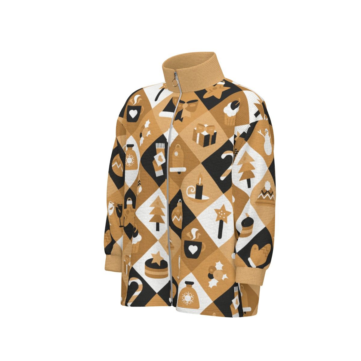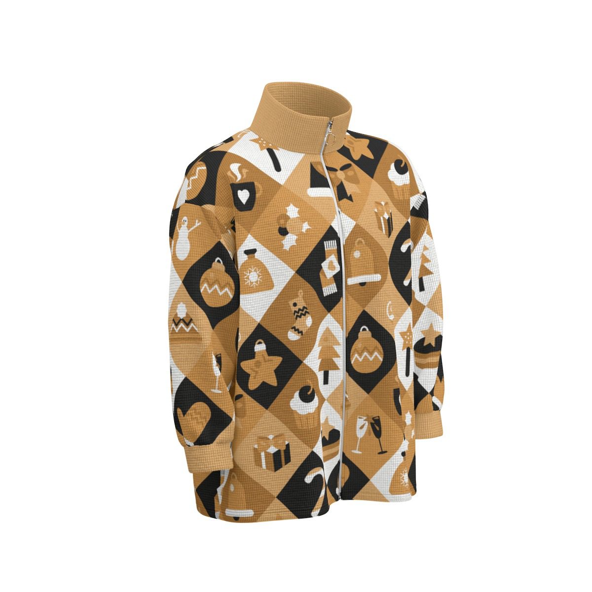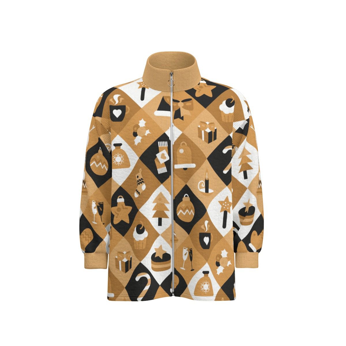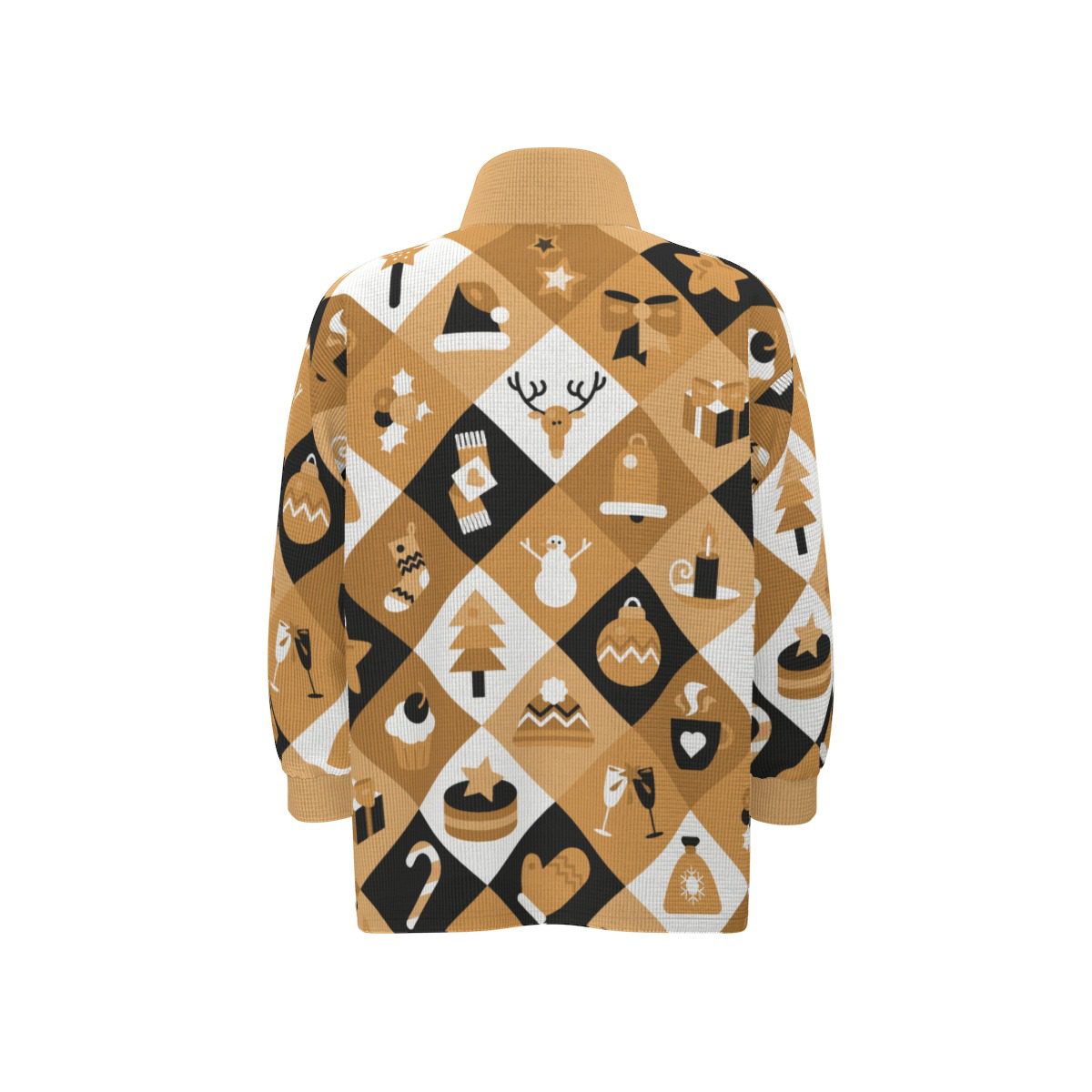 Celebrate Christmas in style with this Boho Christmas Jacket. It has a warm, golden, and black pattern filled with fun holiday symbols like Christmas trees, snowmen, gifts, stars, bells, and reindeer.