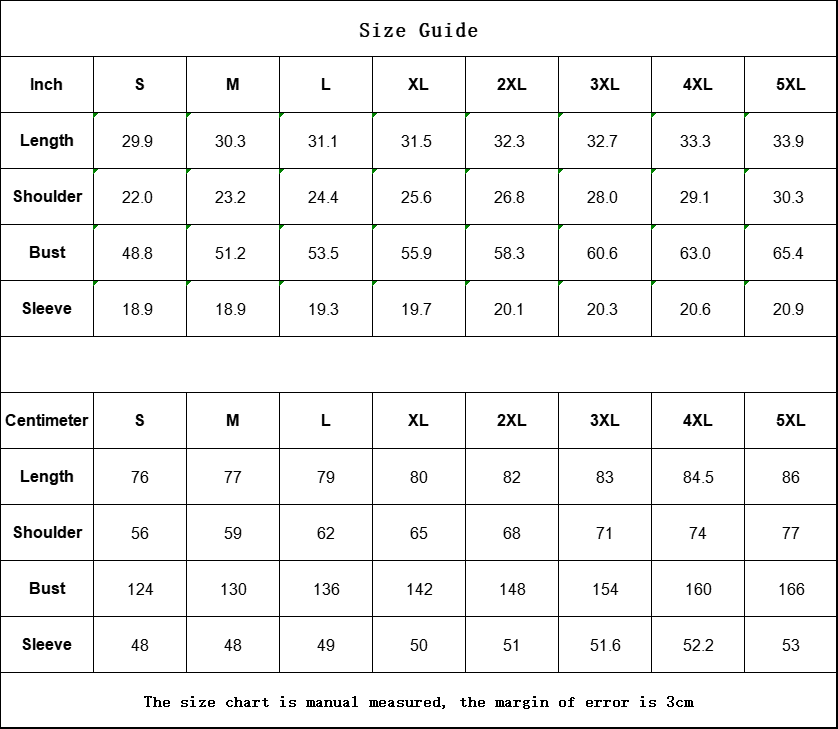 | Centimeter | S | M | L | XL | 2XL | 3XL | 4XL | 5XL |