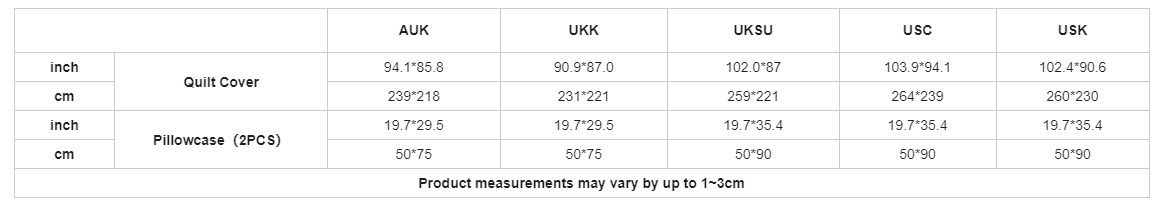 | inch | Pillowcase(2PCS) | 19.7*29.5 | 19.7*29.5 | 19.7*35.4 | 19.7*35.4 | 19.7*35.4 |