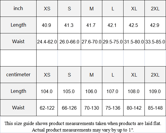 | Waist | 24.4-62.0 | 26.0-66.0 | 27.6-70.0 | 29.5-75.0 | 31.5-80.0 | 33.5-85.0 |