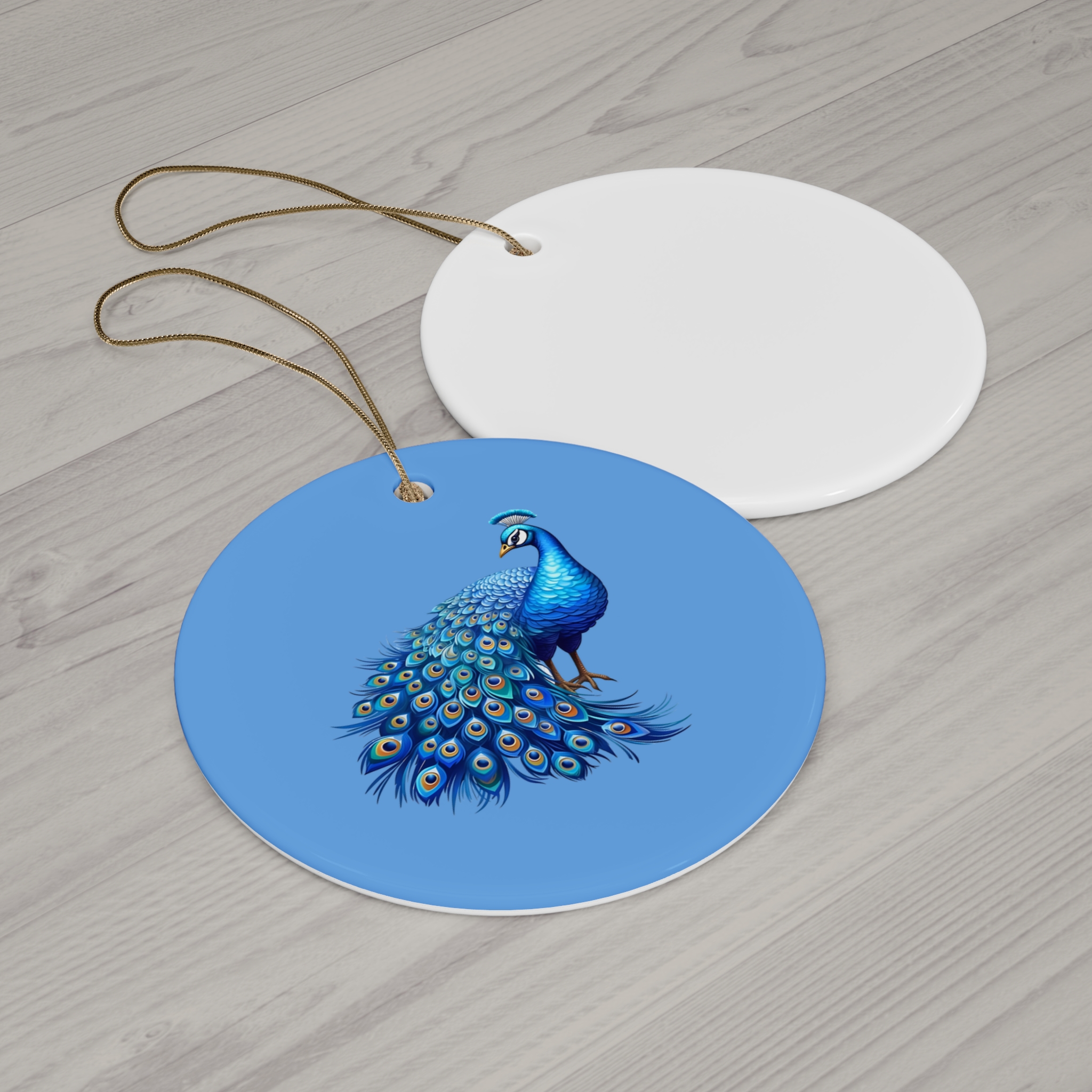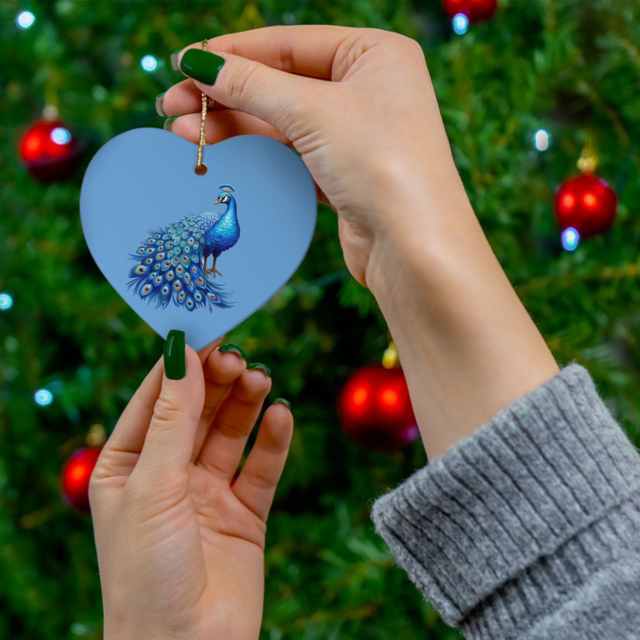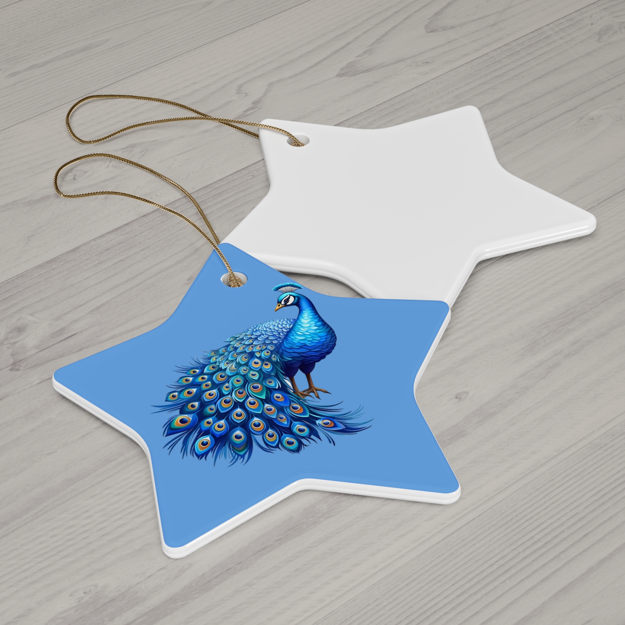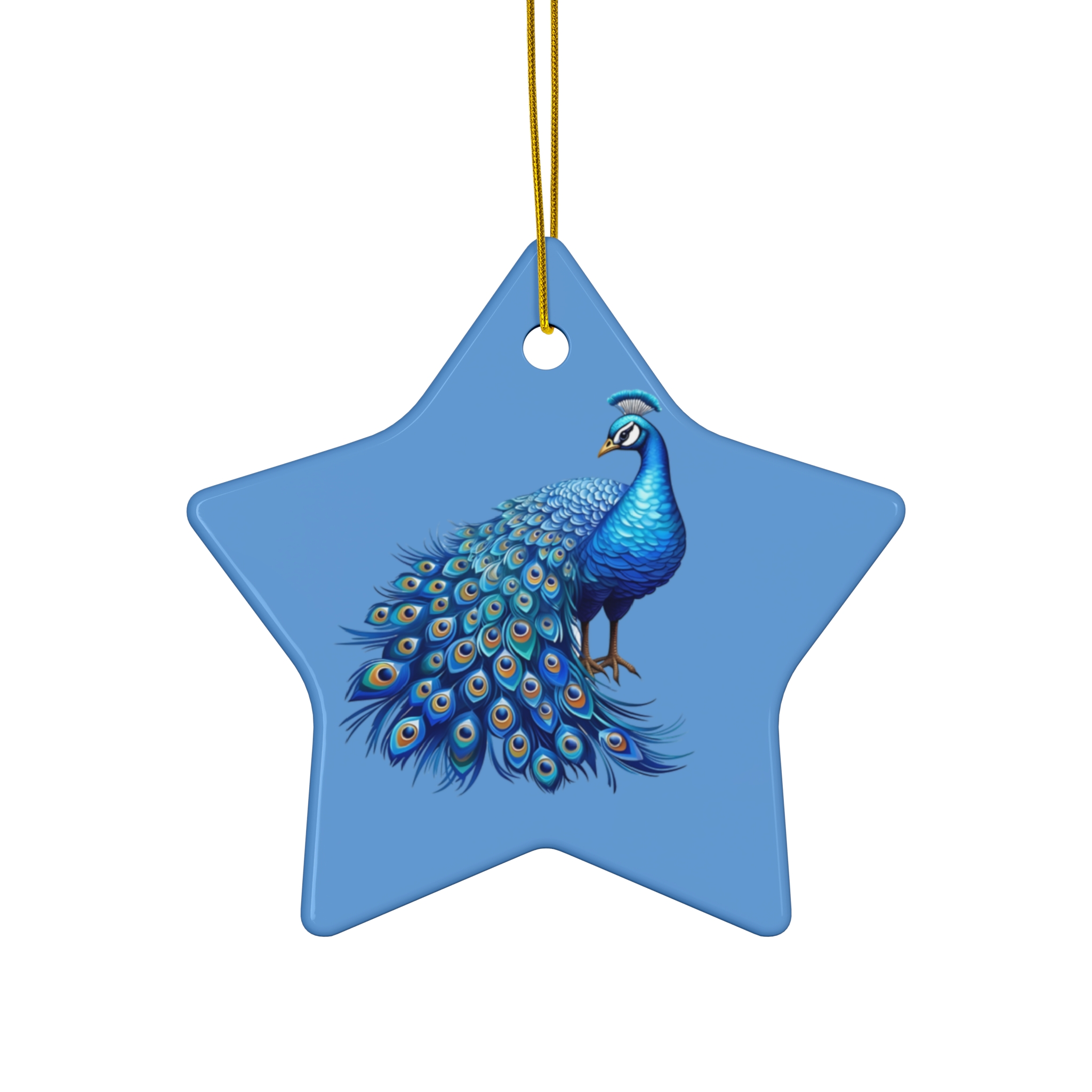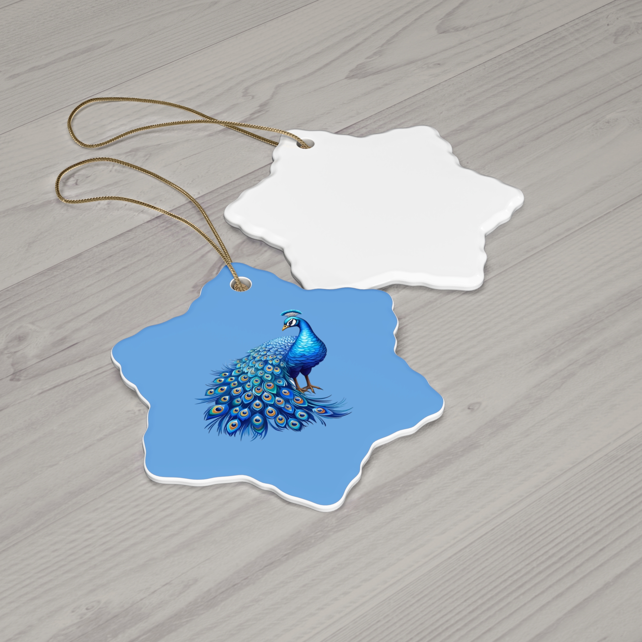 A beautiful Ceramic Ornament featuring a vibrant peacock illustration design, perfect for adding a touch of color and elegance to your holiday decor. Ideal for those who appreciate unique and artistic ornaments, this ornament is available in 4 shapes – Snowflake, Star, Heart, and Circle.