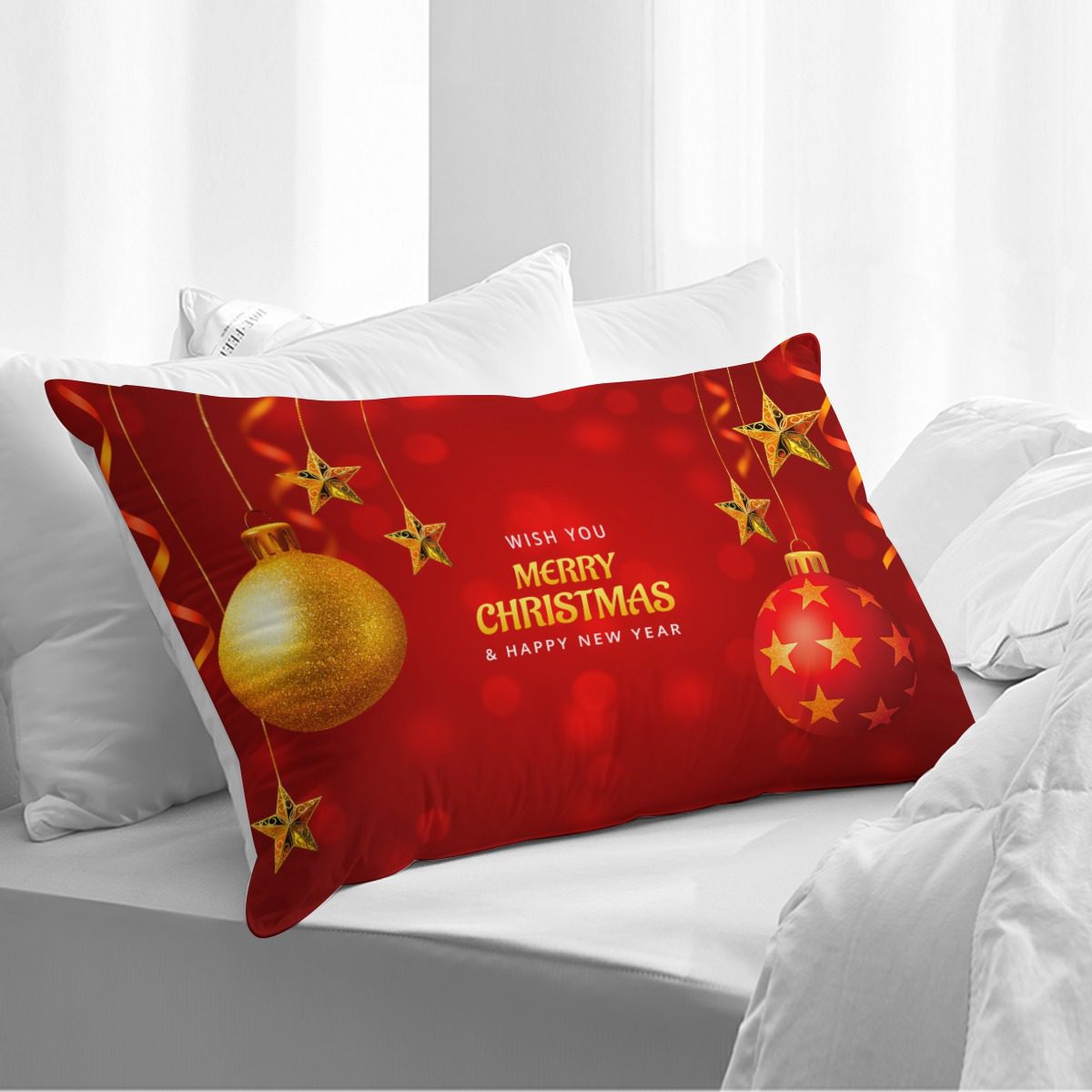 This Christmas pillow cover features a bold red backdrop with golden ornaments and festive details. The design feels warm, cheerful, and timeless.