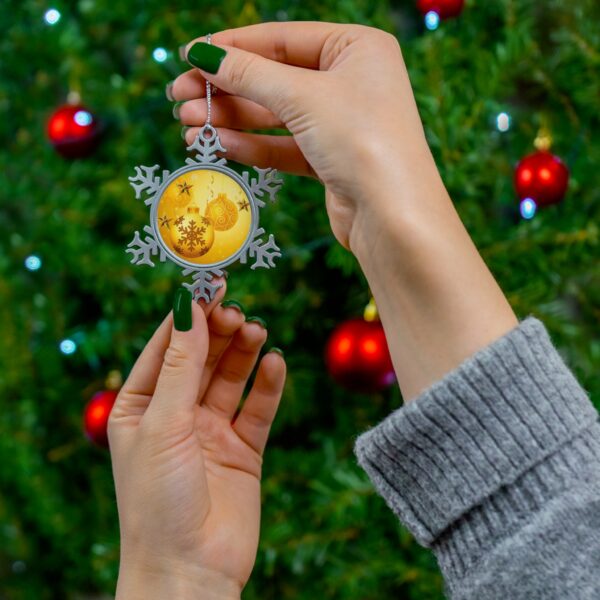 Add a touch of elegance to your Christmas tree with this Christmas Design Pewter Ornament. The snowflake shape, glossy golden artwork, and solid pewter build make it a standout piece in any holiday setup. Its bright colors and crisp detailing bring warmth, shine, and festive charm to your home. Hang it on your own tree or gift it to someone special.