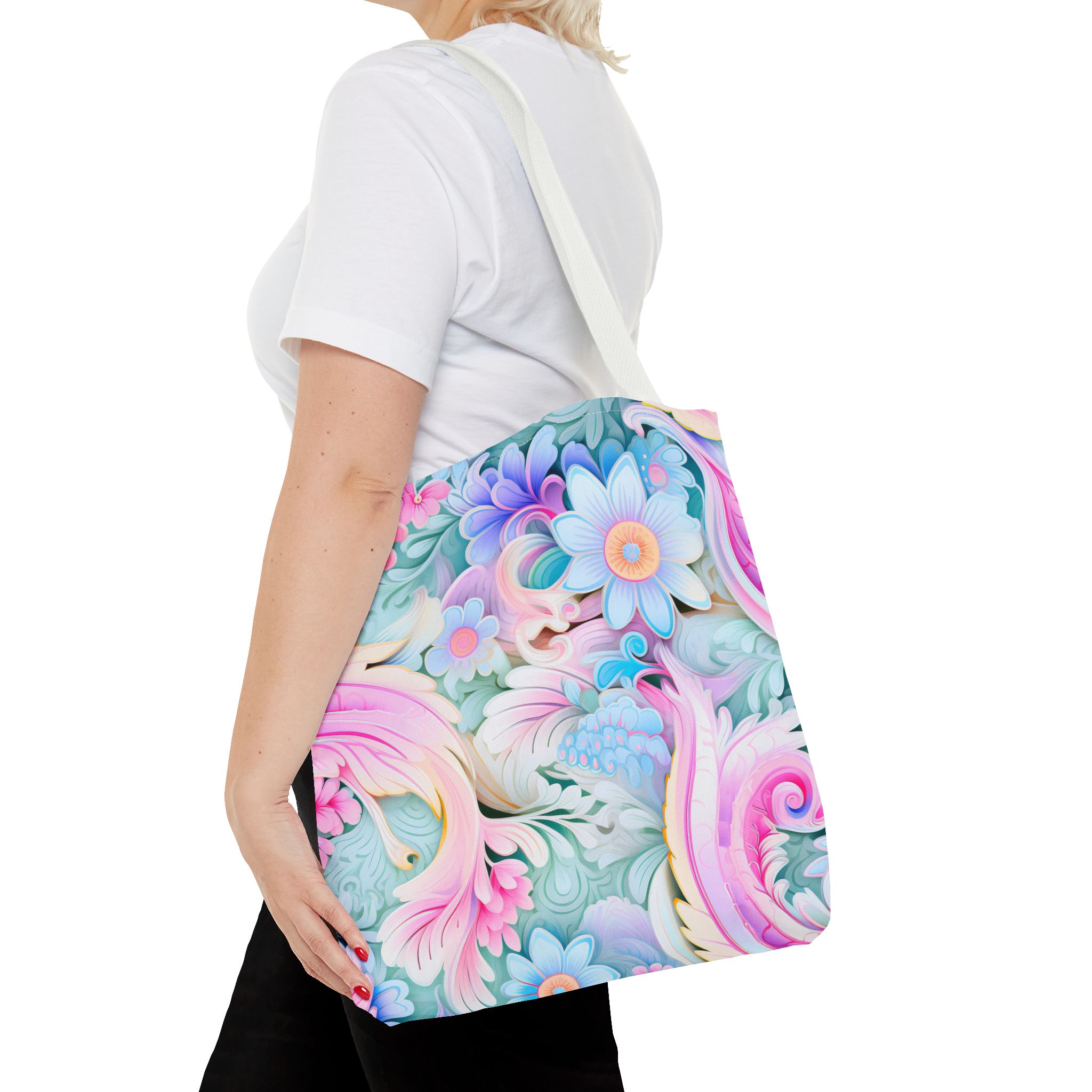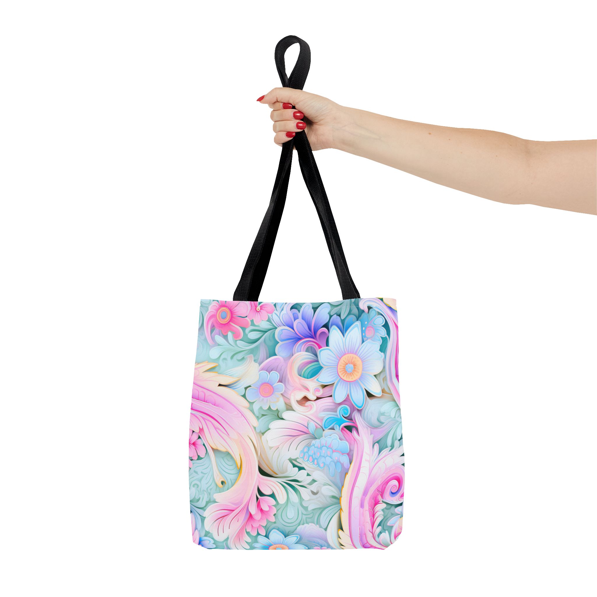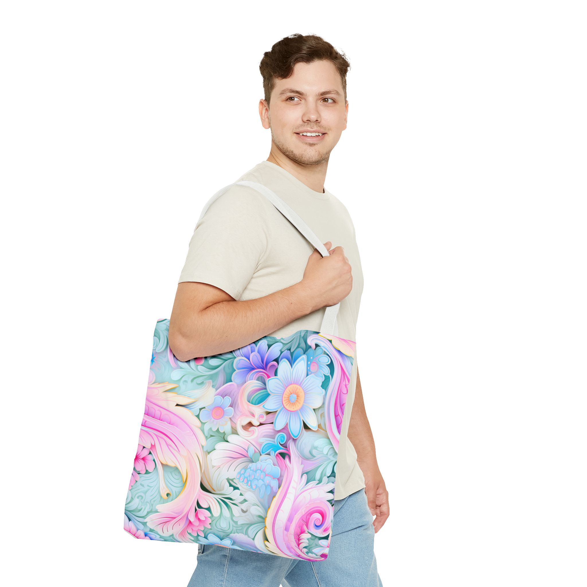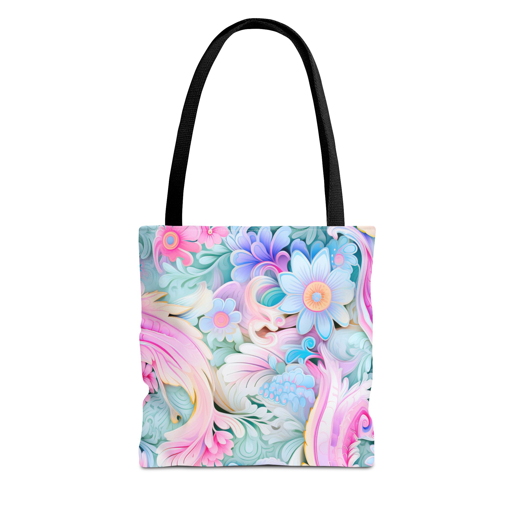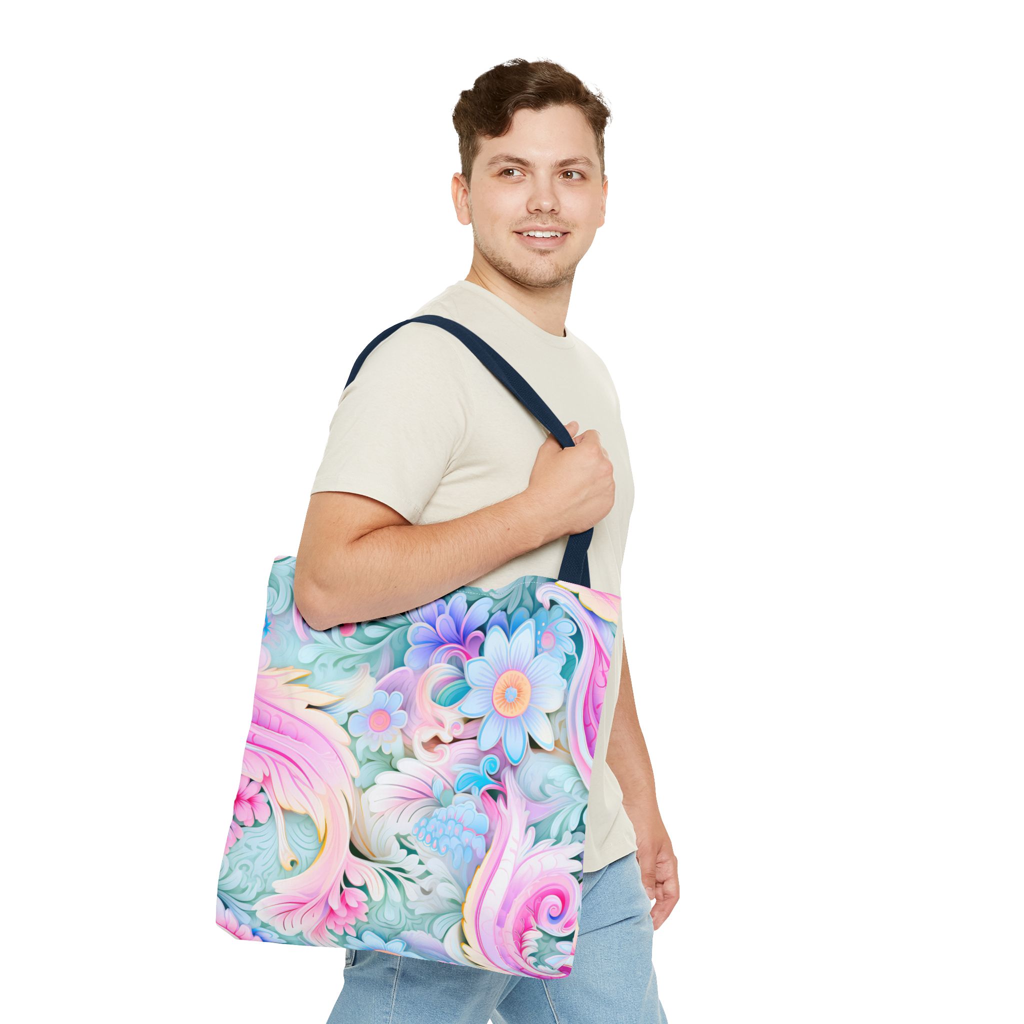 Add a burst of color to your everyday style with our Colorful Floral Pattern Tote Bag. Available in three versatile sizes, this tote is as functional as it is fashionable. The custom-printed floral design, combined with your choice of multiple handle colors, ensures a perfect match for your style. Crafted from durable spun polyester, it features double-stitched seams, sturdy cotton webbing straps, and a nonwoven laminate lining for extra durability. The all-over floral pattern is created using dye sublimation for vibrant, long-lasting visuals. Perfect for shopping, traveling, or everyday use!