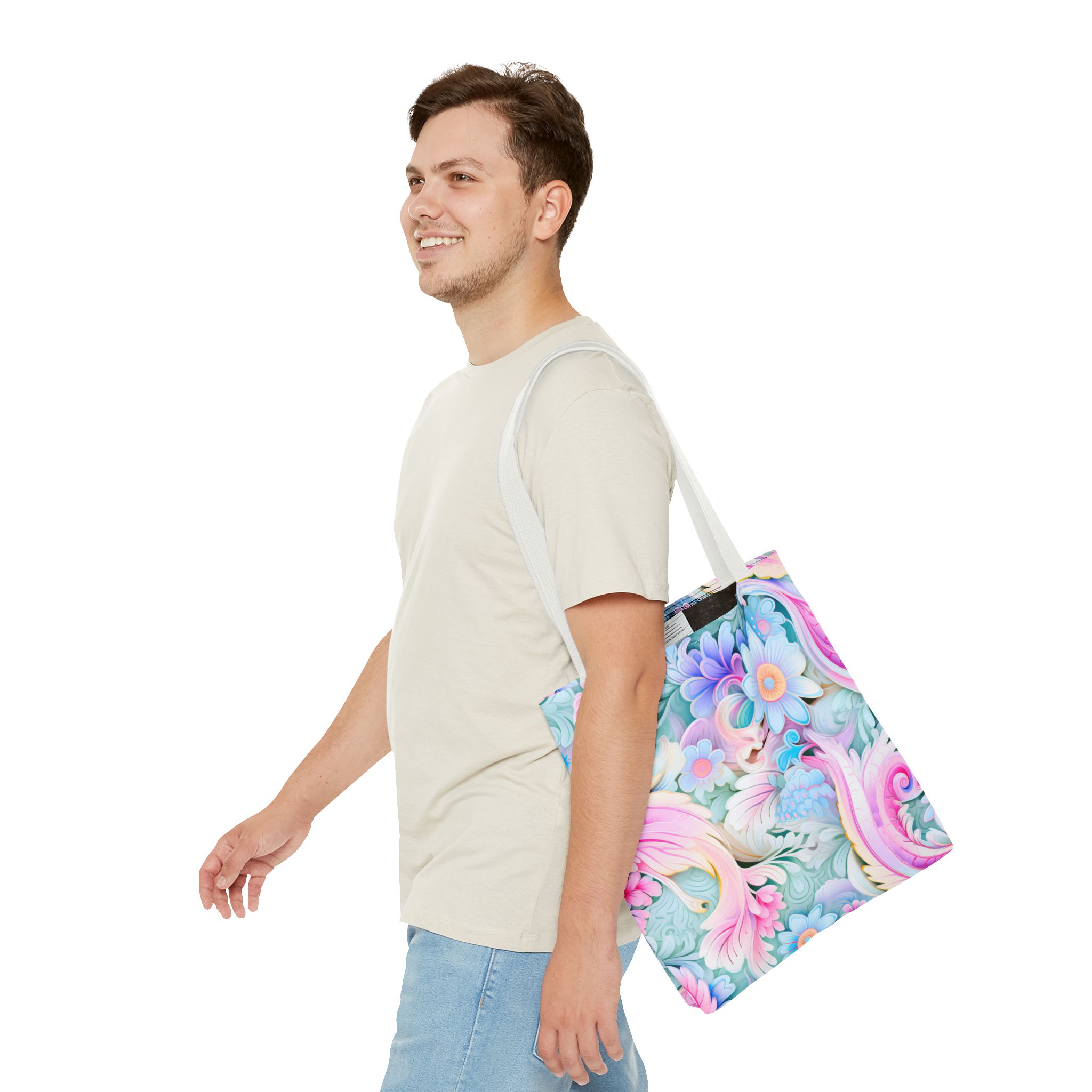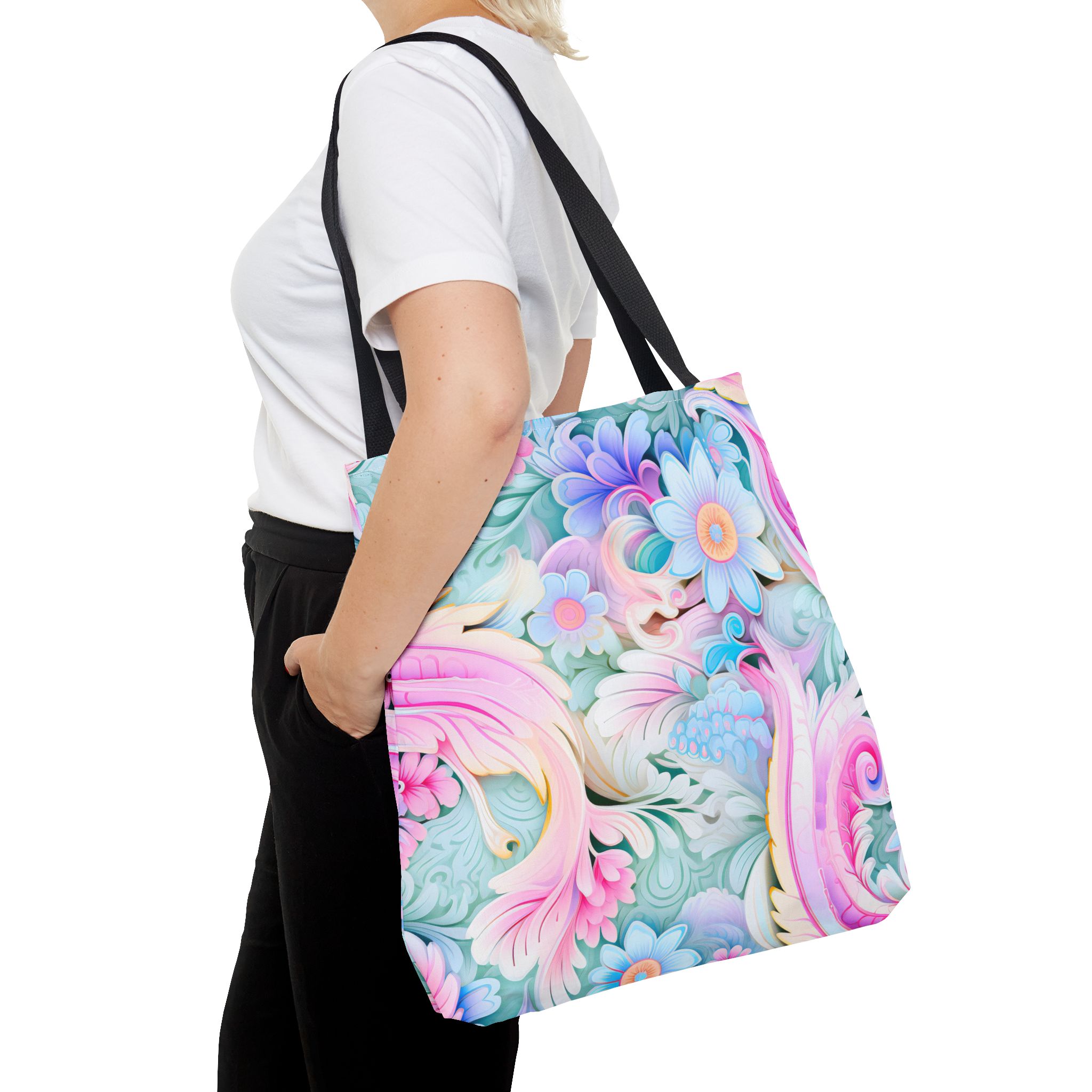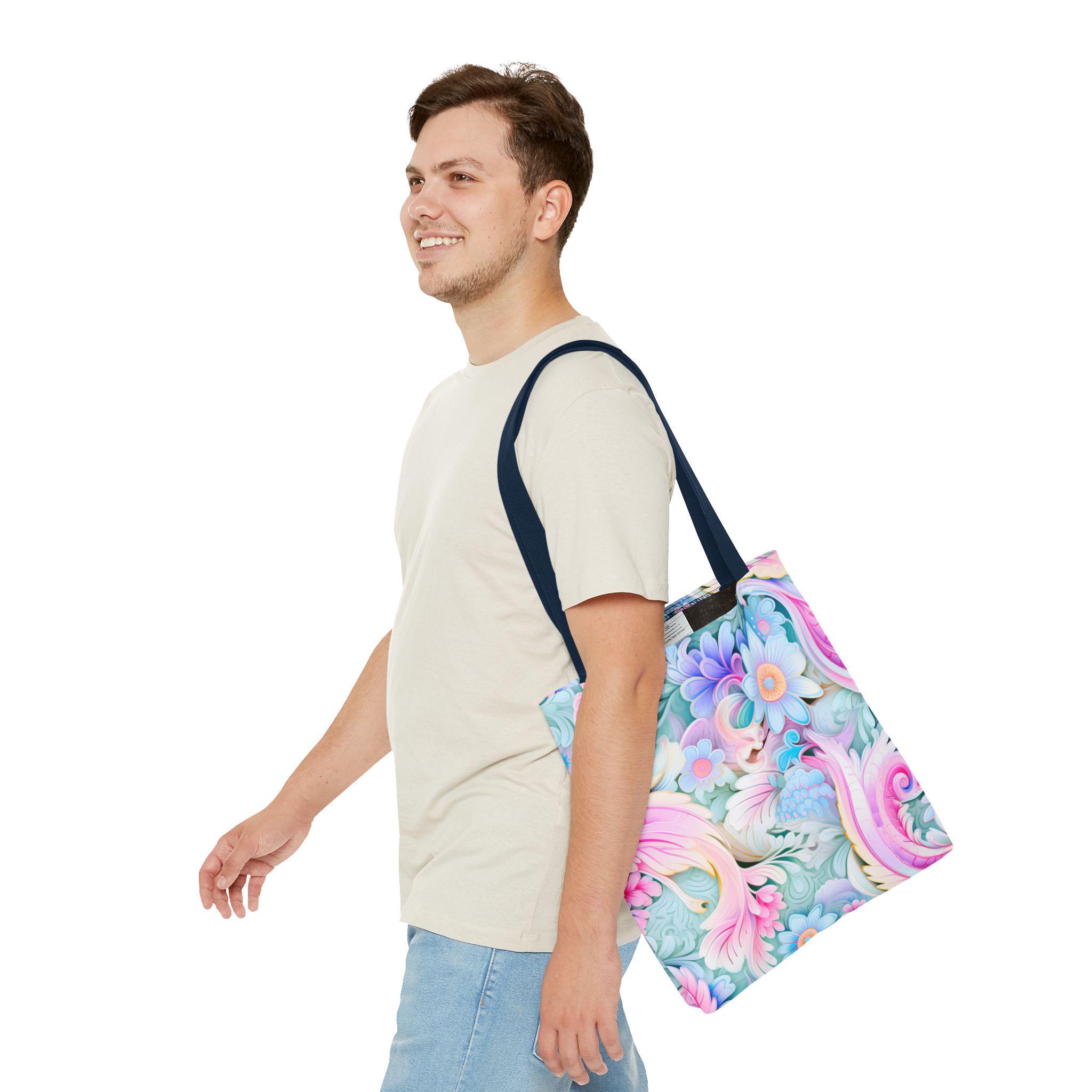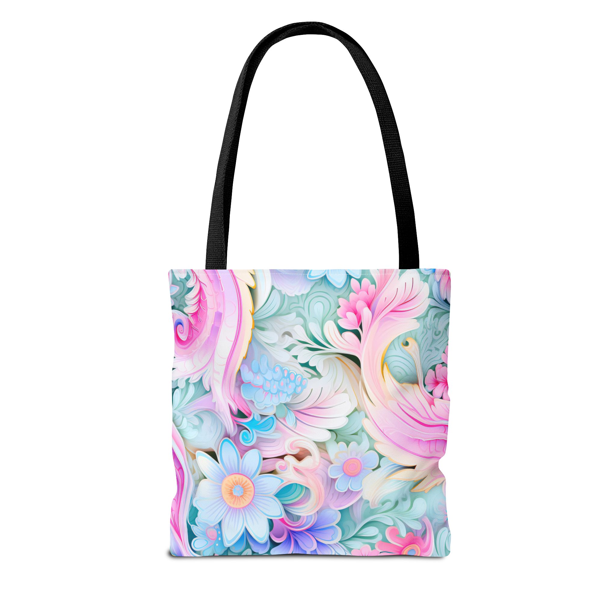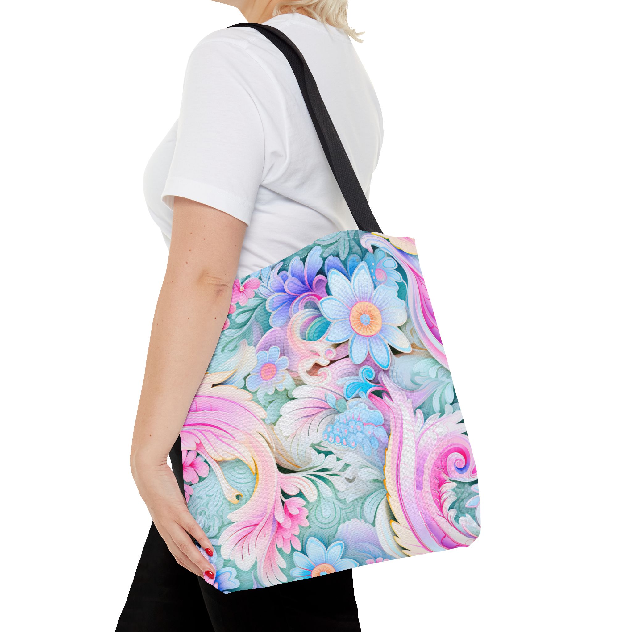Add a burst of color to your everyday style with our Colorful Floral Pattern Tote Bag. Available in three versatile sizes, this tote is as functional as it is fashionable. The custom-printed floral design, combined with your choice of multiple handle colors, ensures a perfect match for your style. Crafted from durable spun polyester, it features double-stitched seams, sturdy cotton webbing straps, and a nonwoven laminate lining for extra durability. The all-over floral pattern is created using dye sublimation for vibrant, long-lasting visuals. Perfect for shopping, traveling, or everyday use!