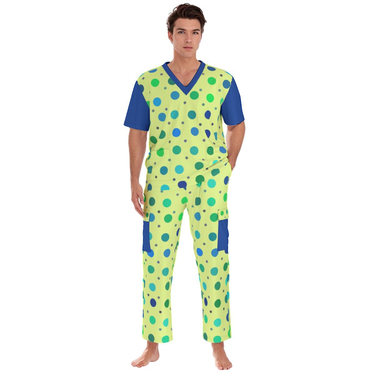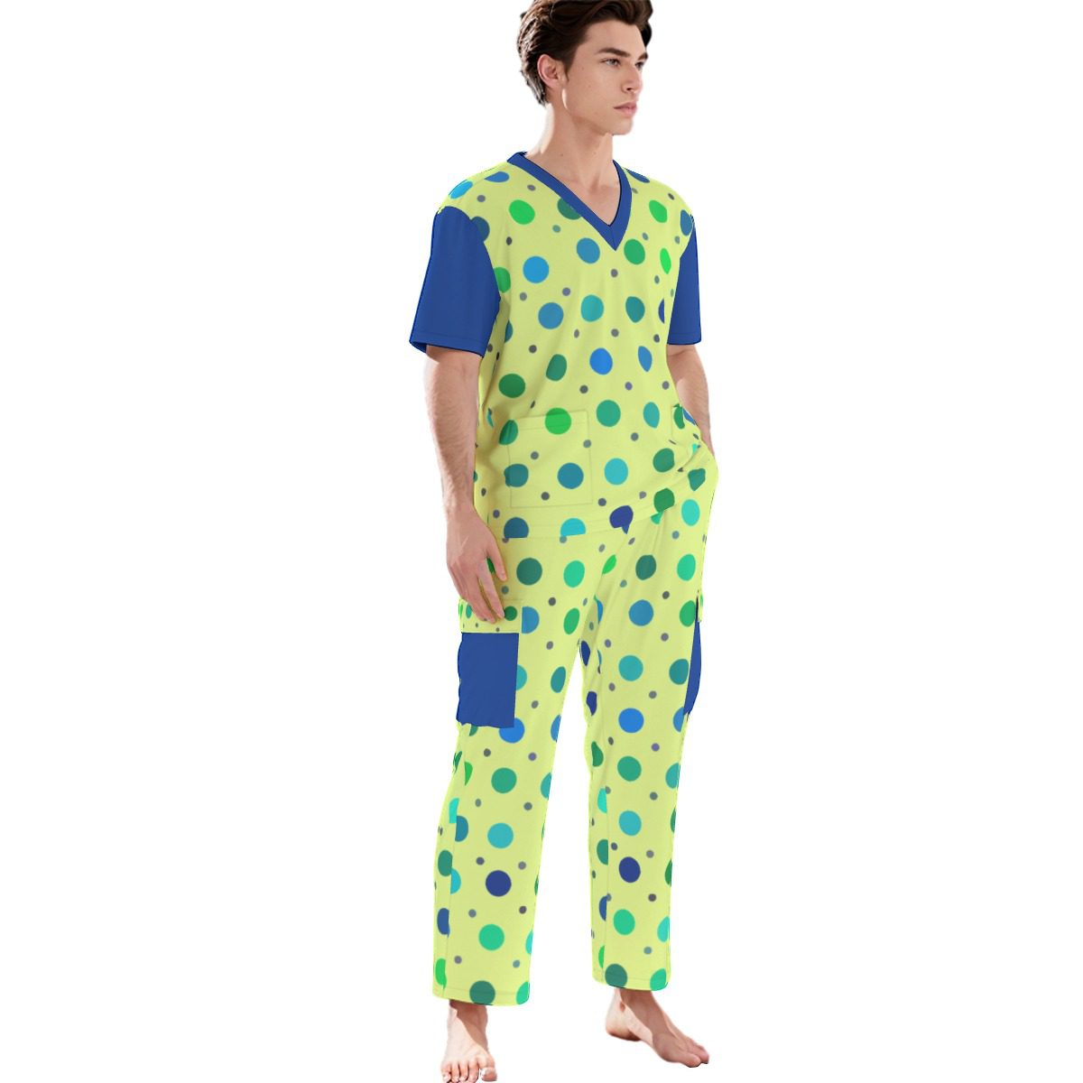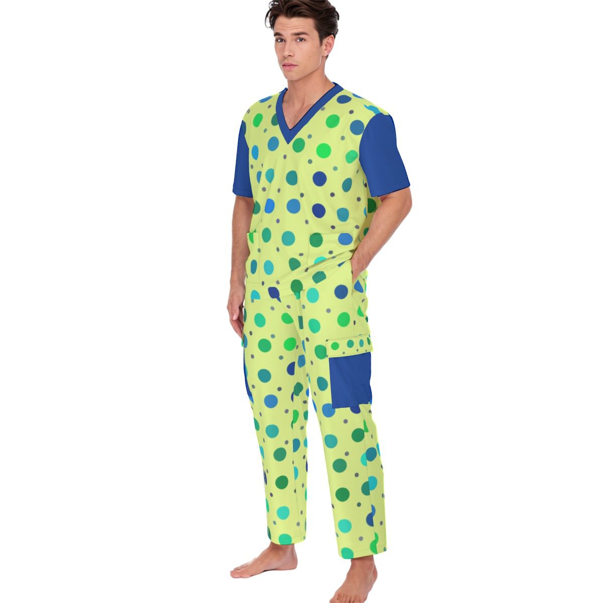 - V neckline,Two deep pockets,two side patch pockets on the pants and two patch pockets on the shirt