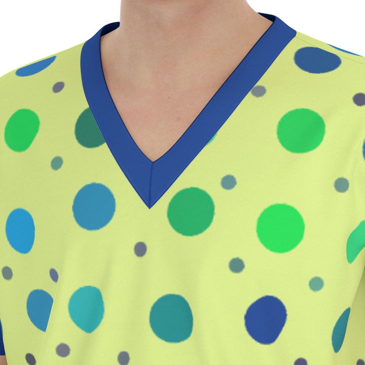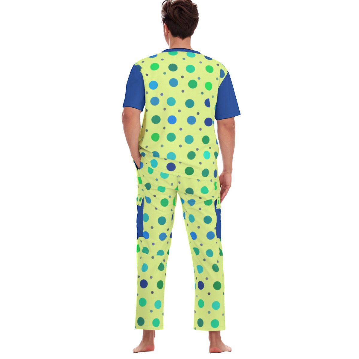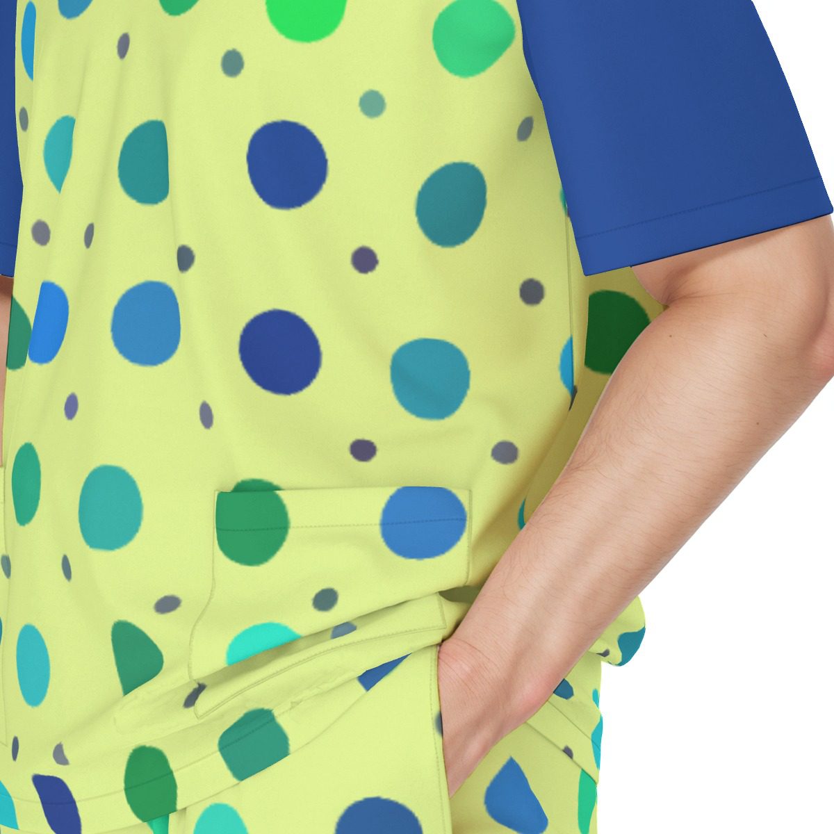 - V neckline,Two deep pockets,two side patch pockets on the pants and two patch pockets on the shirt