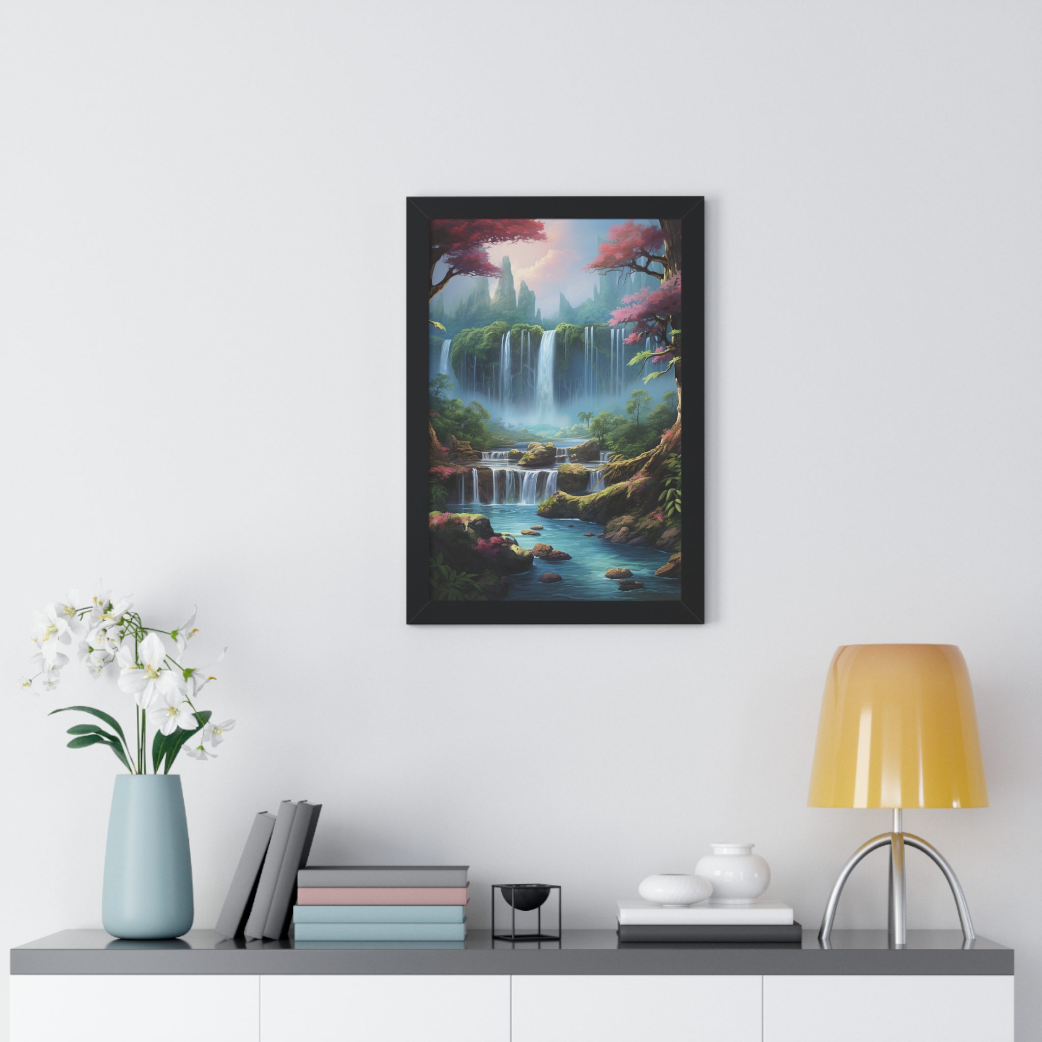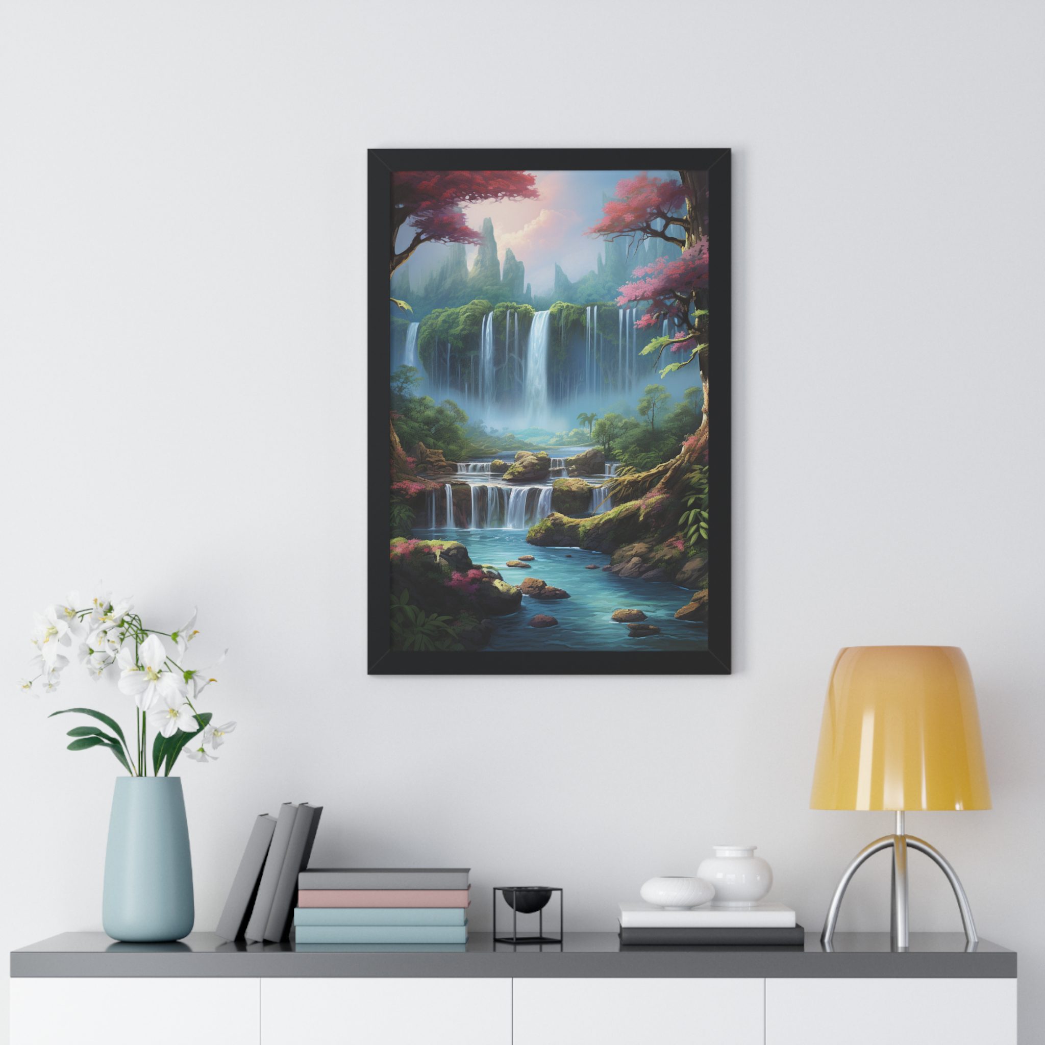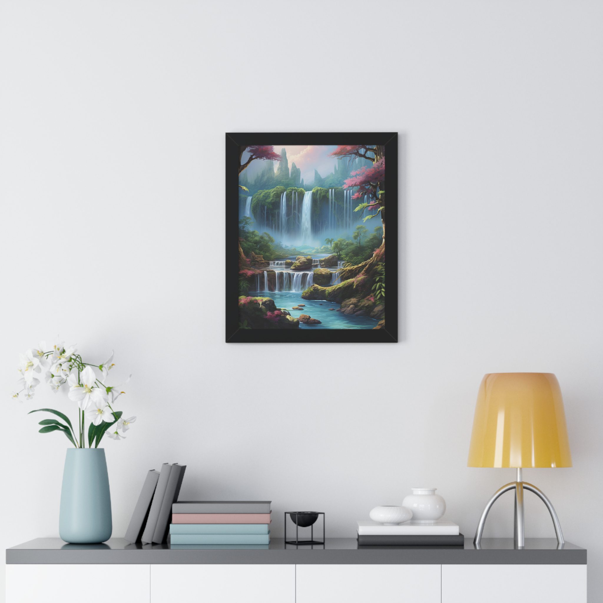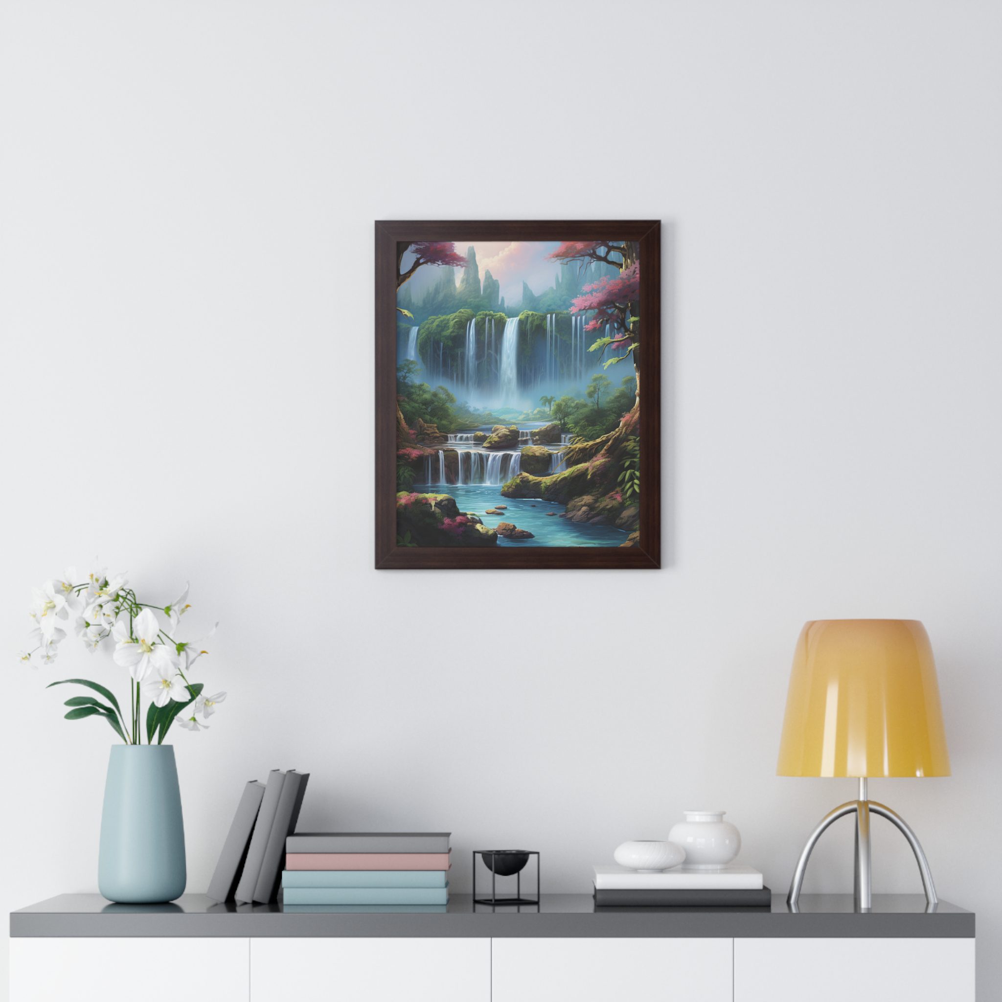 Enchanted Waterfall Surrounded By Vibrant Design, Securely framed in one of three colors (black, white, or walnut), these premium posters exhibit their varied contents through archive-worthy photo paper and ink. For easy hanging, there’s a backing hardware piece. The framing is made of MDF. Further ensuring durability, the bordering is low maintenance and resistant to swelling and warping.