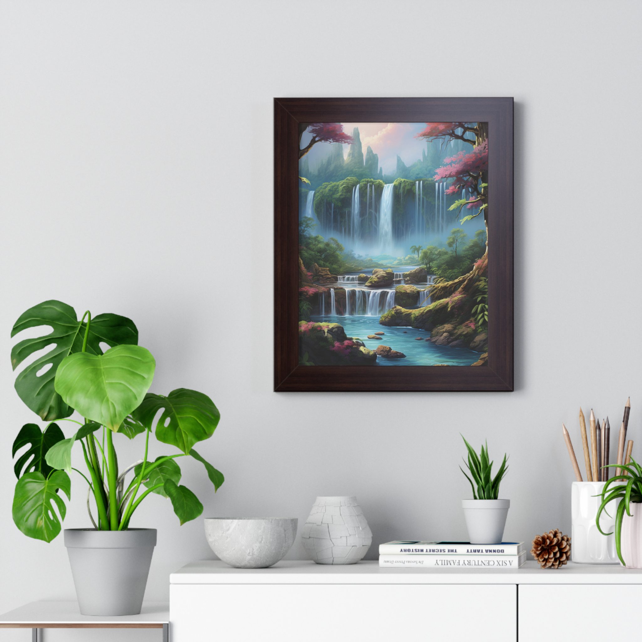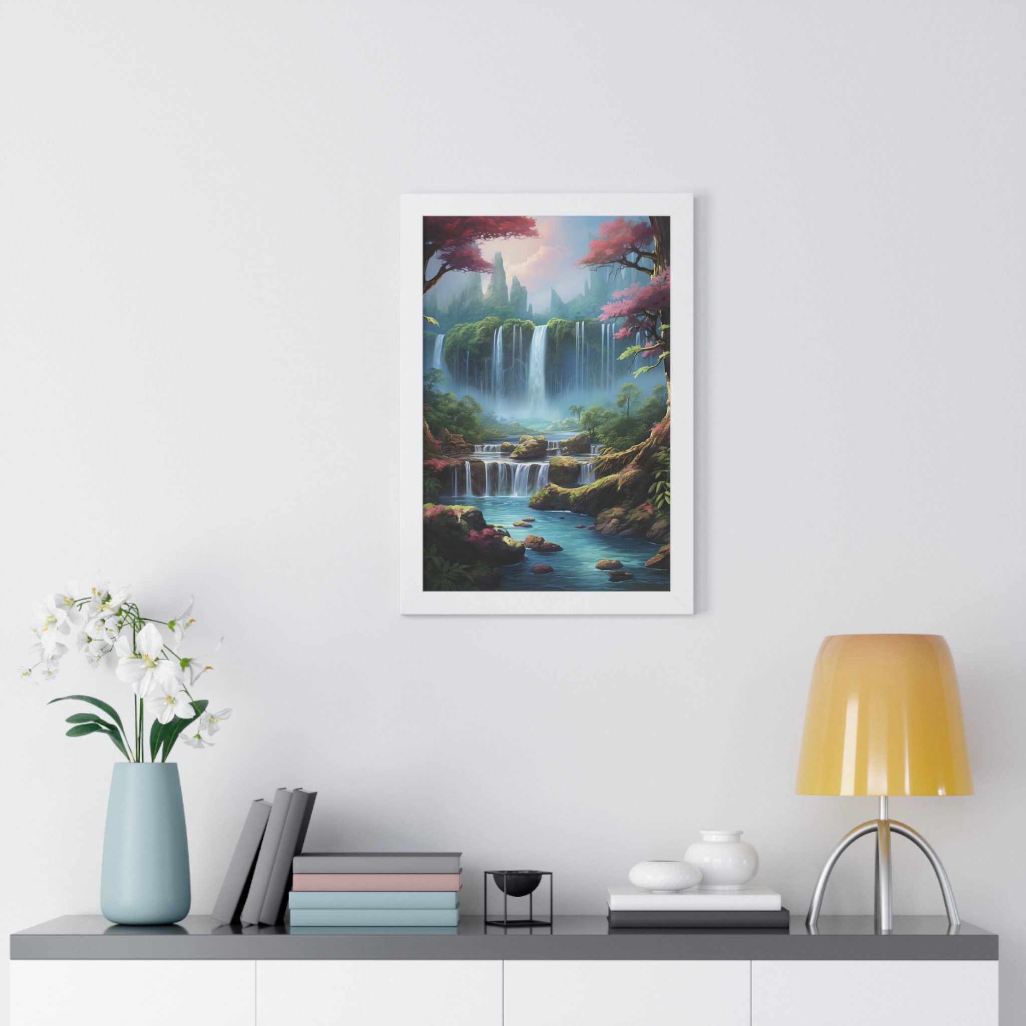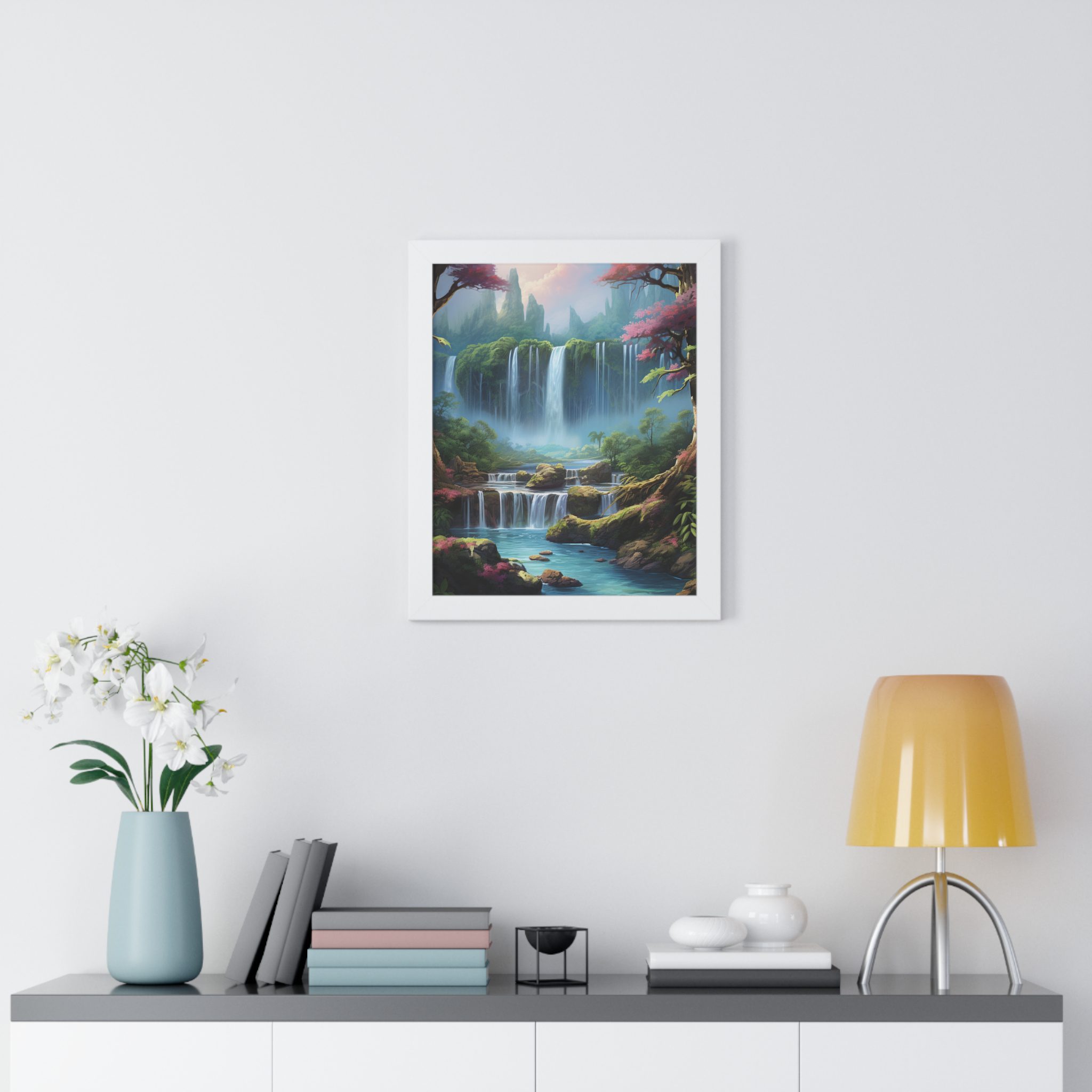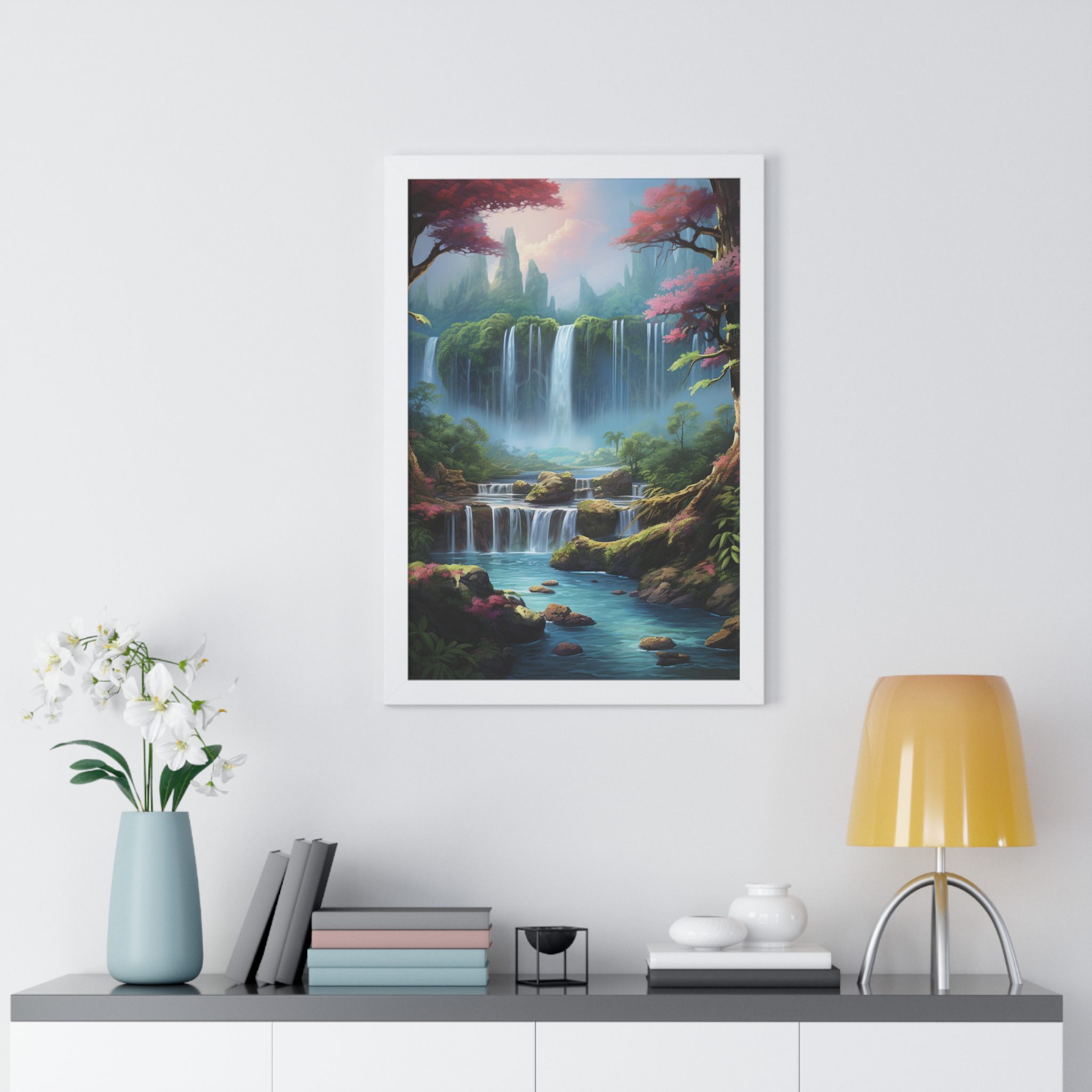 Enchanted Waterfall Surrounded By Vibrant Design, Securely framed in one of three colors (black, white, or walnut), these premium posters exhibit their varied contents through archive-worthy photo paper and ink. For easy hanging, there’s a backing hardware piece. The framing is made of MDF. Further ensuring durability, the bordering is low maintenance and resistant to swelling and warping.