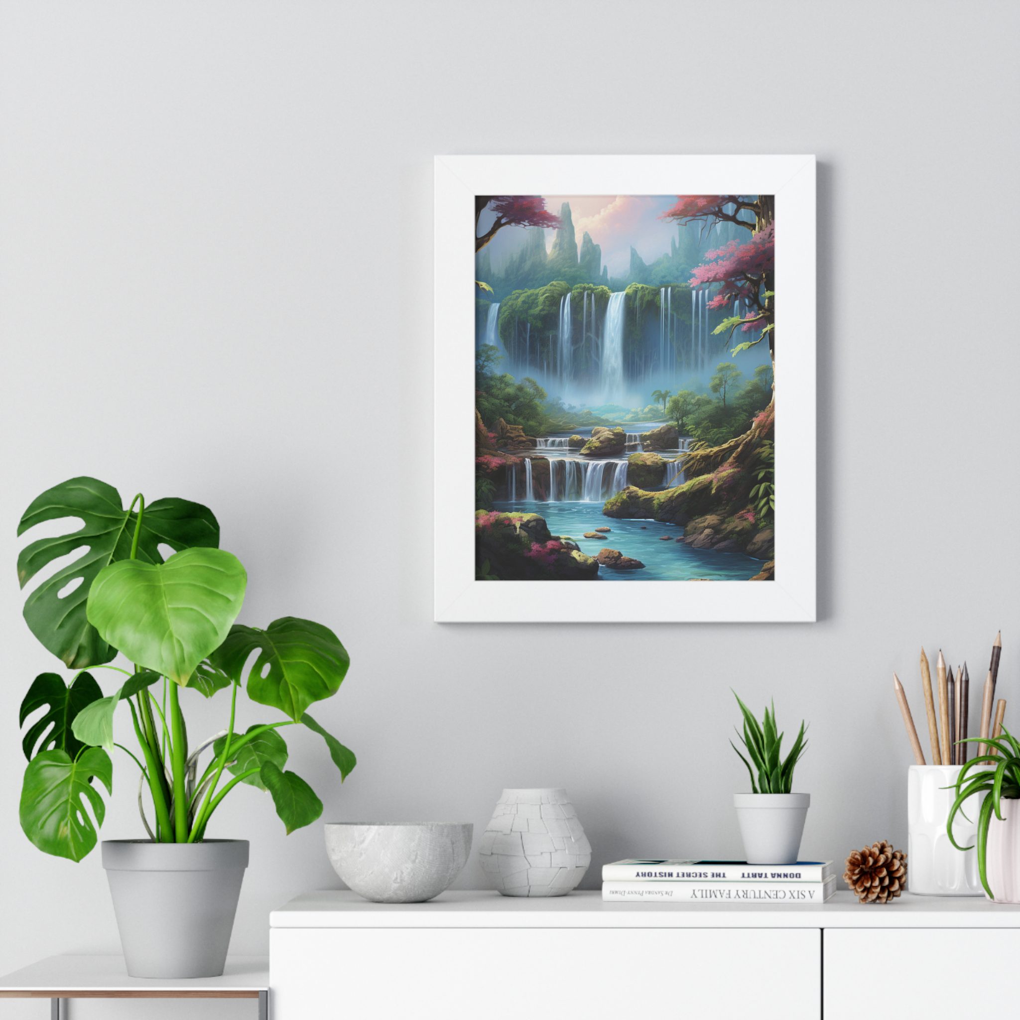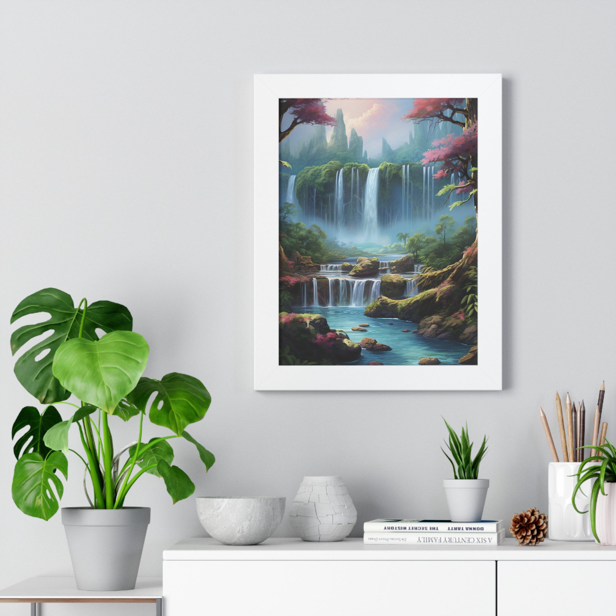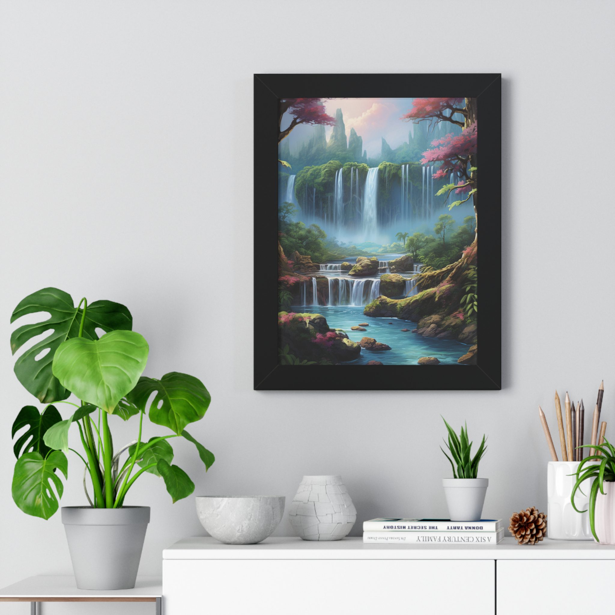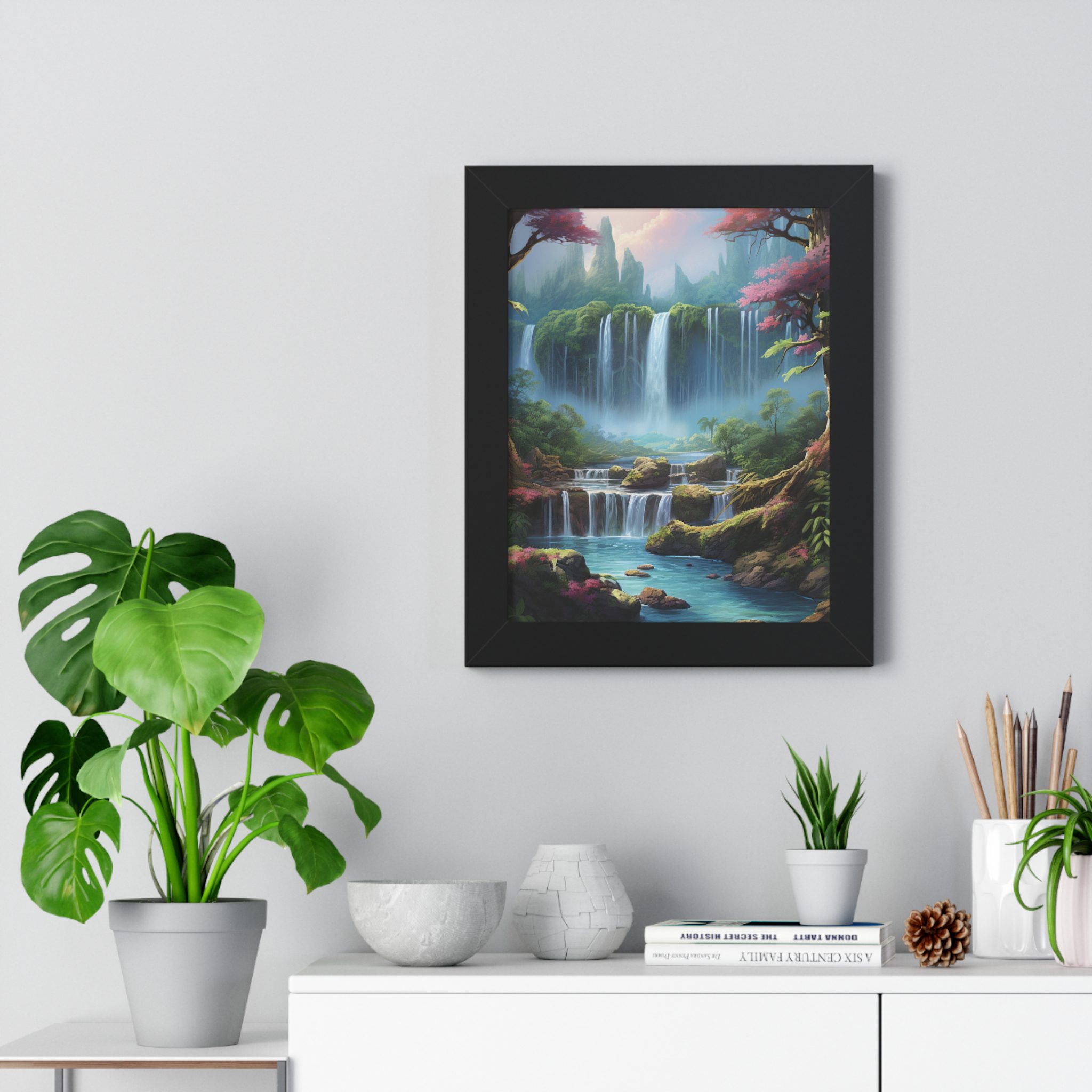 Enchanted Waterfall Surrounded By Vibrant Design, Securely framed in one of three colors (black, white, or walnut), these premium posters exhibit their varied contents through archive-worthy photo paper and ink. For easy hanging, there’s a backing hardware piece. The framing is made of MDF. Further ensuring durability, the bordering is low maintenance and resistant to swelling and warping.