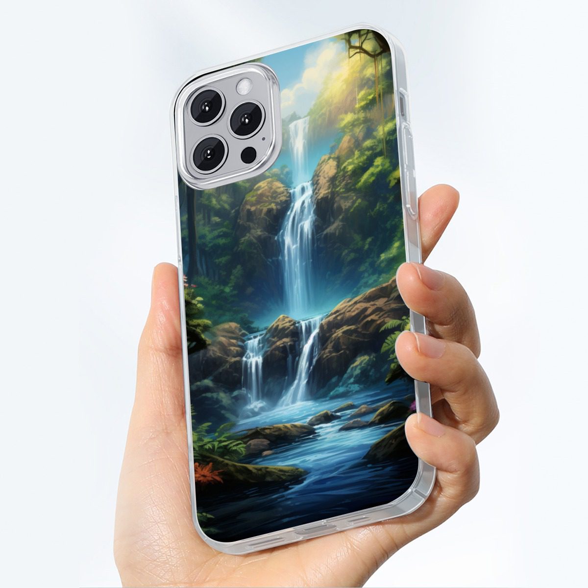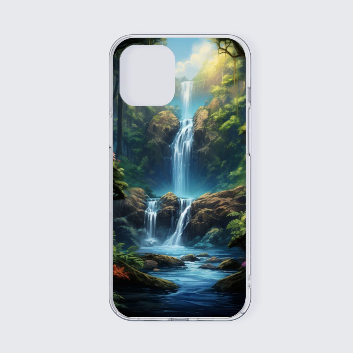 Enchanted Waterfall Surrounded By Vibrant Flowers Design,