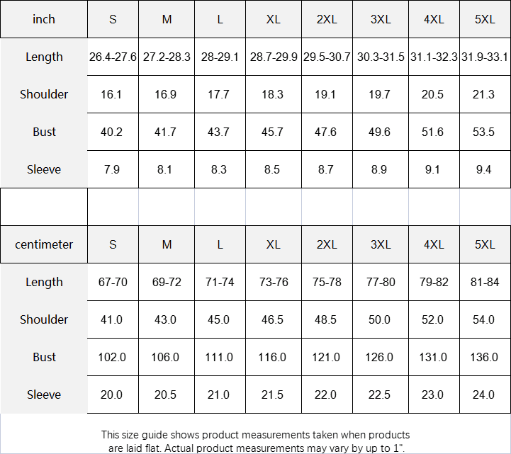 | inch | S | M | L | XL | 2XL | 3XL | 4XL | 5XL |