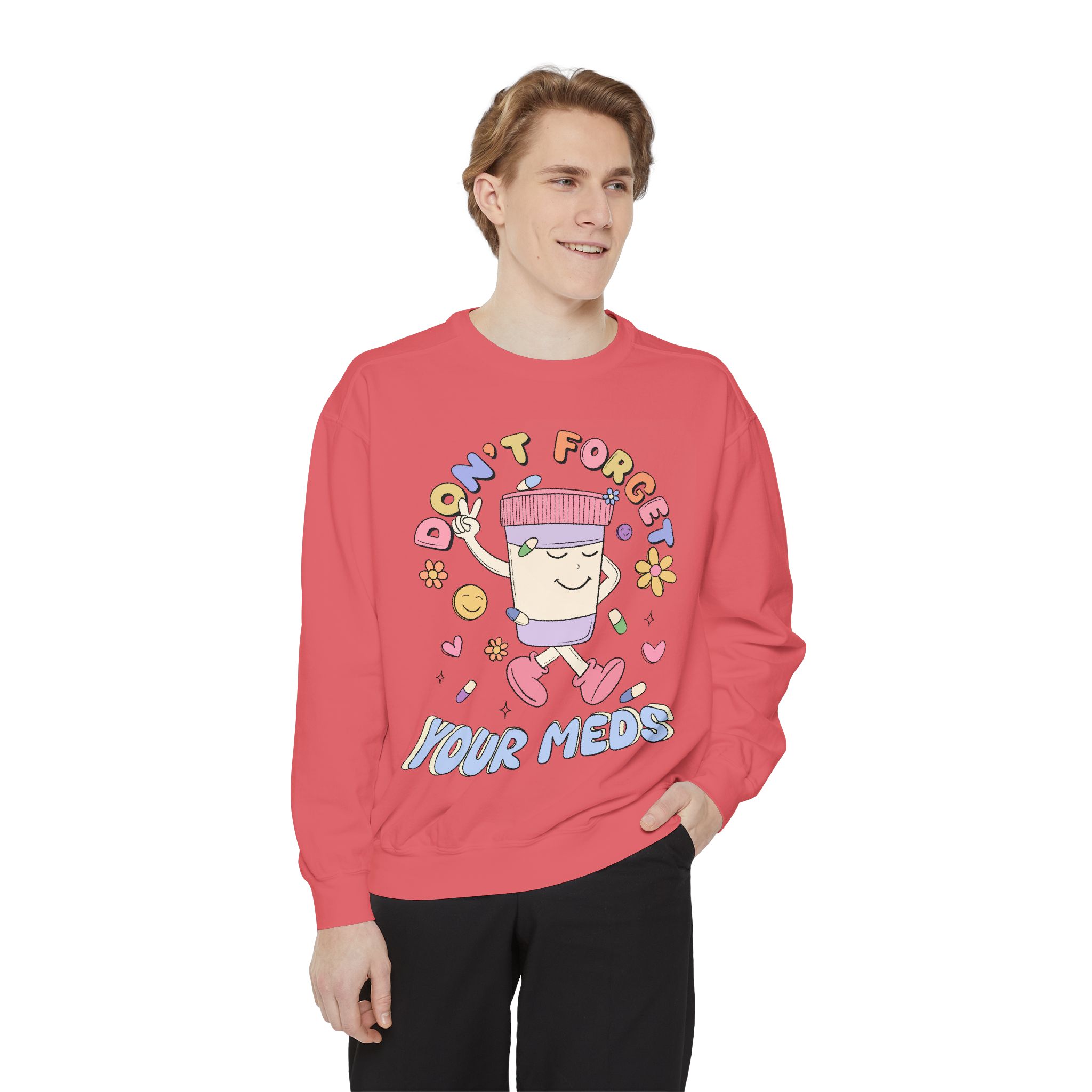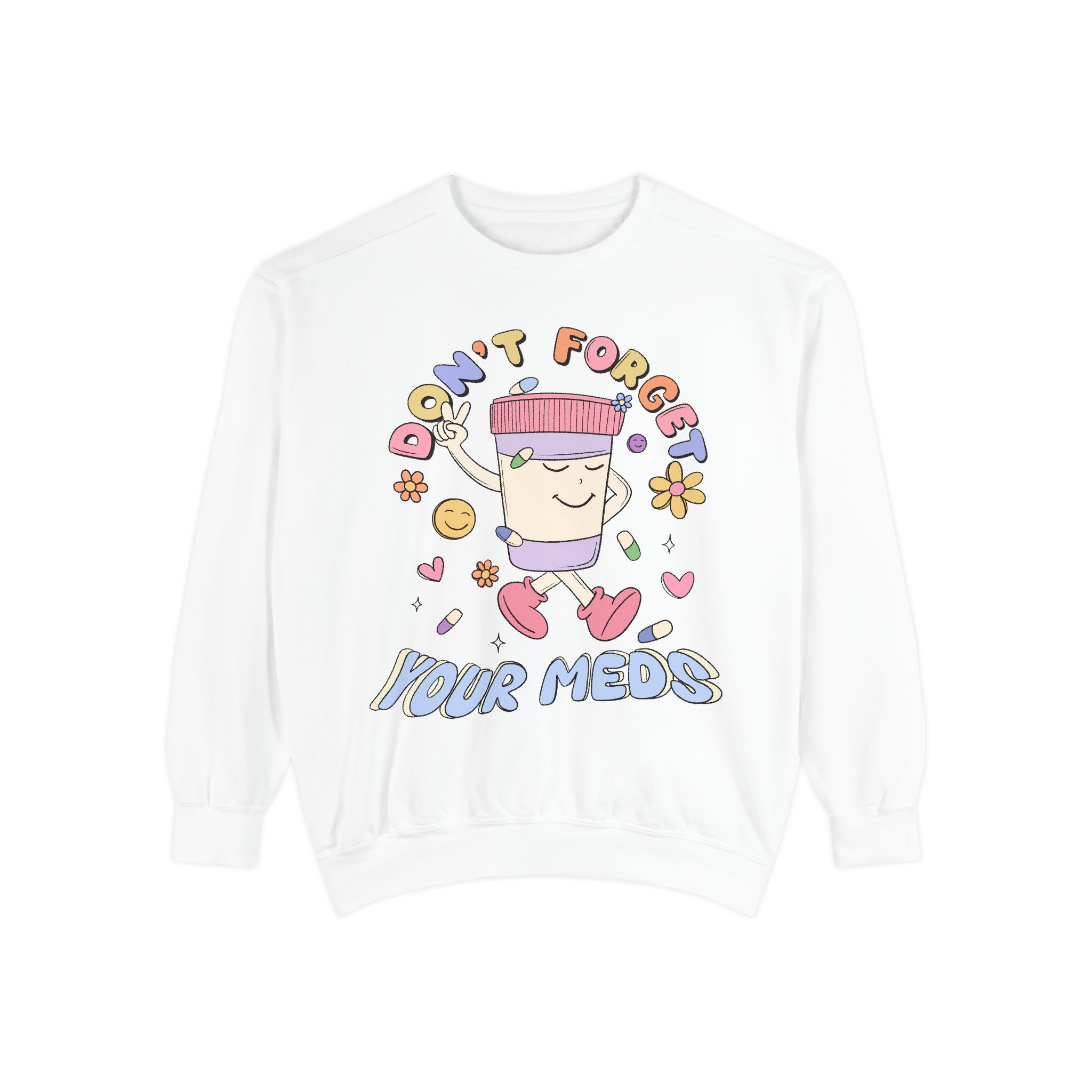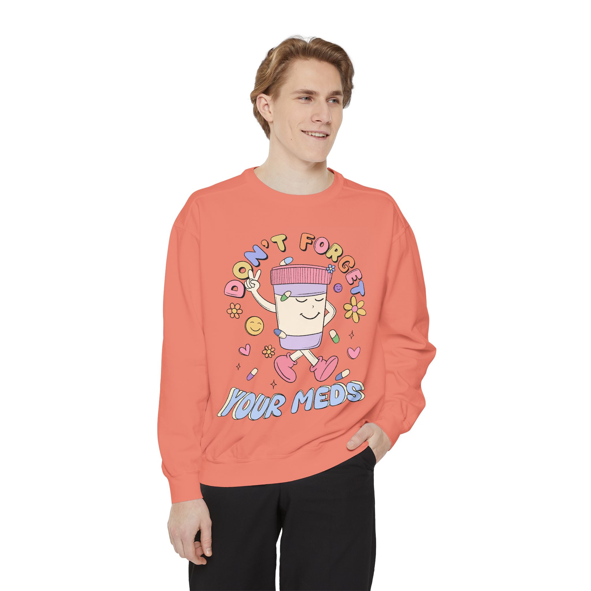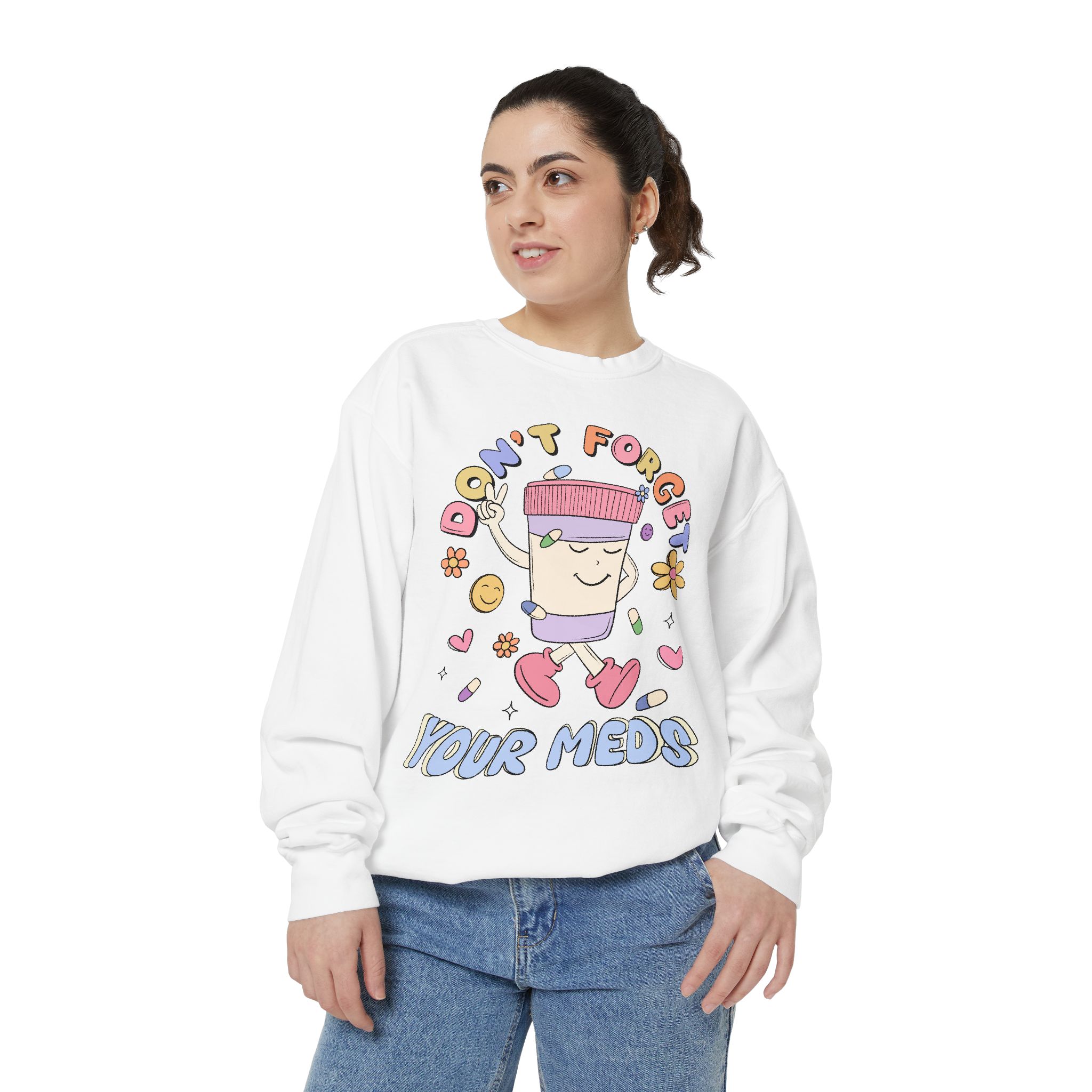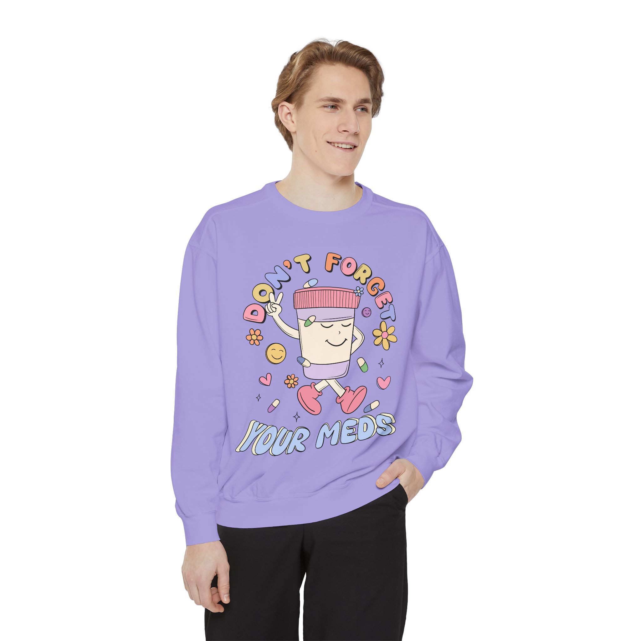 This Don’t Forget Your Meds Cartonic design sweatshirt is perfect for those who value comfort and style. Made from a soft and luxurious blend of cotton and polyester, it offers a relaxed fit and features ribbed collar, cuffs and bottom hem for a well-fitted look. Ideal for anyone looking for a unique and cozy sweatshirt to wear during casual outings or lounging at home. Great for gifting on birthdays or as a thoughtful reminder to take medication.
