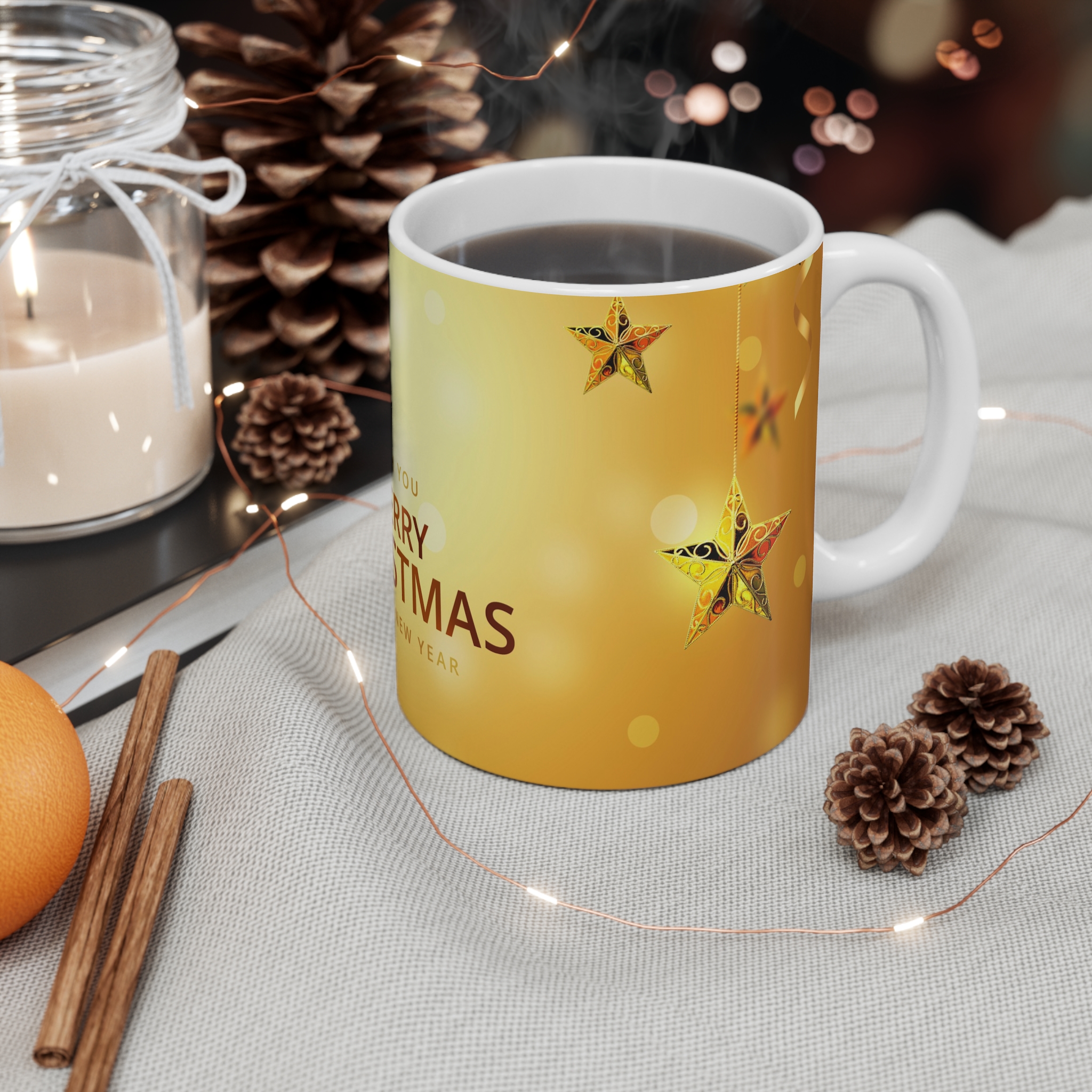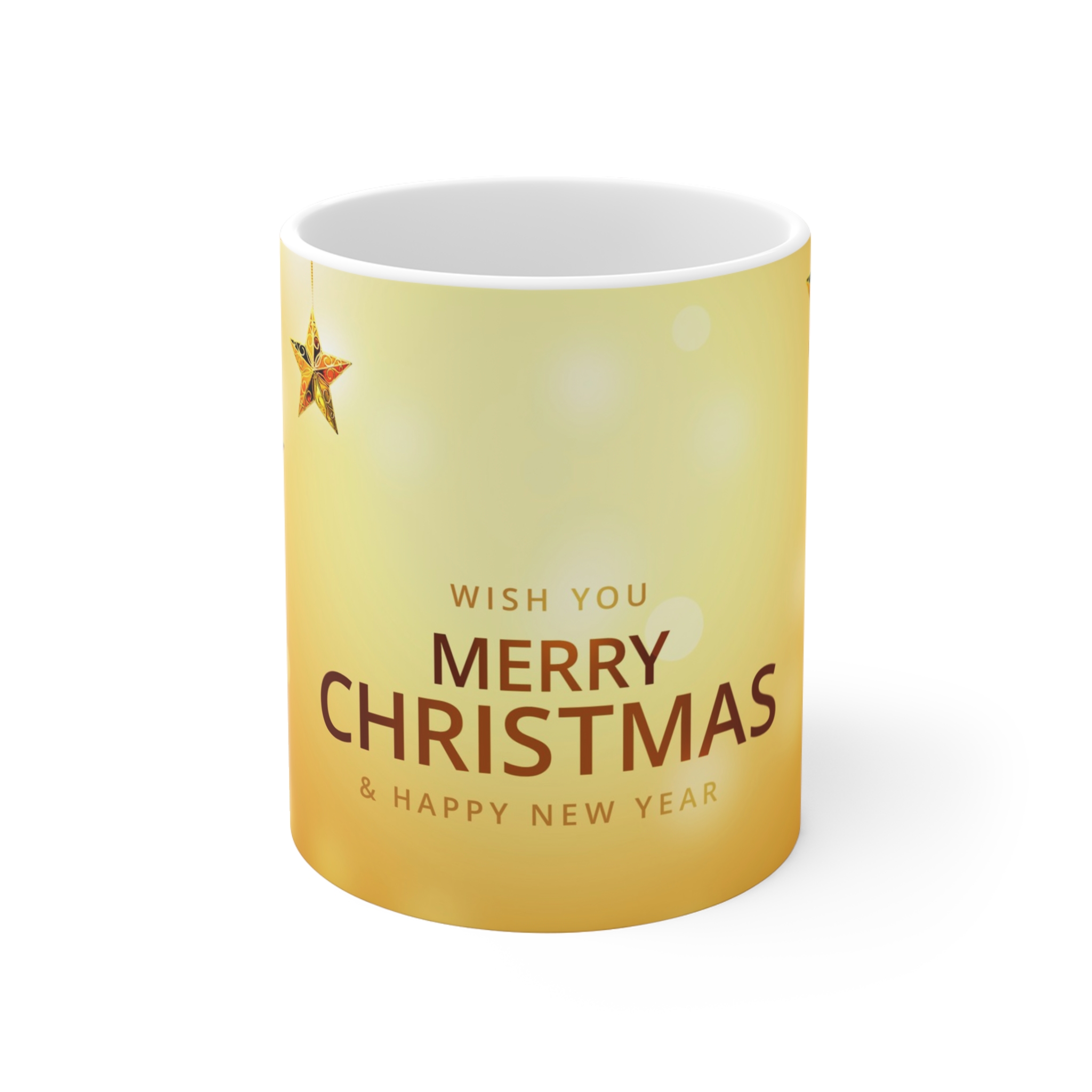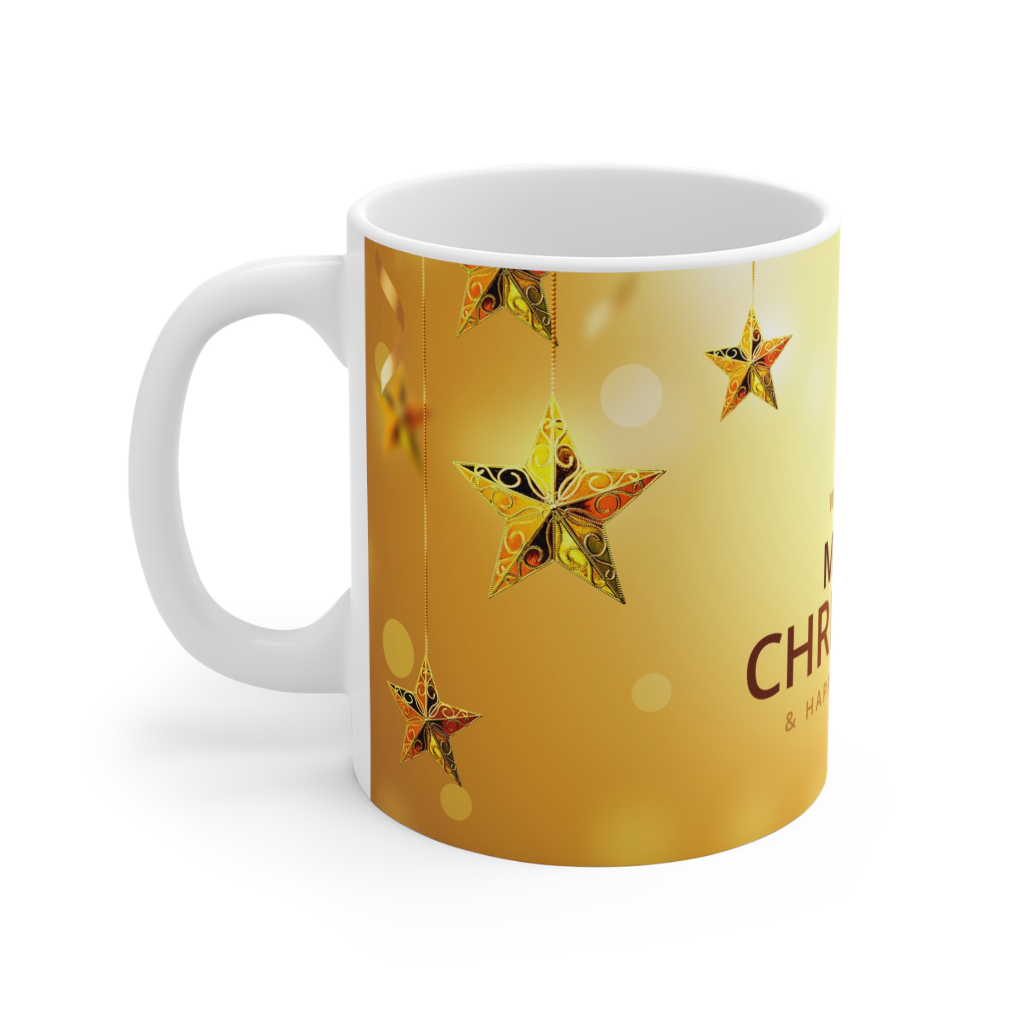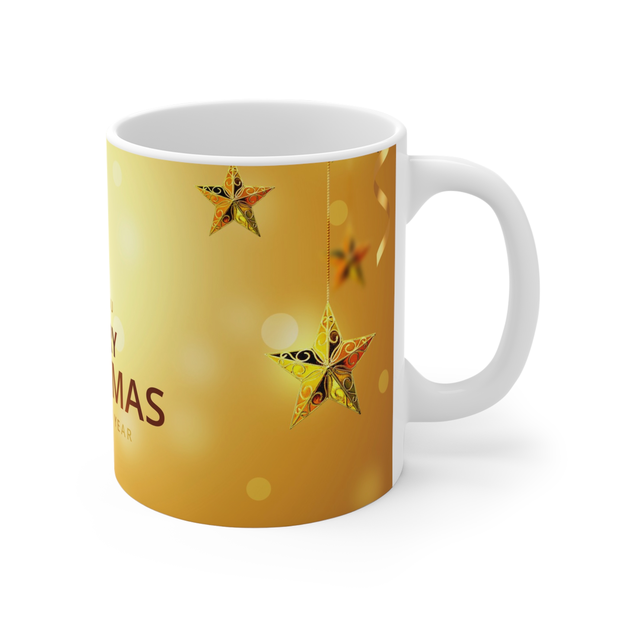Bring the magic of the holiday season straight to your home with this Golden Star Christmas Mug 11oz. Its warm golden background, hanging festive stars, and elegant Merry Christmas & Happy New Year message make every sip feel special.