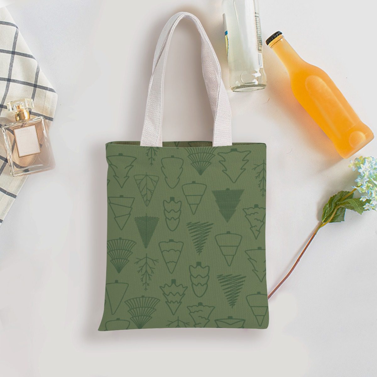 This canvas bag features a hand-drawn Christmas pattern inspired by winter trees and festive forests. The soft green tones create a peaceful holiday vibe.