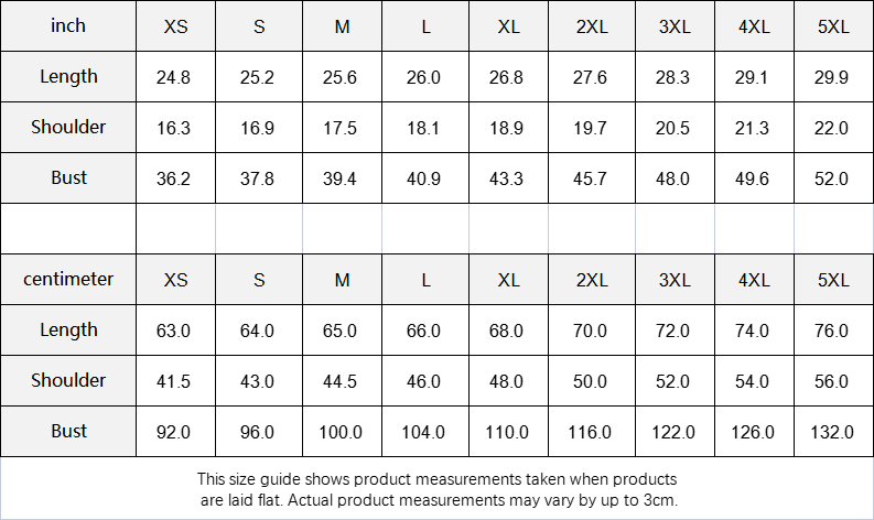 | Centimeter | XS | S | M | L | XL | 2XL | 3XL | 4XL | 5XL |