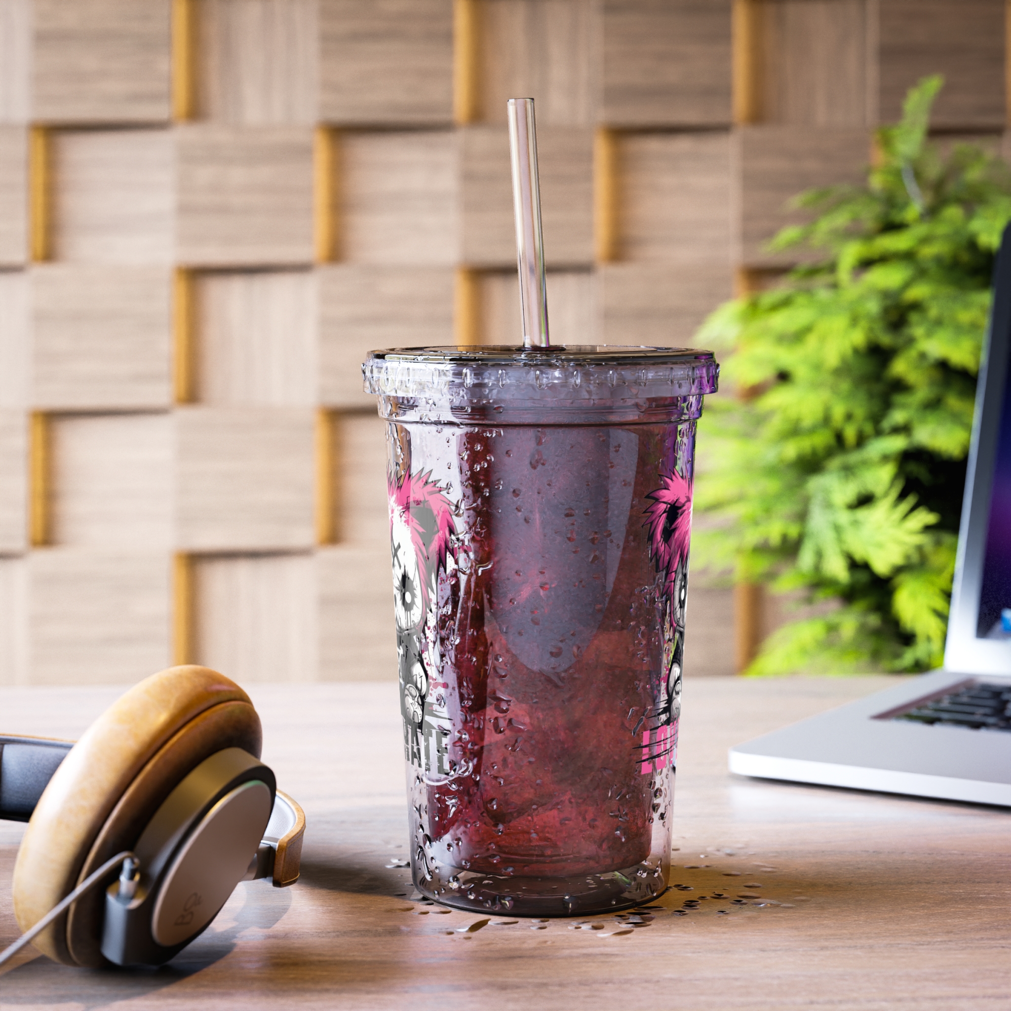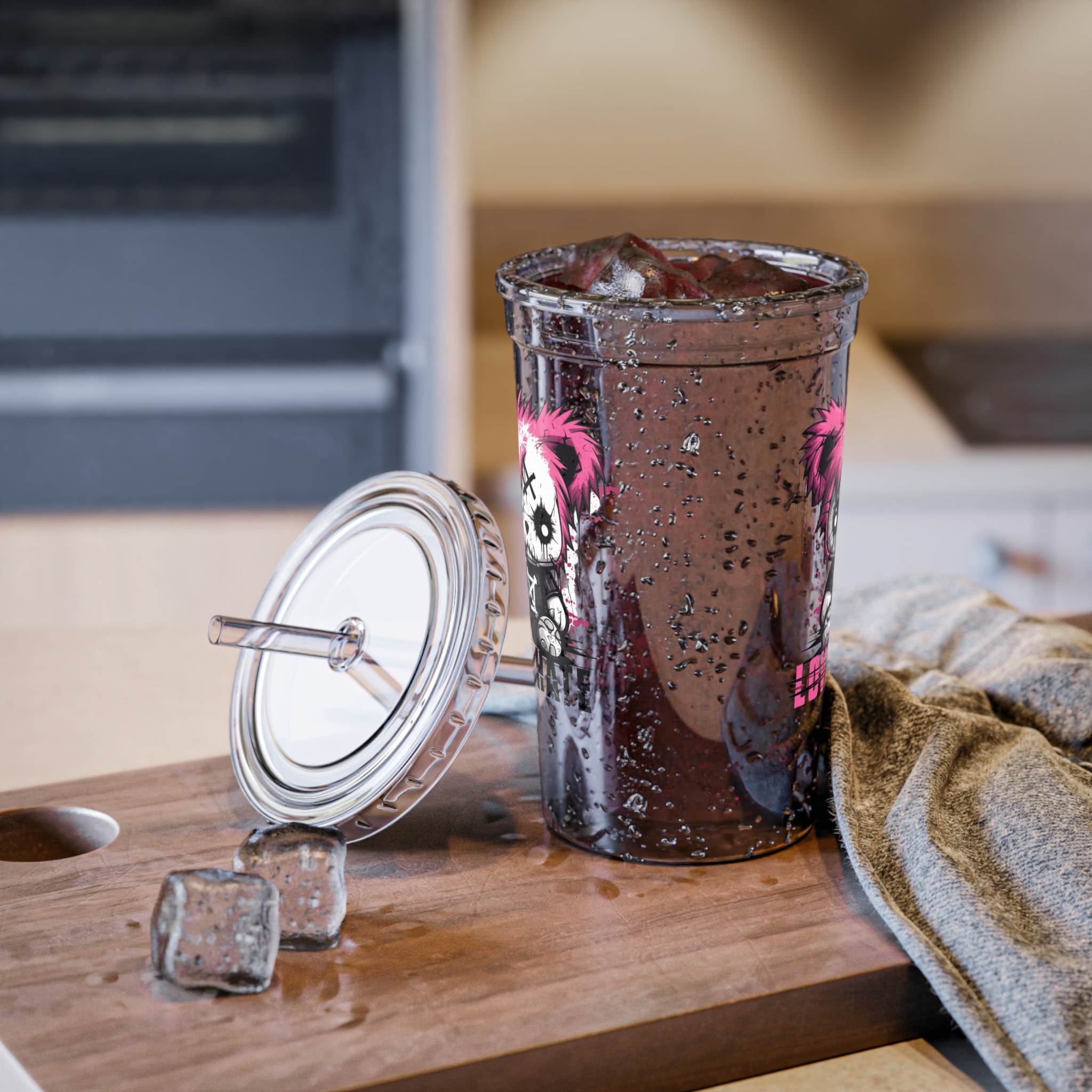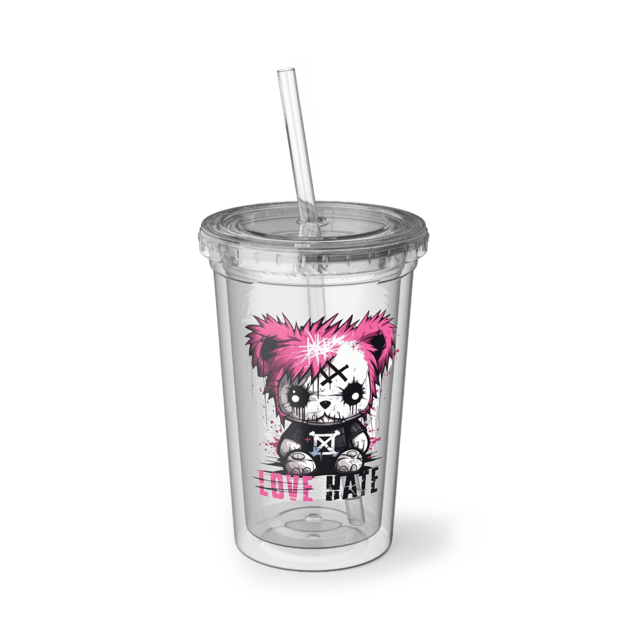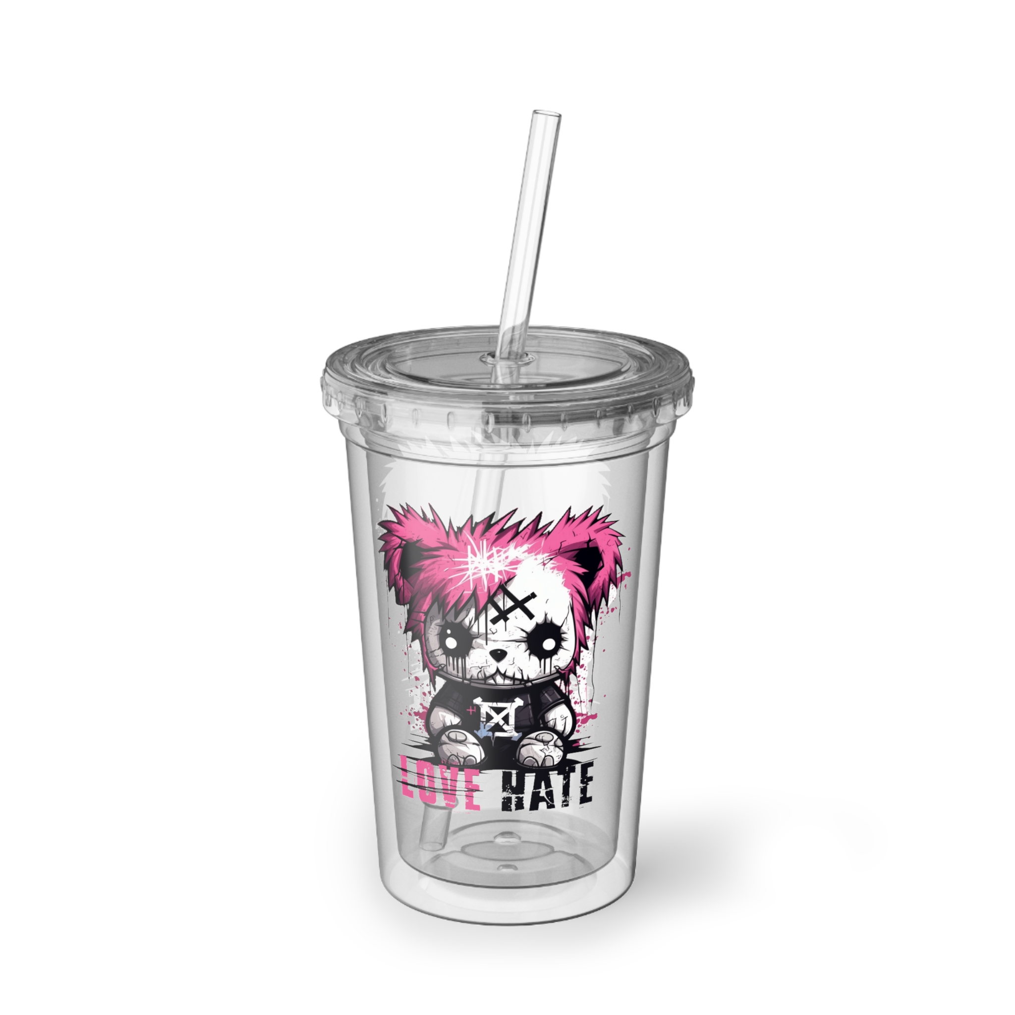 This Love Hate Injured Bear Cartoon design, Made for grabbing beverages on the go, this double-wall insulated acrylic cup will keep cold drinks cold for 24 hours and hot for 12 hours. Decorate them to the rim with picture-perfect quality artwork or photographs. The cup, the plastic lid, and the straw are all BPA-free.