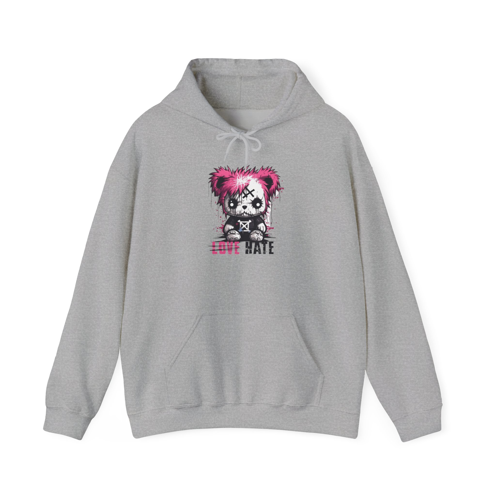 This Love Hate Injured Bear Cartoon design, This unisex heavy blend hooded sweatshirt is relaxation itself. Made with a thick blend of cotton and polyester, it feels plush, soft and warm, a perfect choice for any cold day. In the front, the spacious kangaroo pocket adds daily practicality while the hood’s drawstring is the same color as the base sweater for extra style points.
