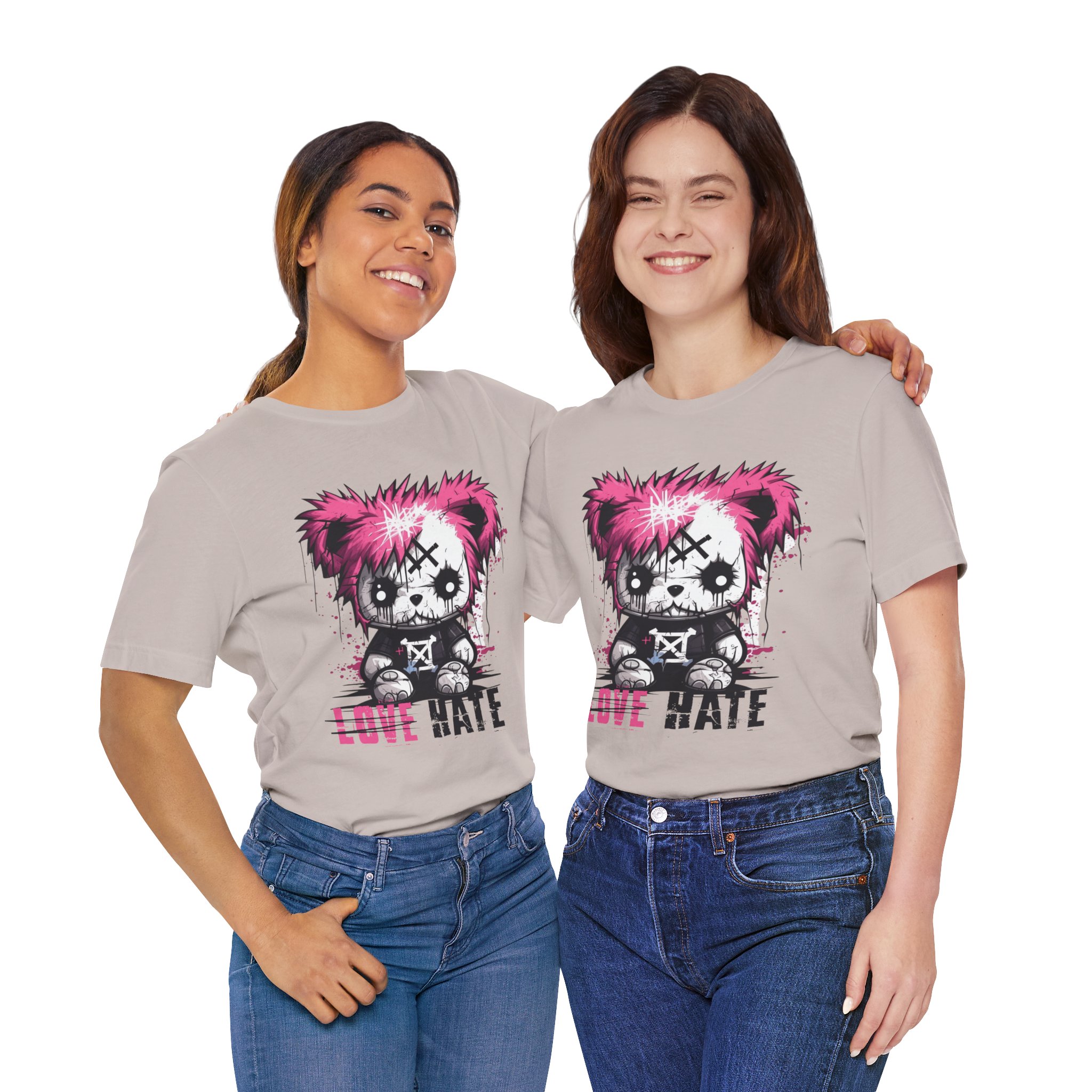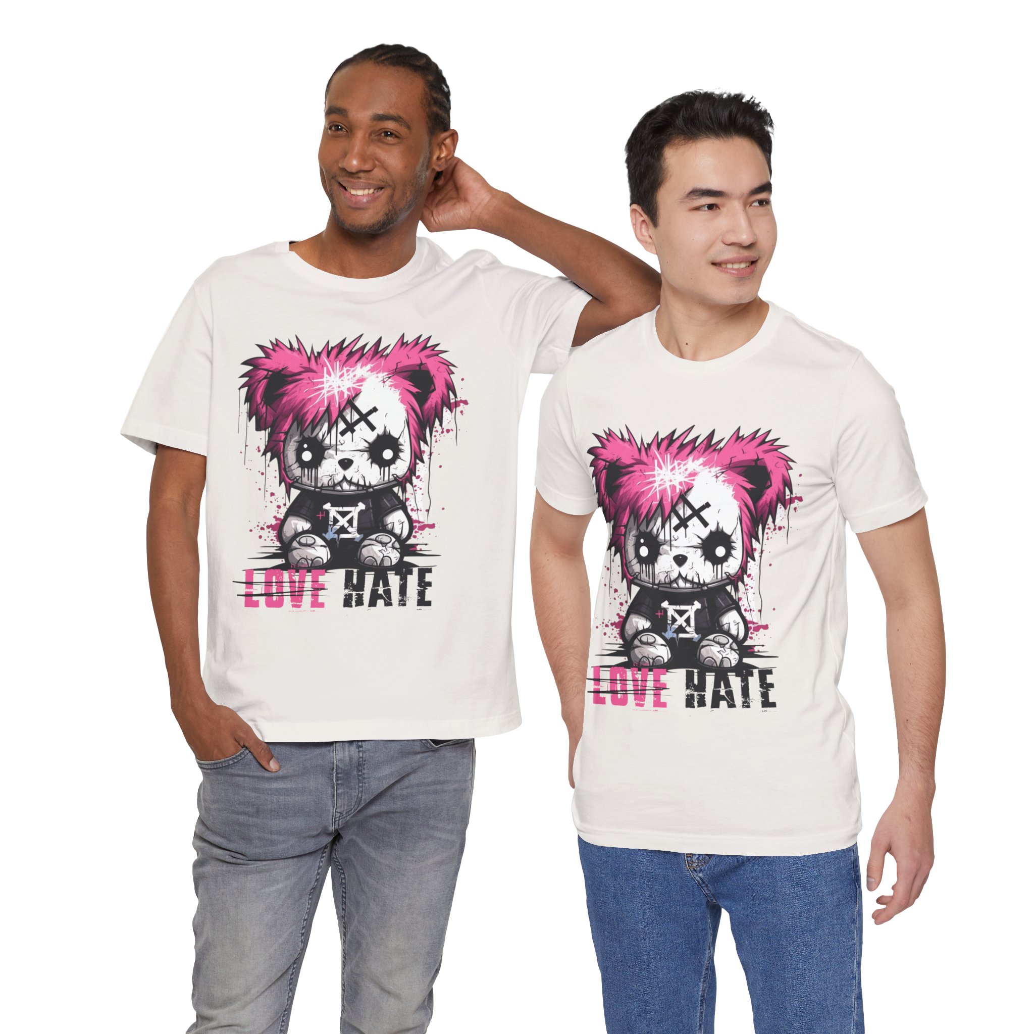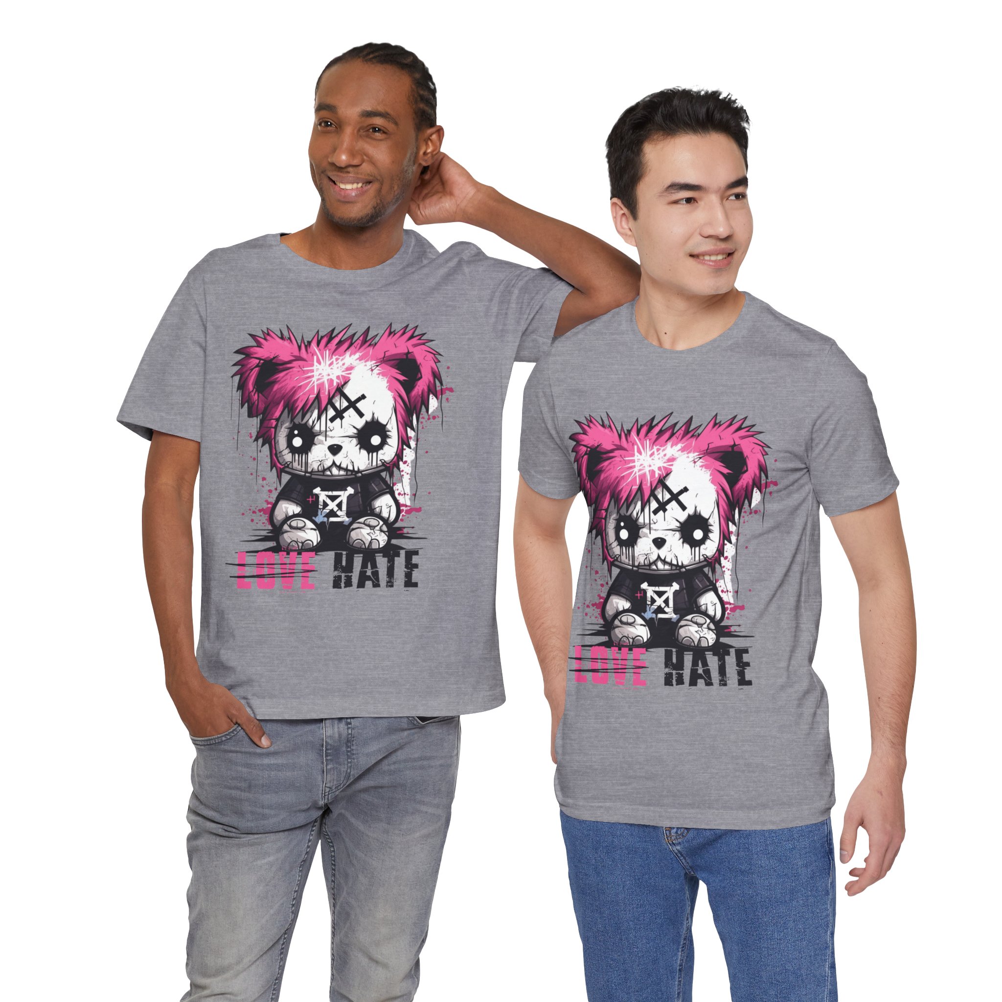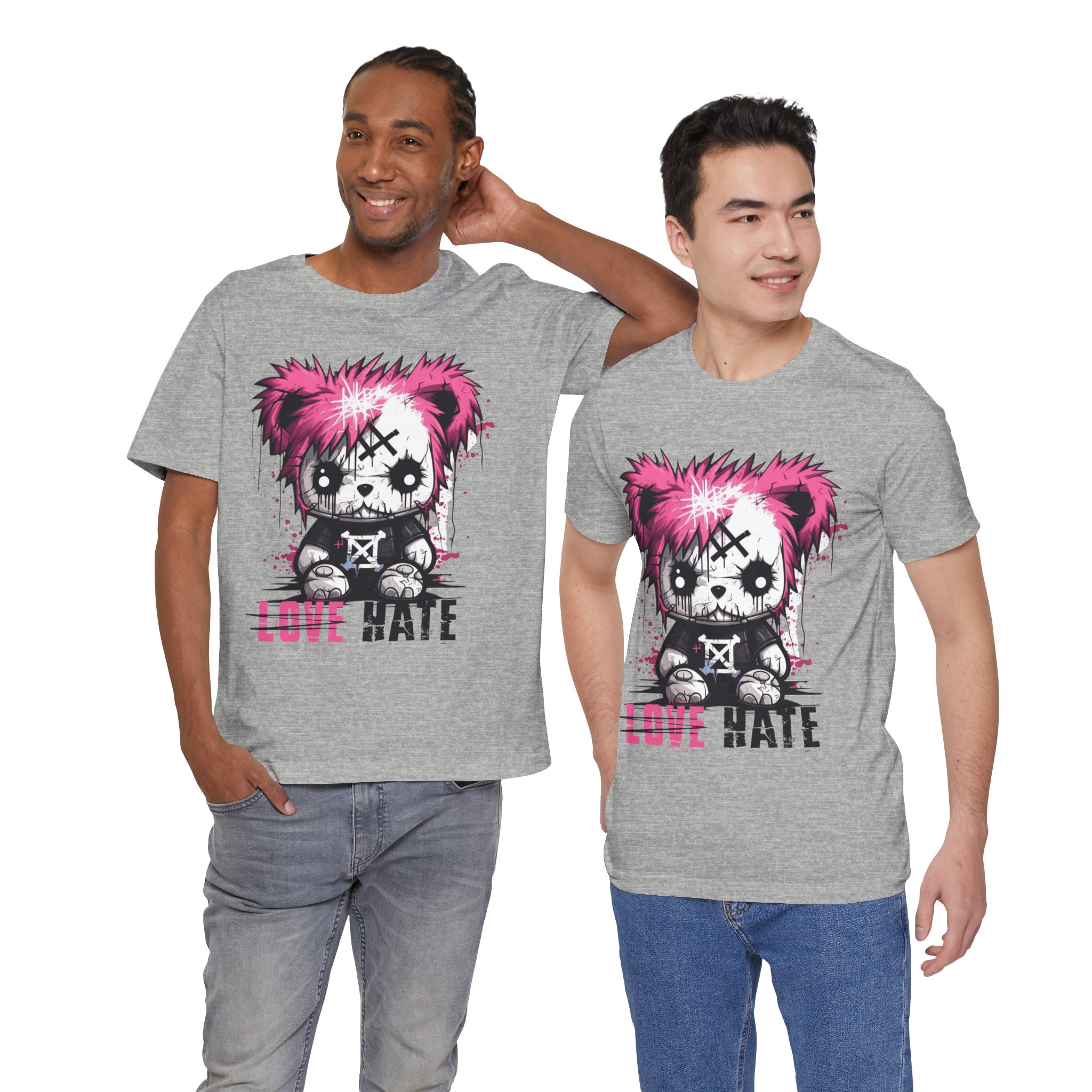This Love Hate Injured Bear Cartoon design, This classic unisex jersey short sleeve tee fits like a well-loved favorite. Soft cotton and quality print make users fall in love with it over and over again. These t-shirts have-ribbed knit collars to bolster shaping. The shoulders are tapered for a better fit over time. Dual side seams hold the garment’s shape for longer.