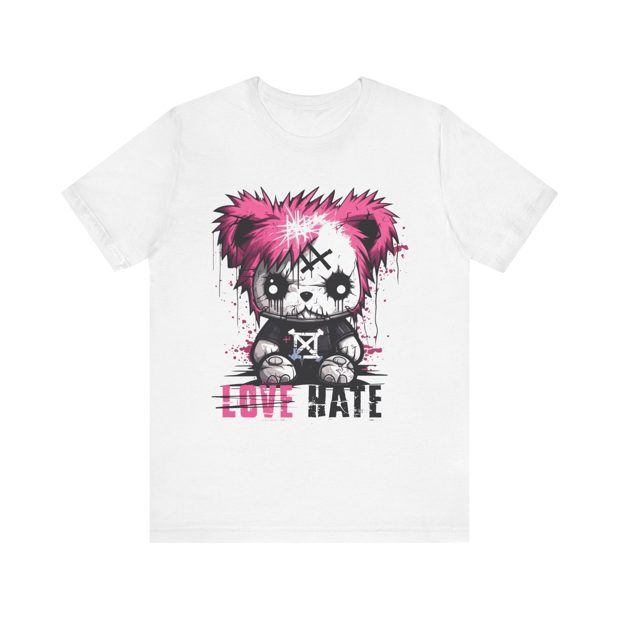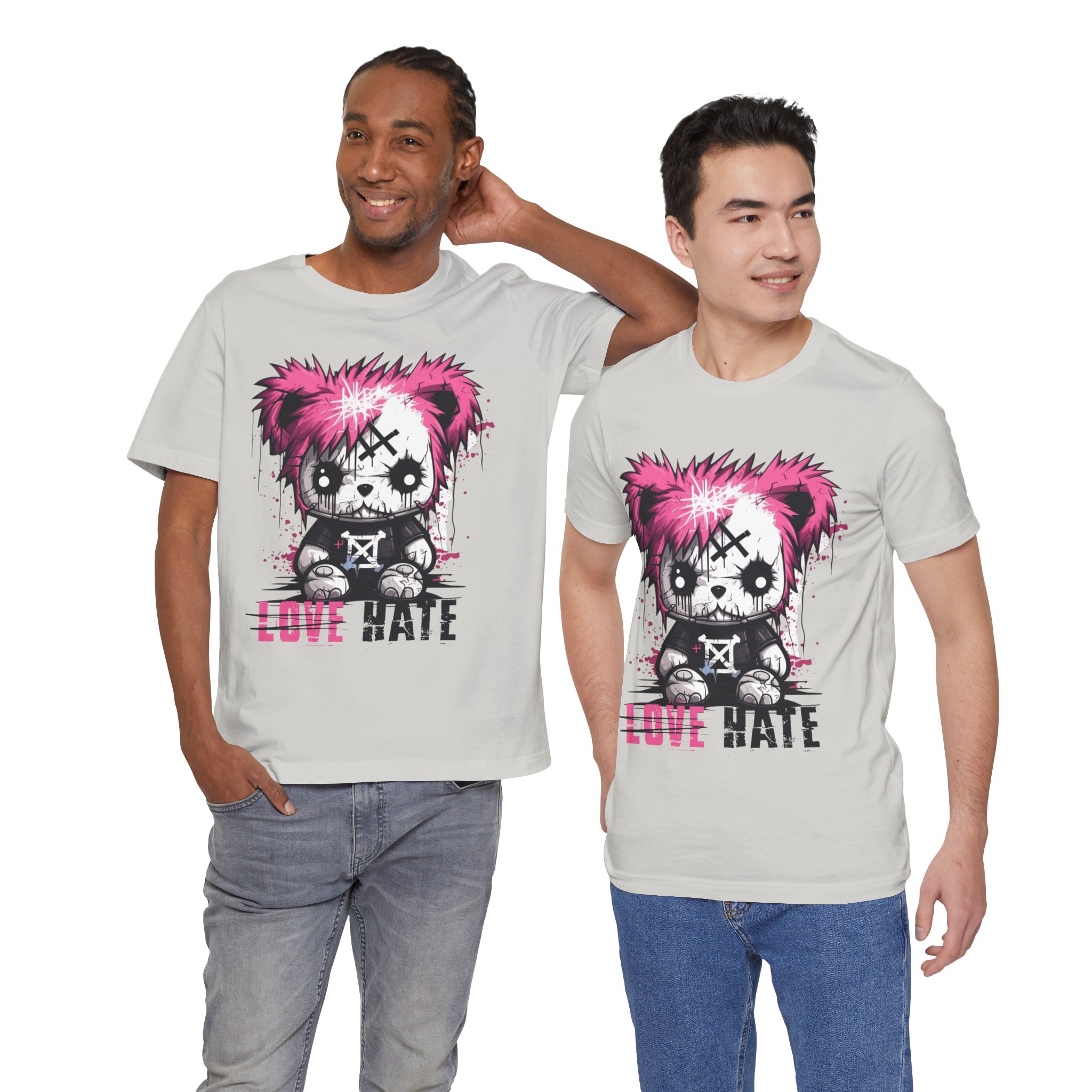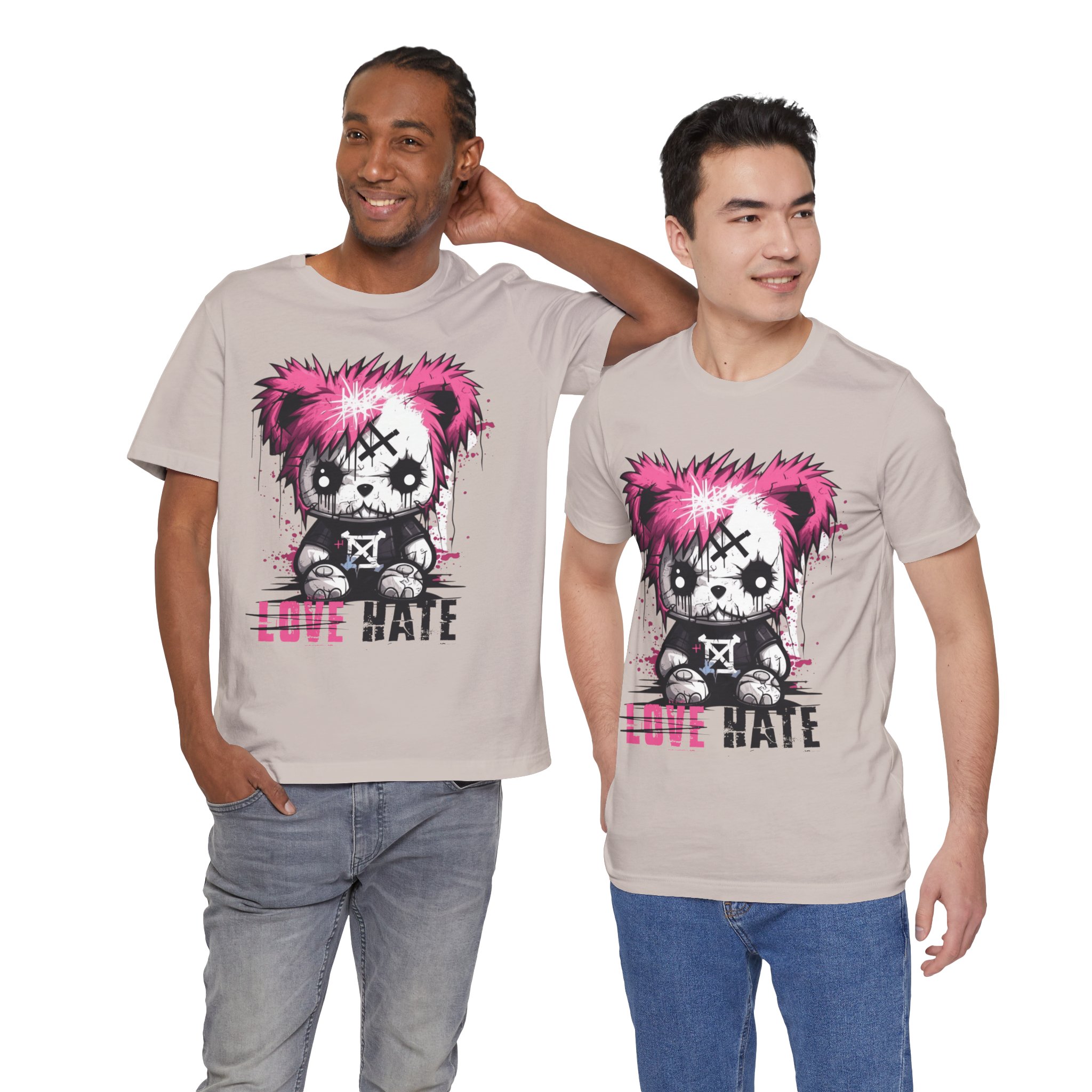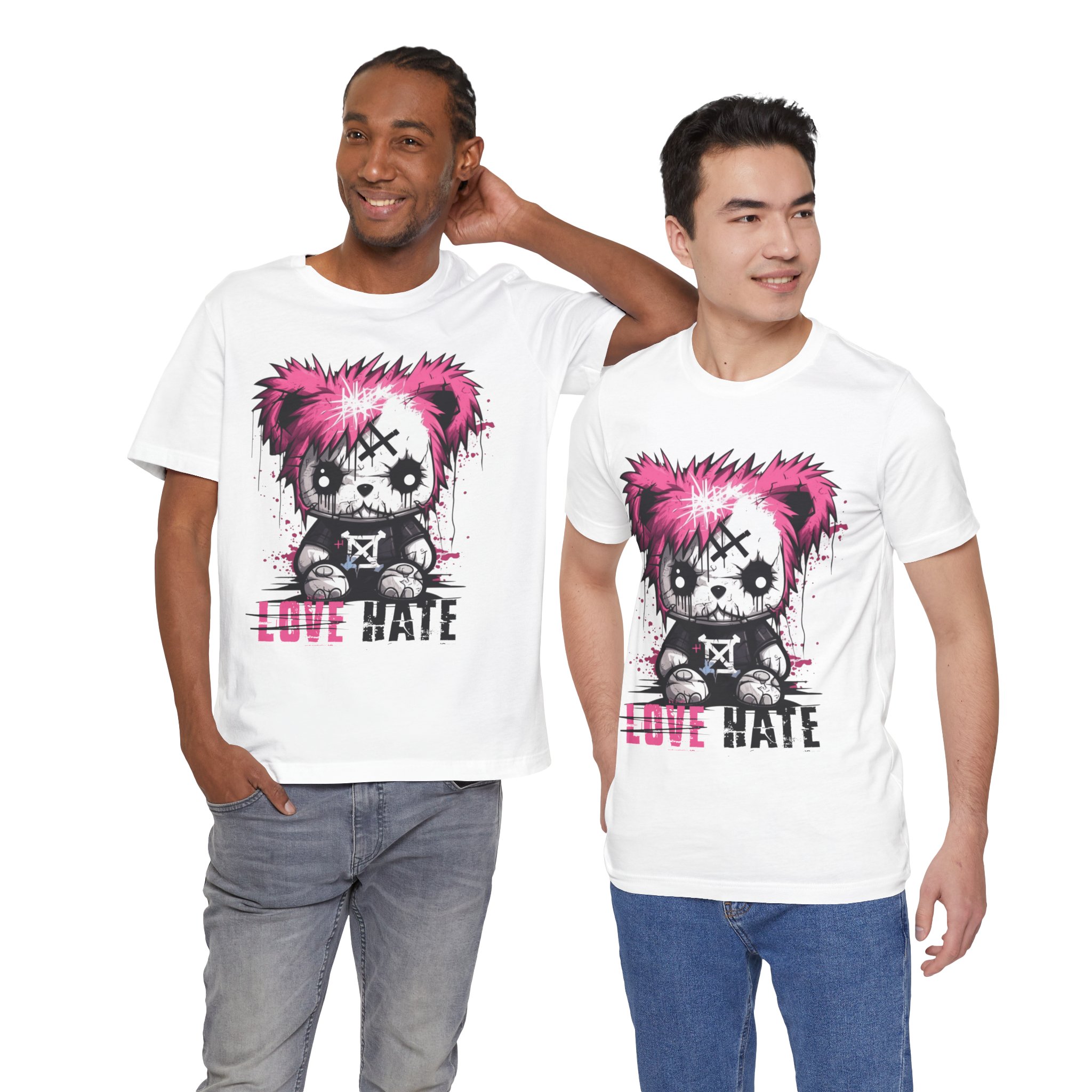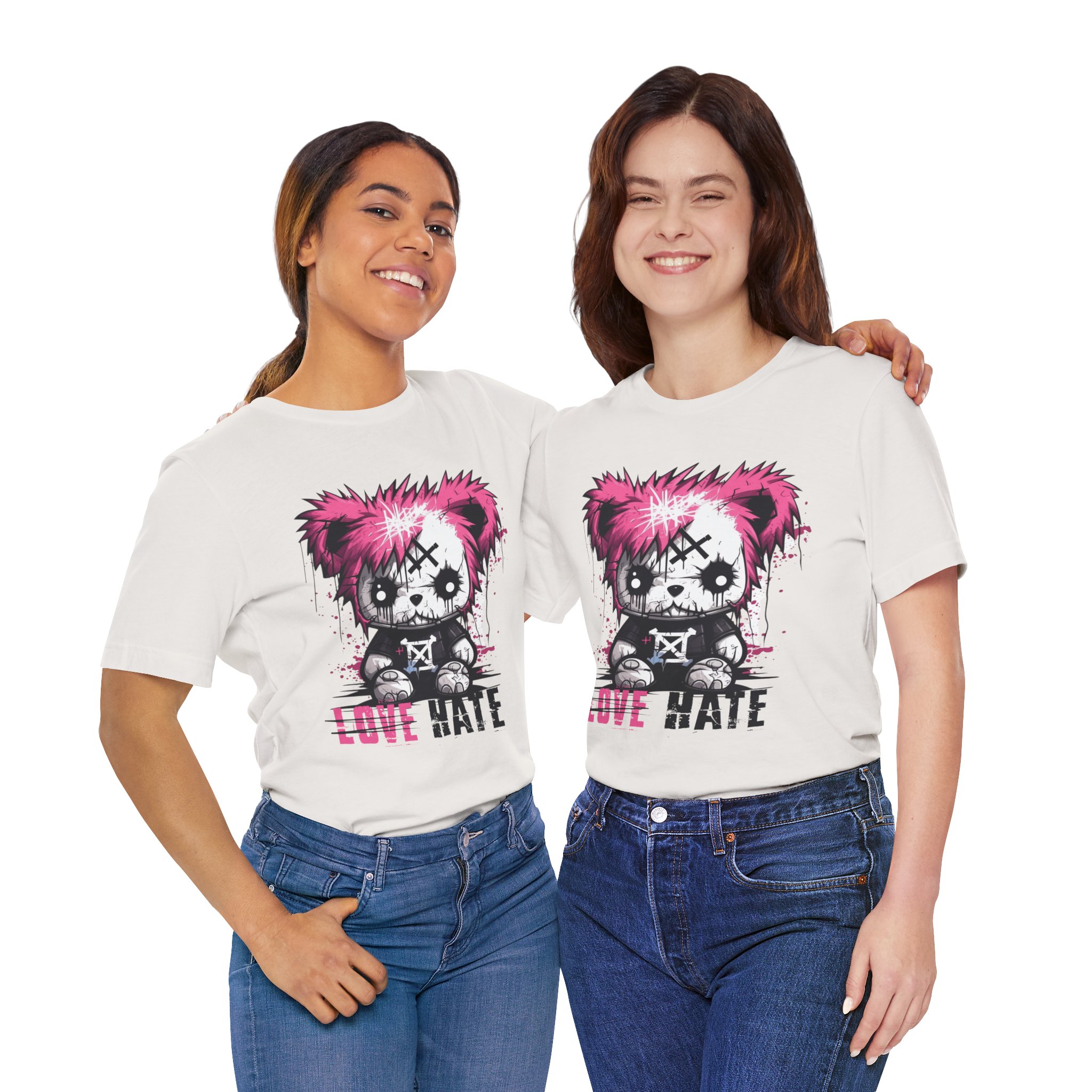 This Love Hate Injured Bear Cartoon design, This classic unisex jersey short sleeve tee fits like a well-loved favorite. Soft cotton and quality print make users fall in love with it over and over again. These t-shirts have-ribbed knit collars to bolster shaping. The shoulders are tapered for a better fit over time. Dual side seams hold the garment’s shape for longer.