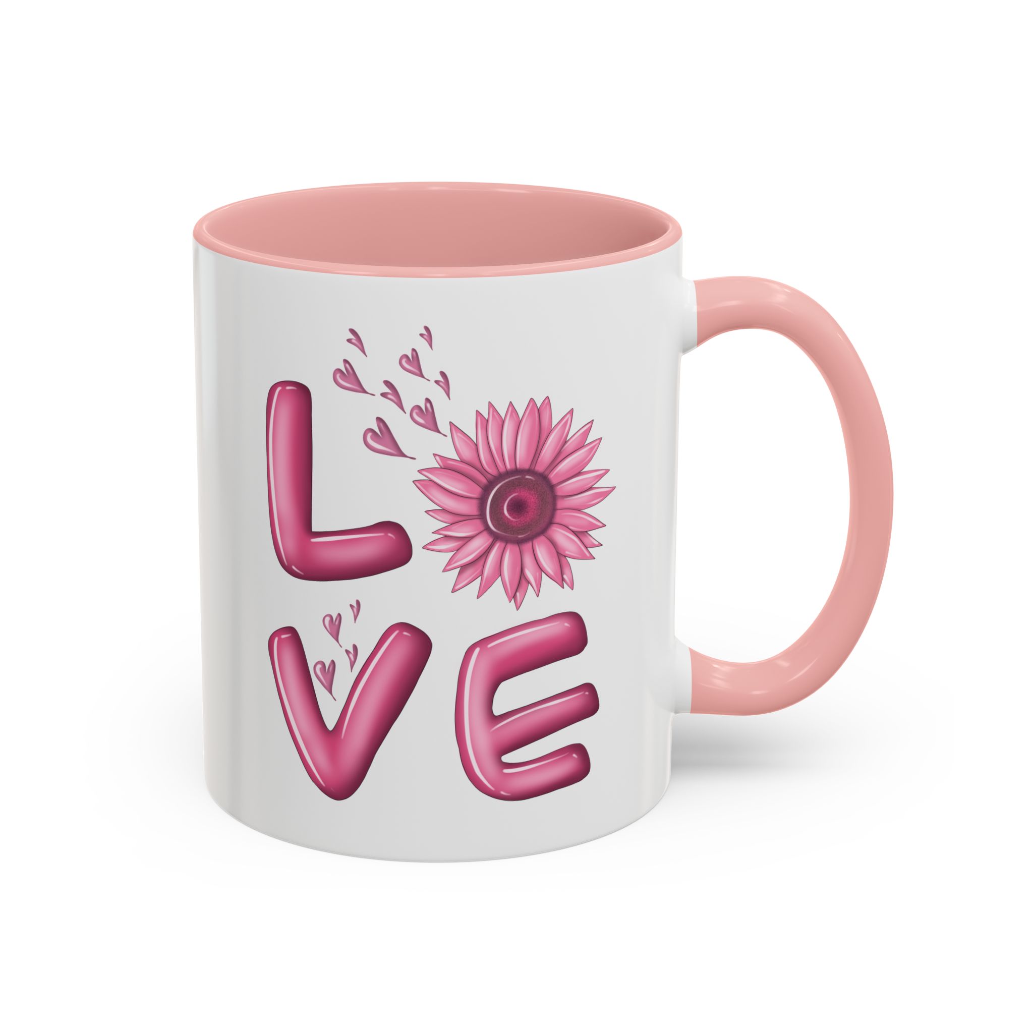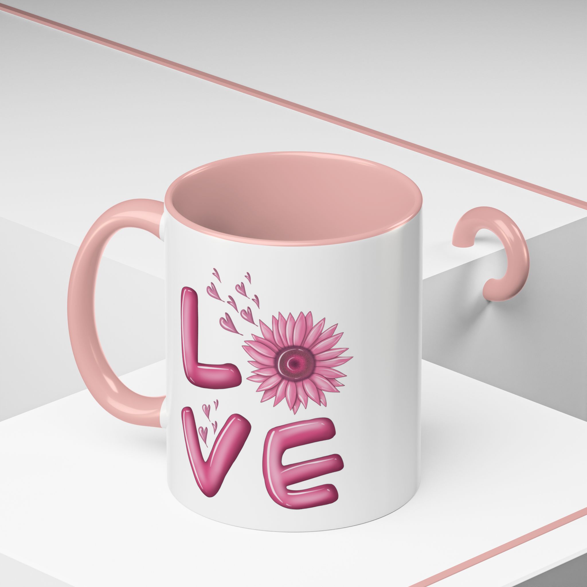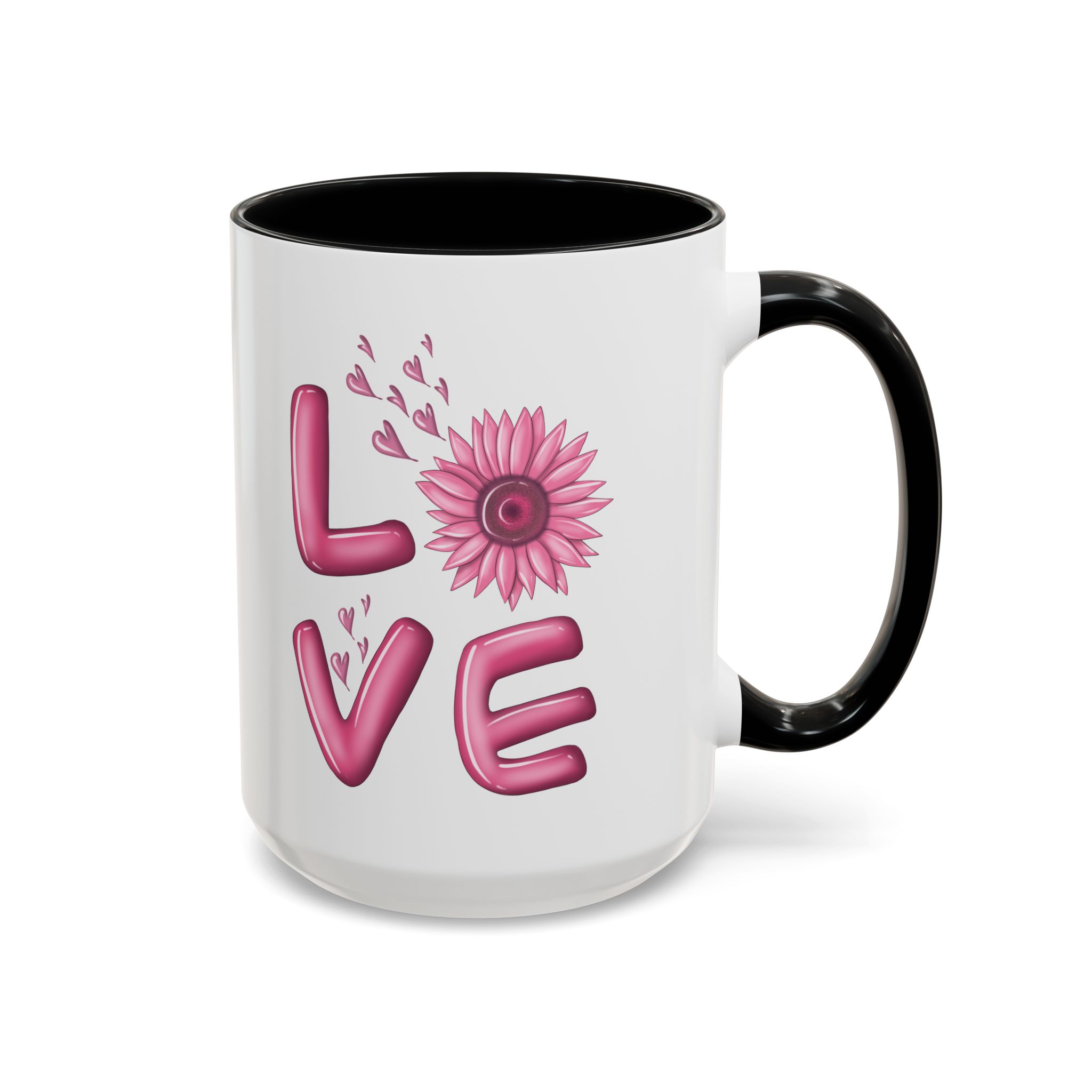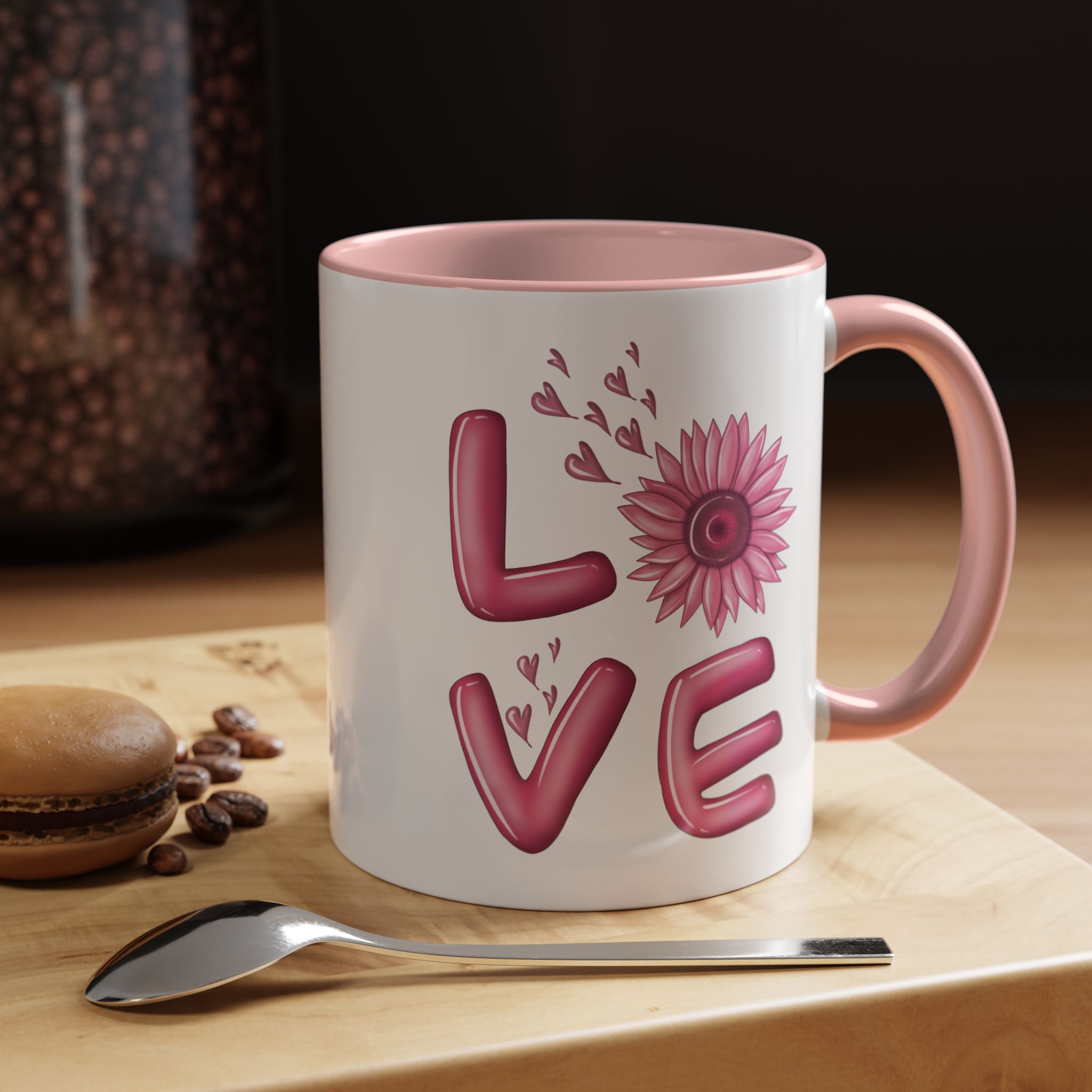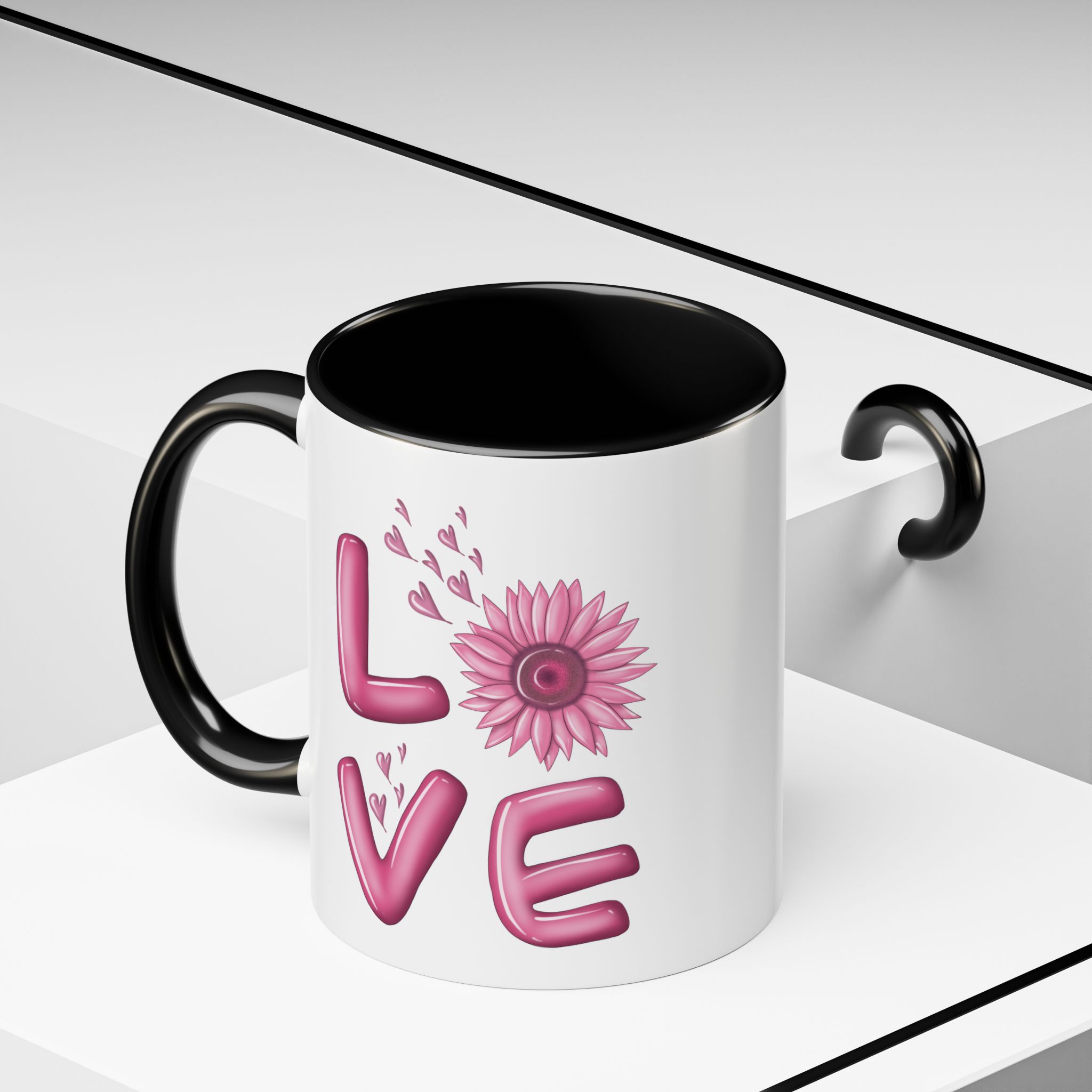 Love, Pink Letters with Flower Design, Meet your next favorite morning companion, the accented ceramic mug. This mug brings the perfect blend of style and functionality to elevate your coffee or tea ritual. Available in two generous sizes, 11oz (0.33 l) and 15oz (0.44 l), this mug offers ample space for your favorite brew. Made with white ceramic and sporting a sleek glossy finish with eye-catching contrast, this mug is a bliss both to use and to look at. The ergonomic C-shaped handle provides a comfortable grip, while the lead and BPA-free construction guarantee peace of mind with every sip.