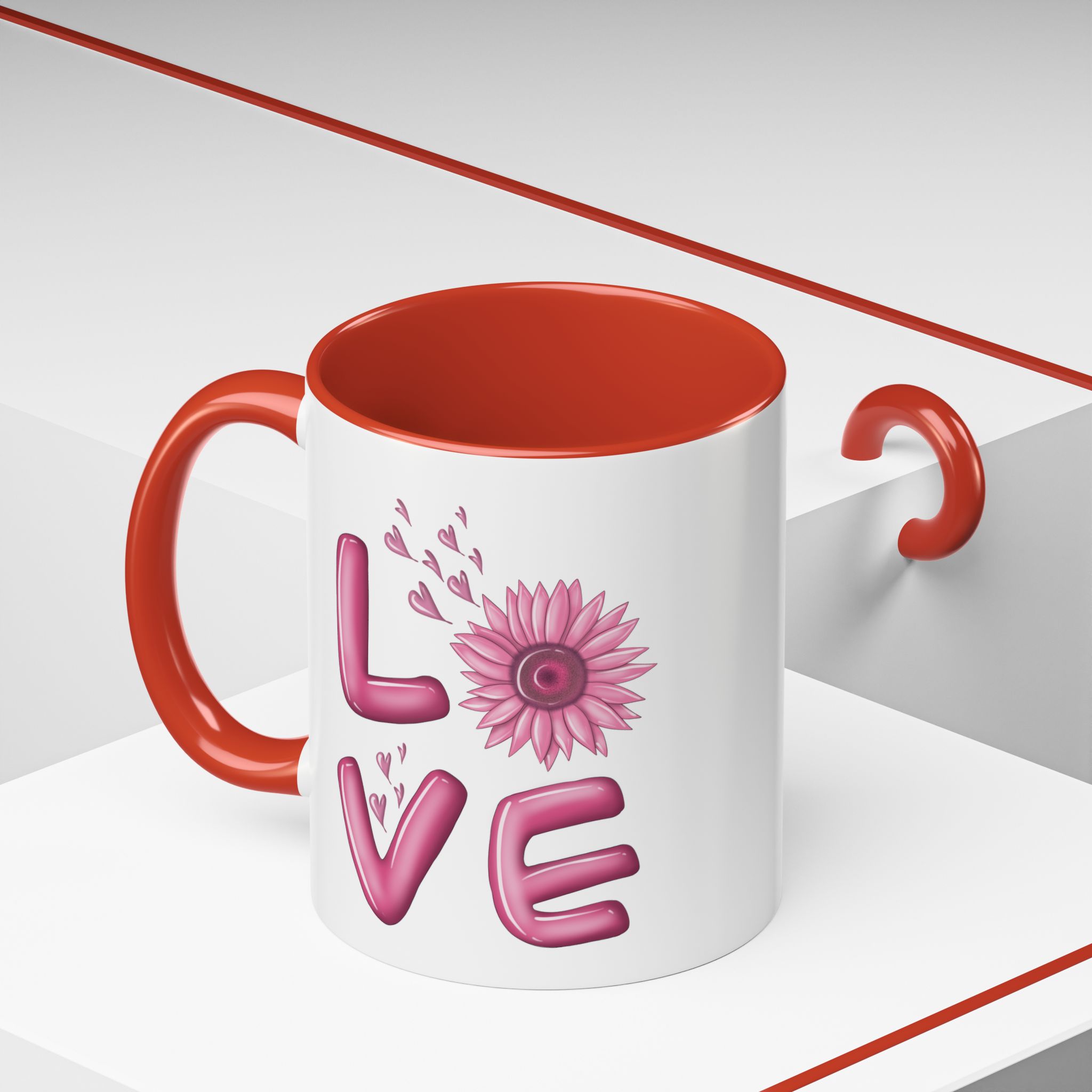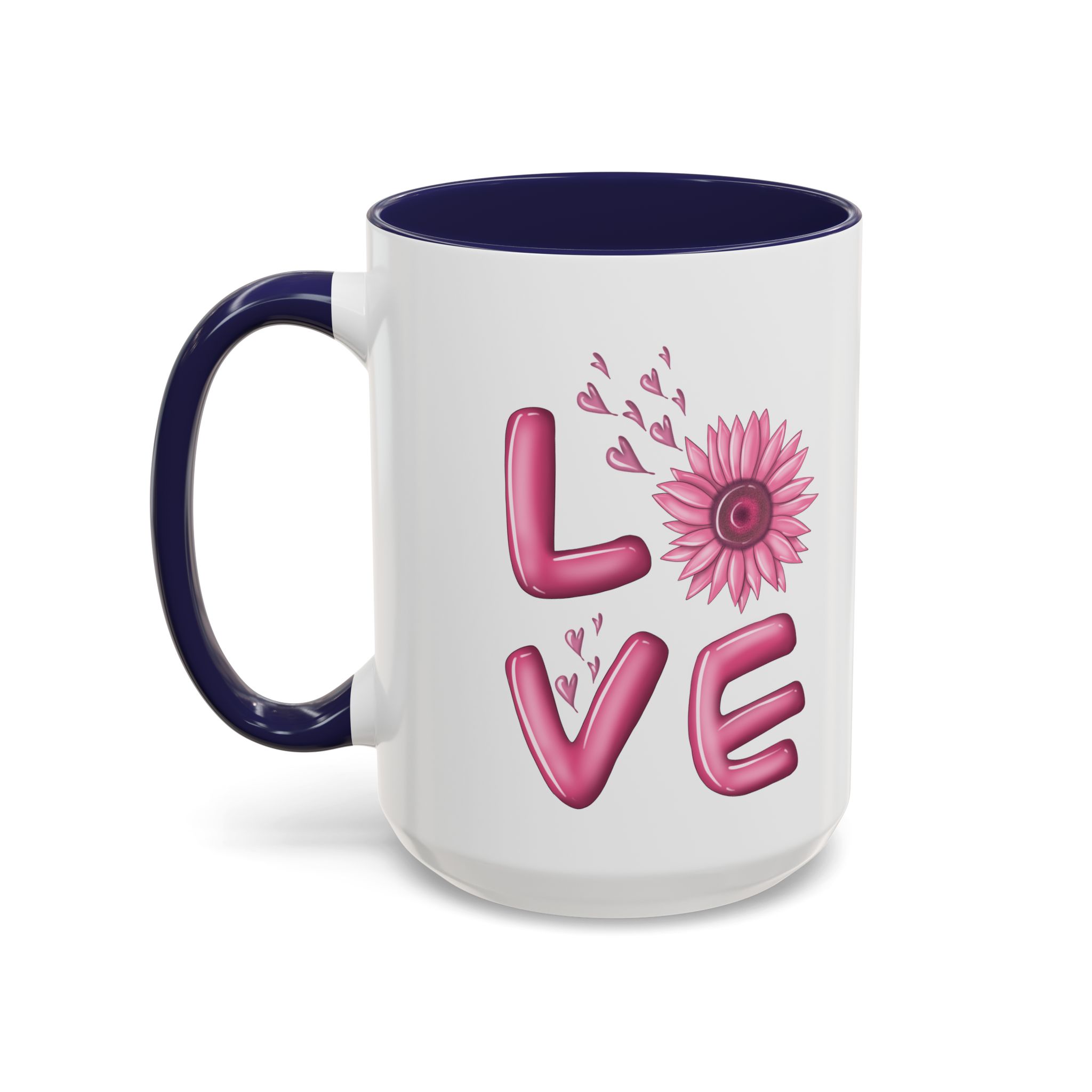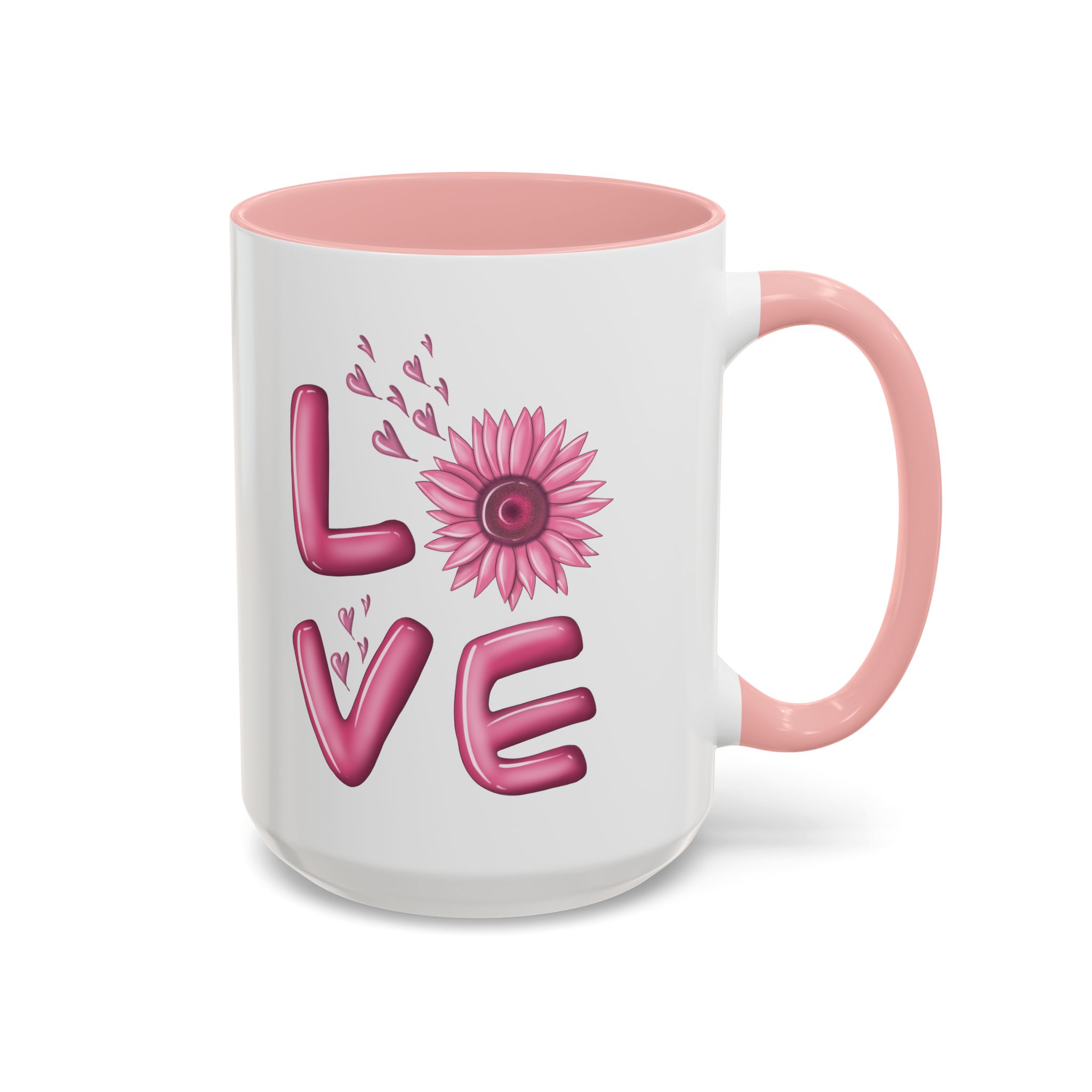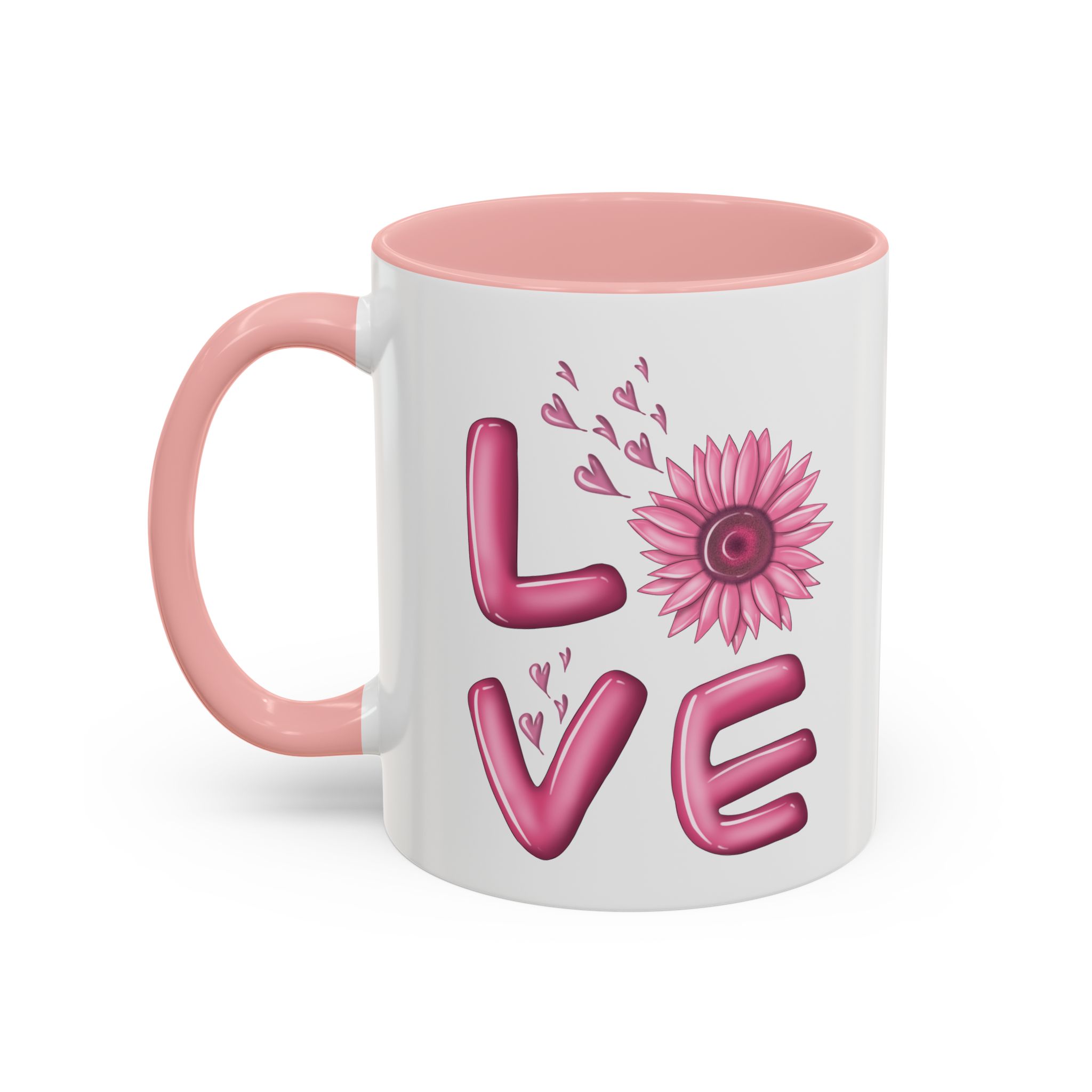 Love, Pink Letters with Flower Design, Meet your next favorite morning companion, the accented ceramic mug. This mug brings the perfect blend of style and functionality to elevate your coffee or tea ritual. Available in two generous sizes, 11oz (0.33 l) and 15oz (0.44 l), this mug offers ample space for your favorite brew. Made with white ceramic and sporting a sleek glossy finish with eye-catching contrast, this mug is a bliss both to use and to look at. The ergonomic C-shaped handle provides a comfortable grip, while the lead and BPA-free construction guarantee peace of mind with every sip.