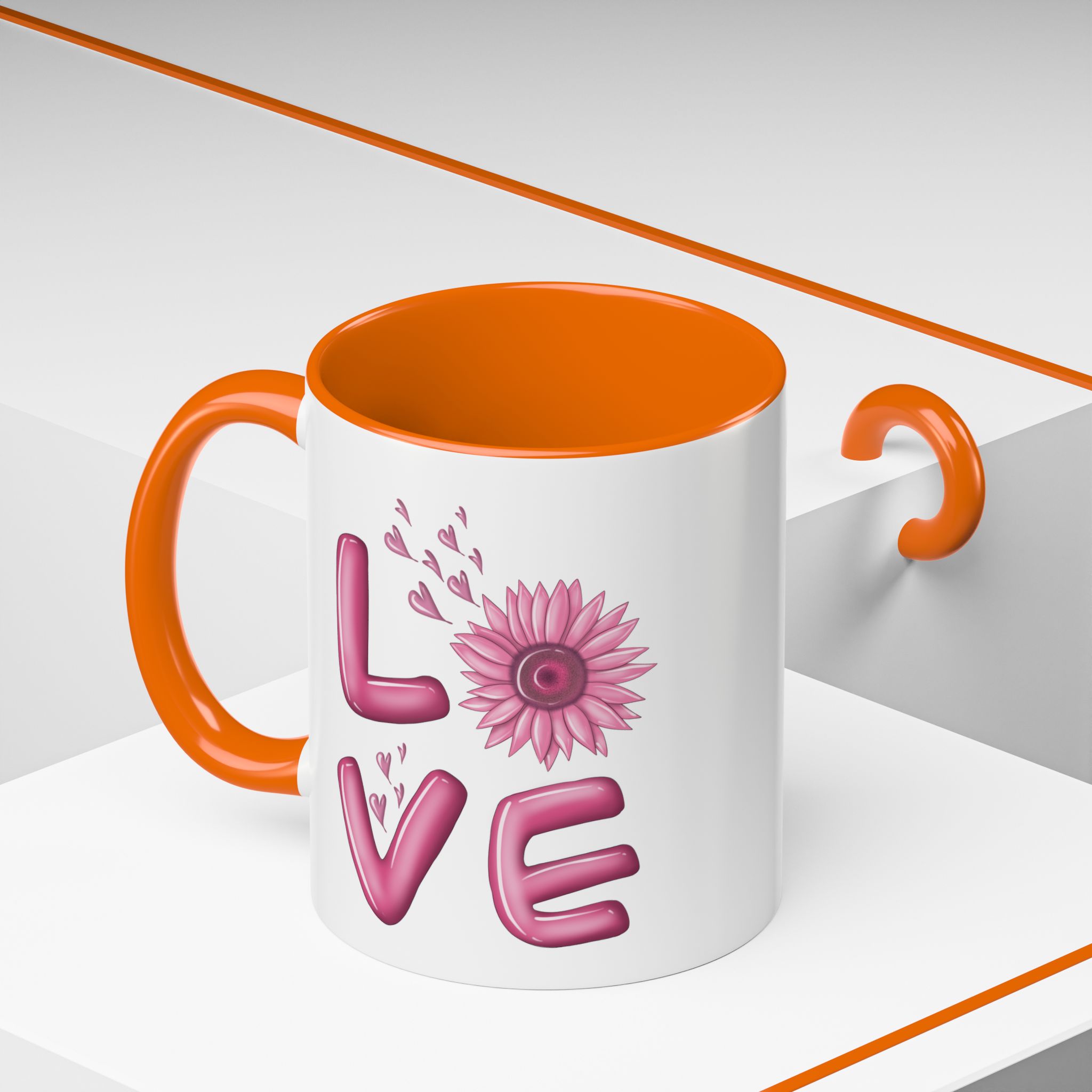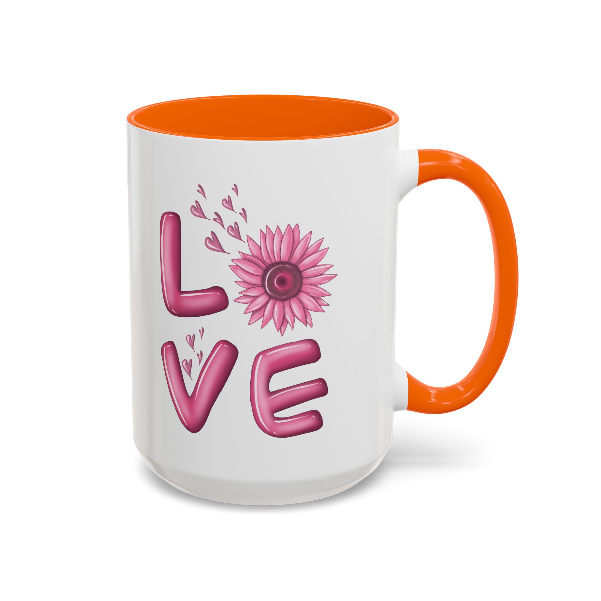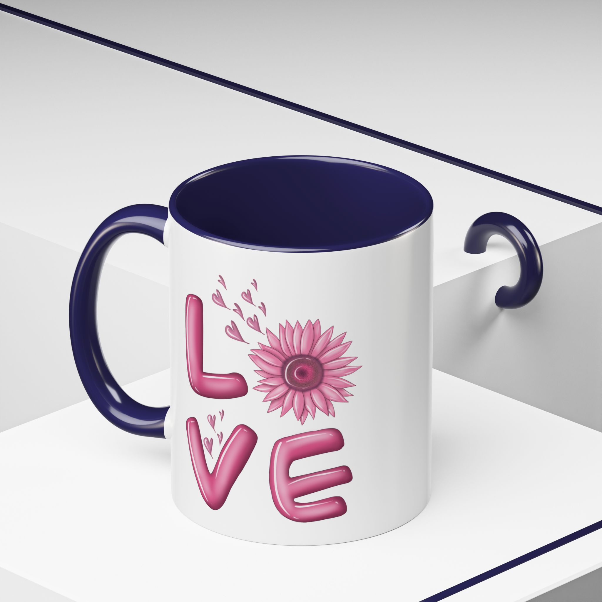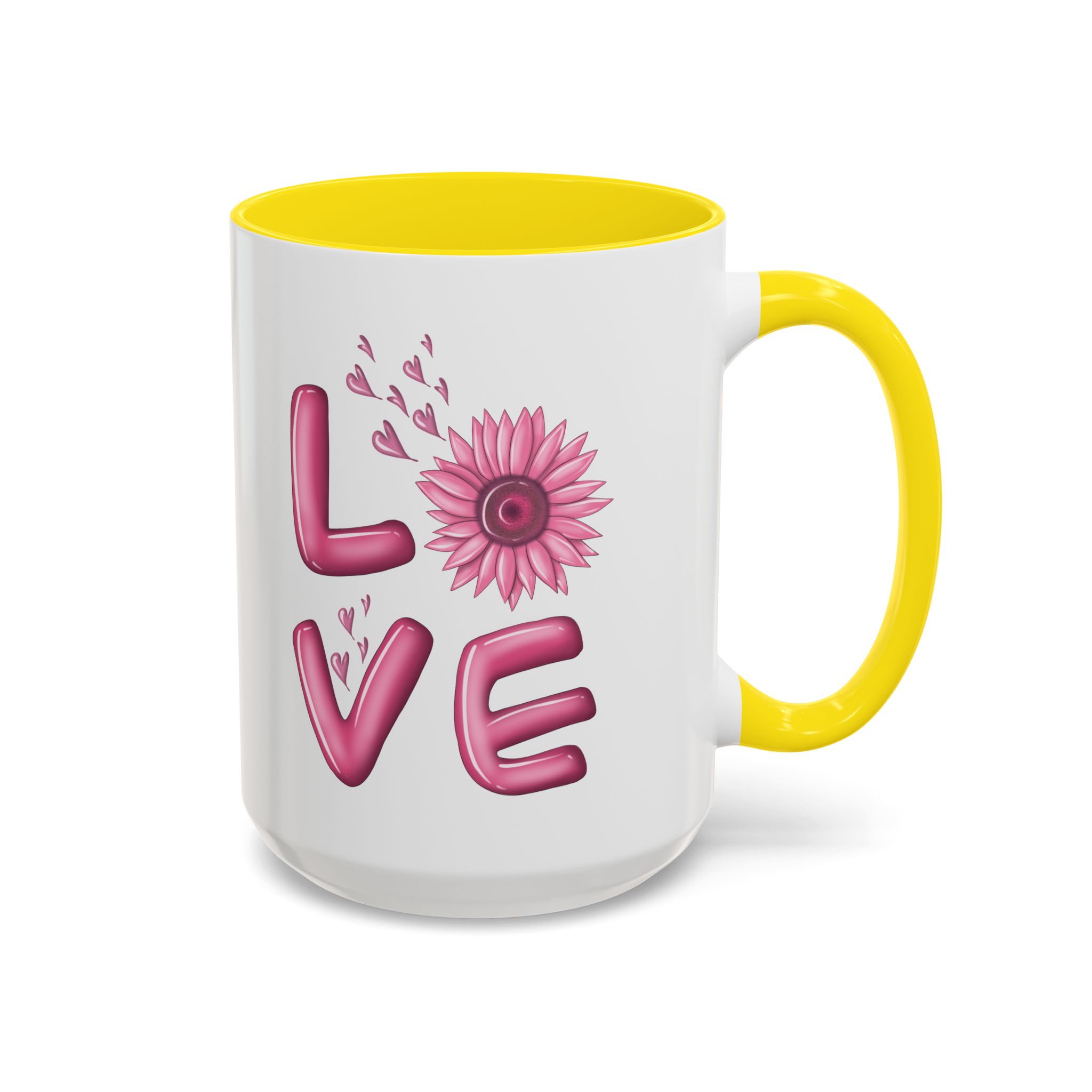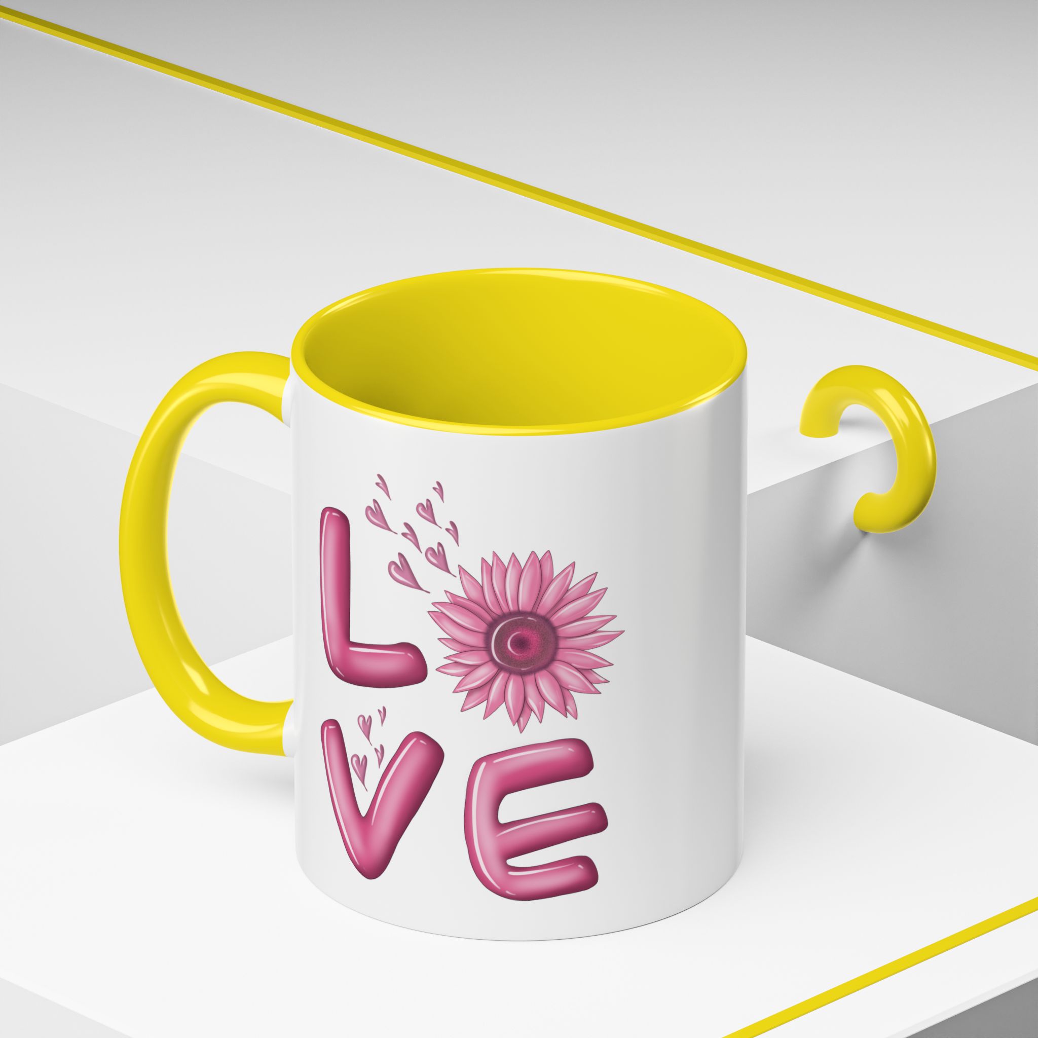 Love, Pink Letters with Flower Design, Meet your next favorite morning companion, the accented ceramic mug. This mug brings the perfect blend of style and functionality to elevate your coffee or tea ritual. Available in two generous sizes, 11oz (0.33 l) and 15oz (0.44 l), this mug offers ample space for your favorite brew. Made with white ceramic and sporting a sleek glossy finish with eye-catching contrast, this mug is a bliss both to use and to look at. The ergonomic C-shaped handle provides a comfortable grip, while the lead and BPA-free construction guarantee peace of mind with every sip.