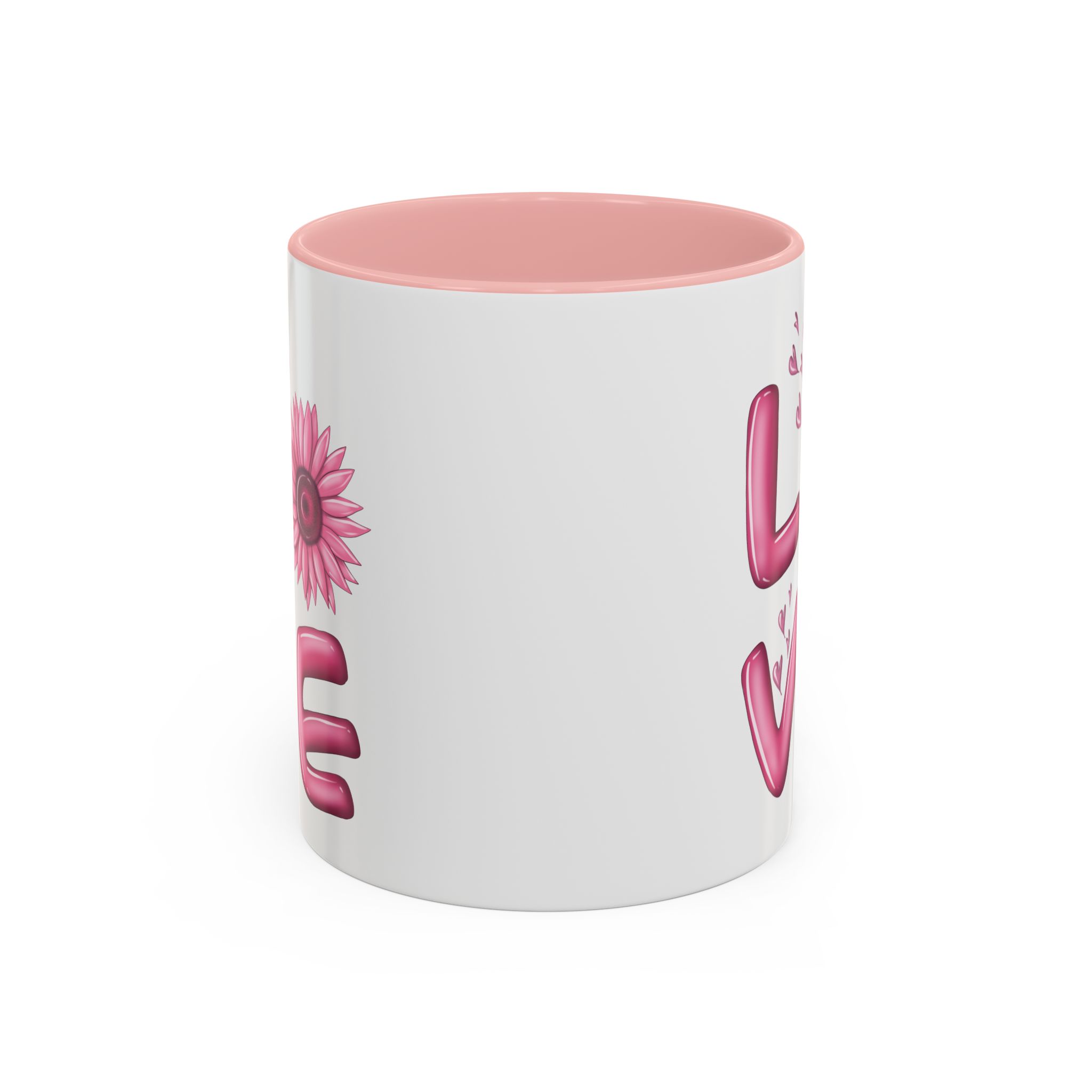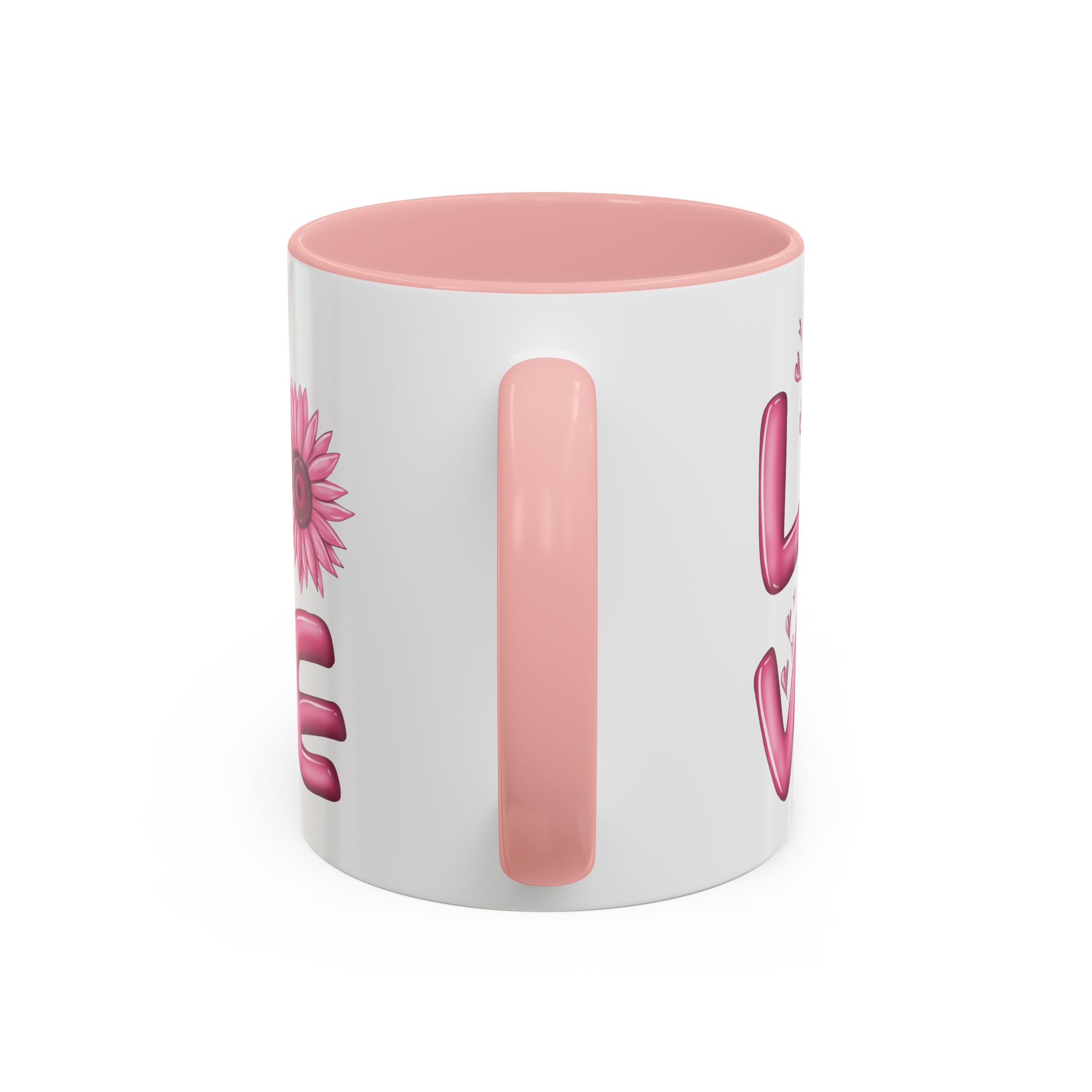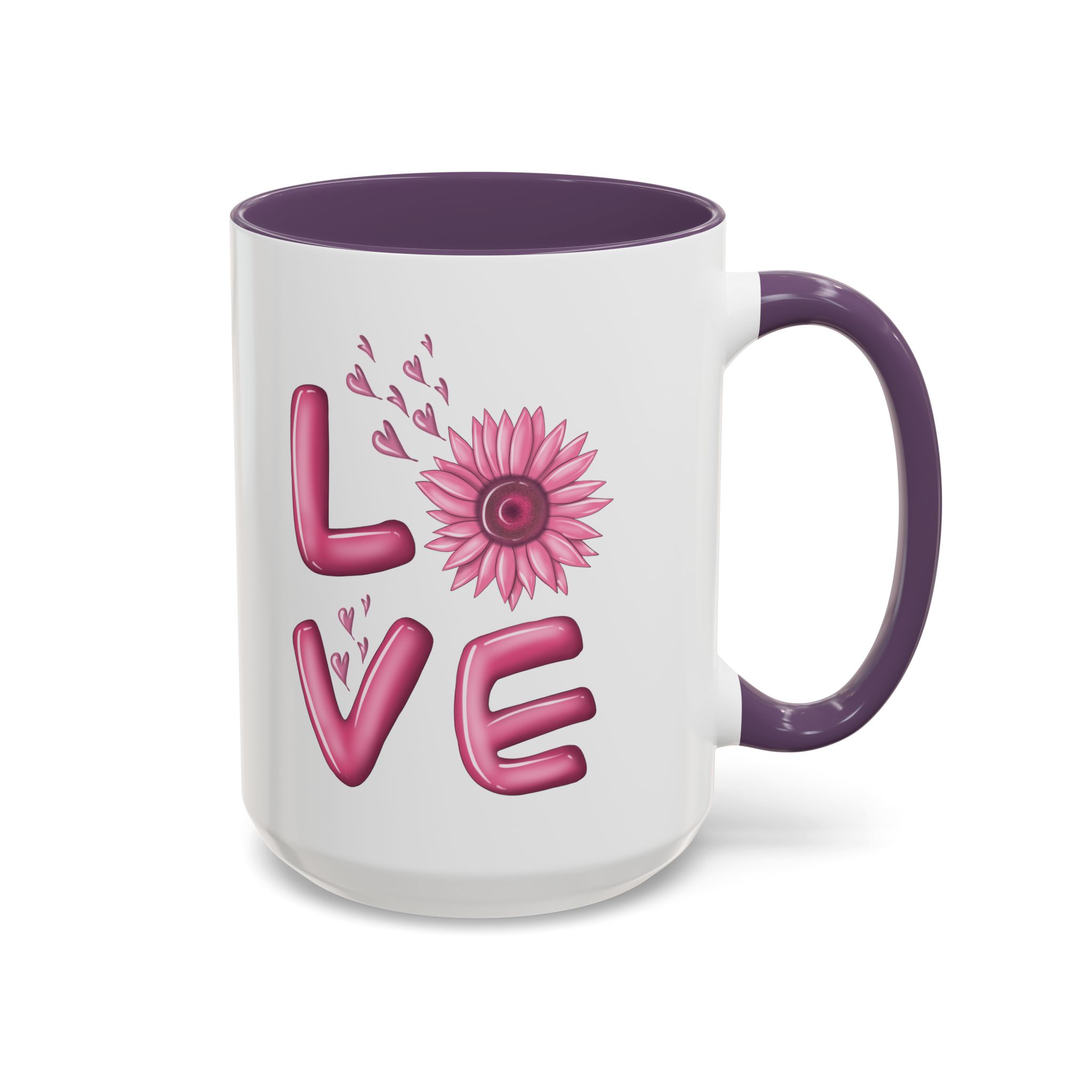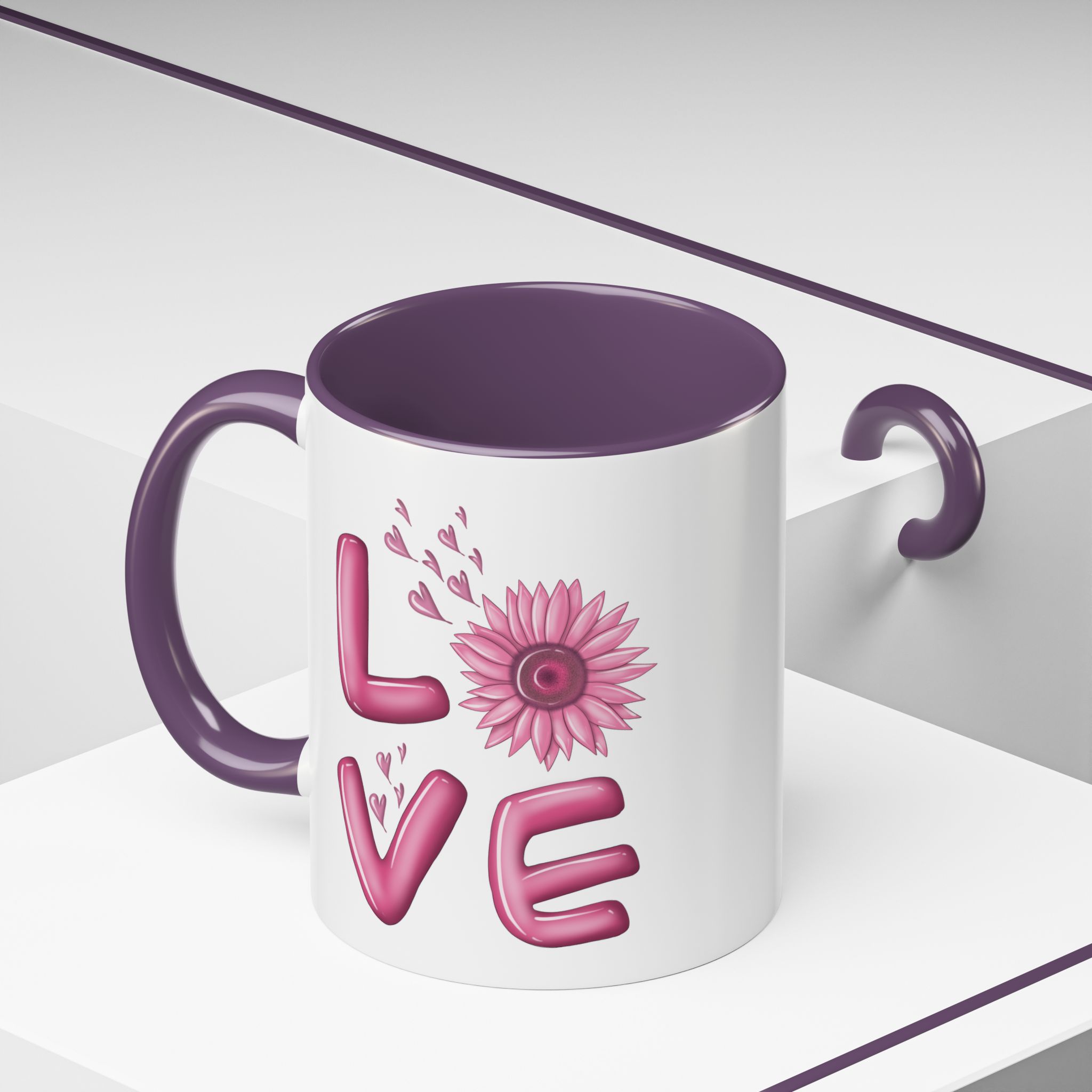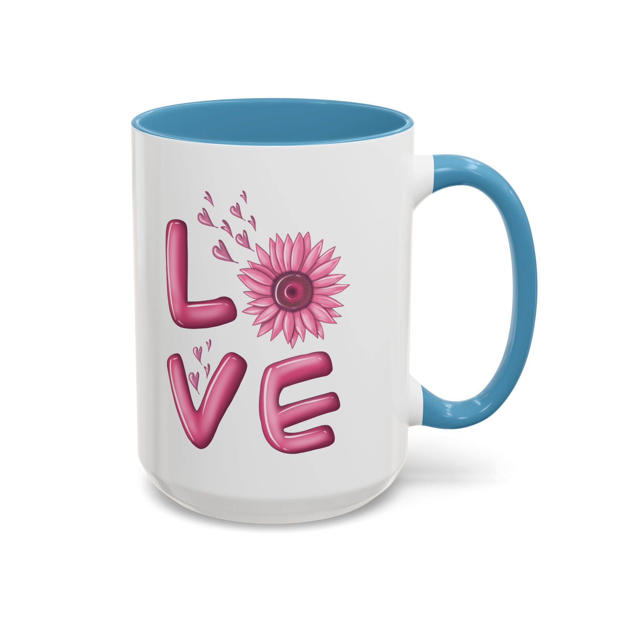 Love, Pink Letters with Flower Design, Meet your next favorite morning companion, the accented ceramic mug. This mug brings the perfect blend of style and functionality to elevate your coffee or tea ritual. Available in two generous sizes, 11oz (0.33 l) and 15oz (0.44 l), this mug offers ample space for your favorite brew. Made with white ceramic and sporting a sleek glossy finish with eye-catching contrast, this mug is a bliss both to use and to look at. The ergonomic C-shaped handle provides a comfortable grip, while the lead and BPA-free construction guarantee peace of mind with every sip.