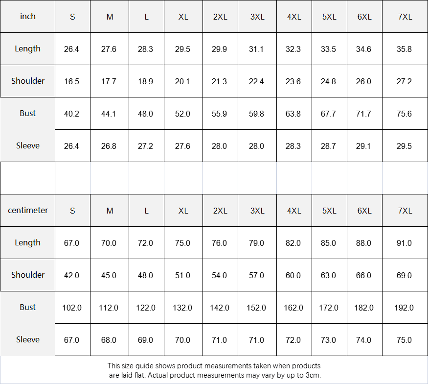 | Centimeter | S | M | L | XL | 2XL | 3XL | 4XL | 5XL | 6XL | 7XL |