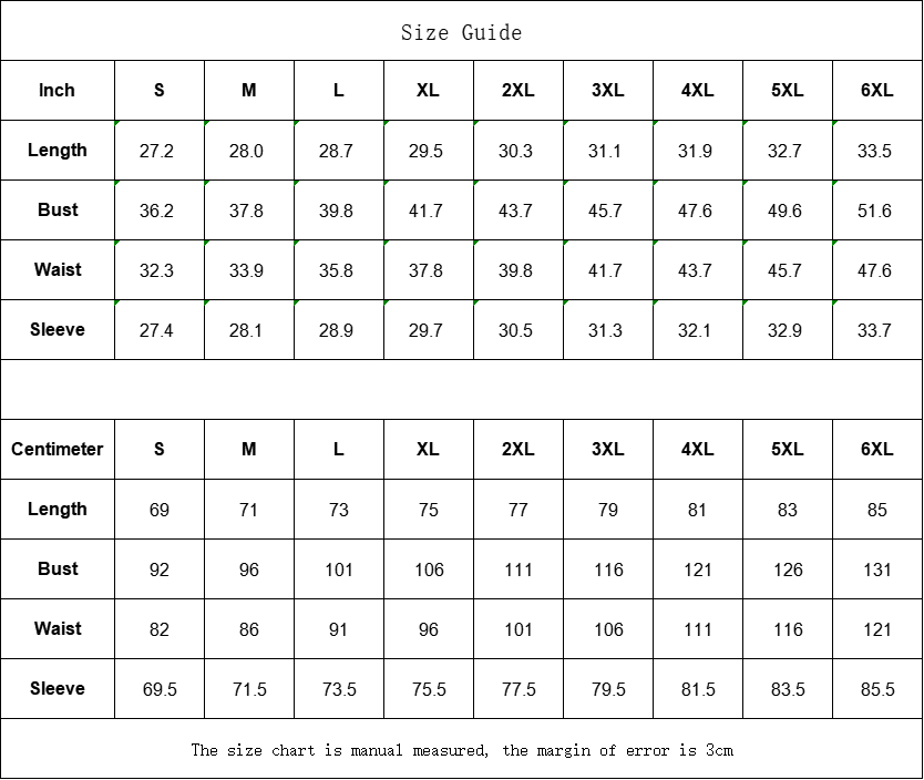 | Centimeter | S | M | L | XL | 2XL | 3XL | 4XL | 5XL | 6XL |