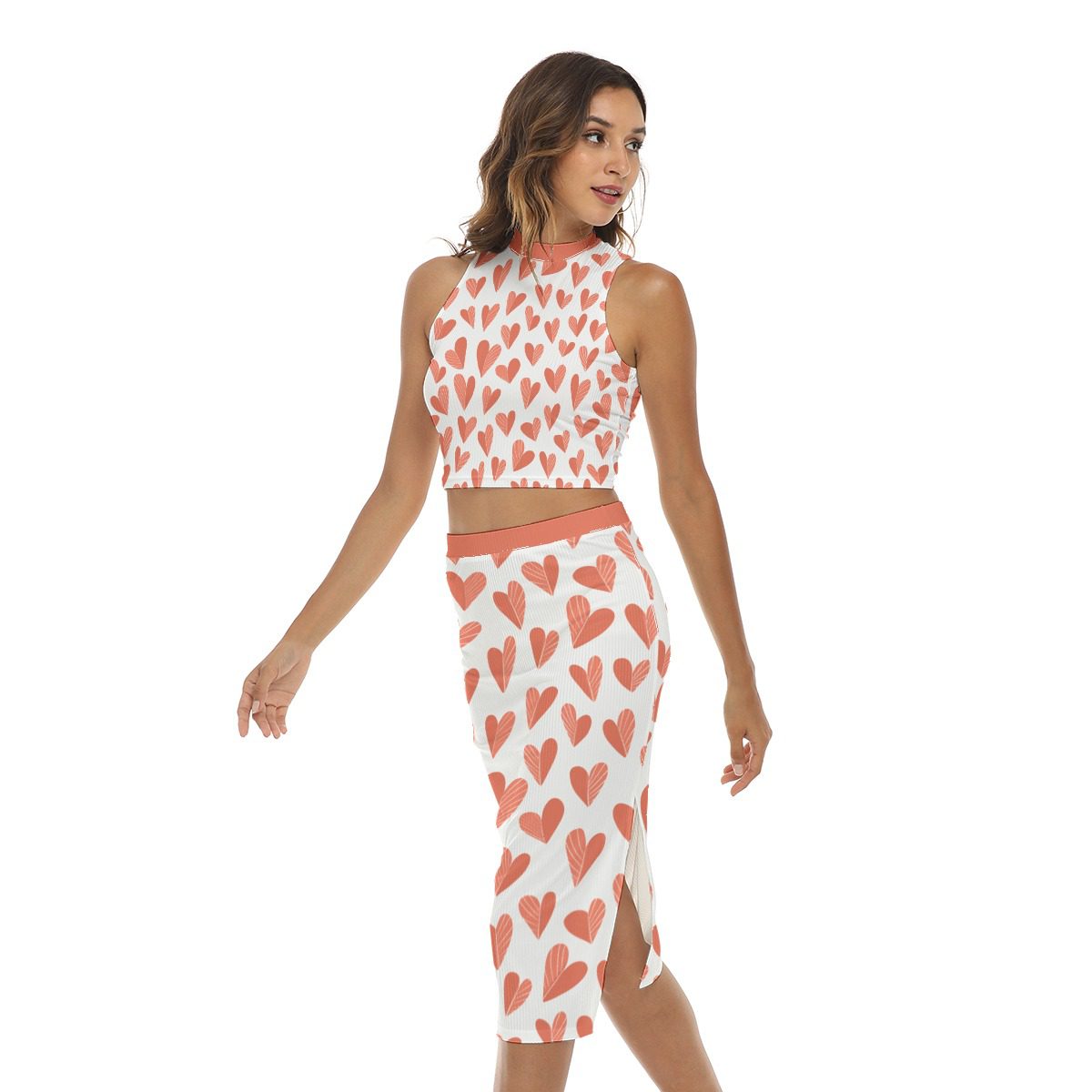 Hearts Pattren Design, Stand-up collar cropped top, matched with a split hip skirt, can show a sexy figure very well