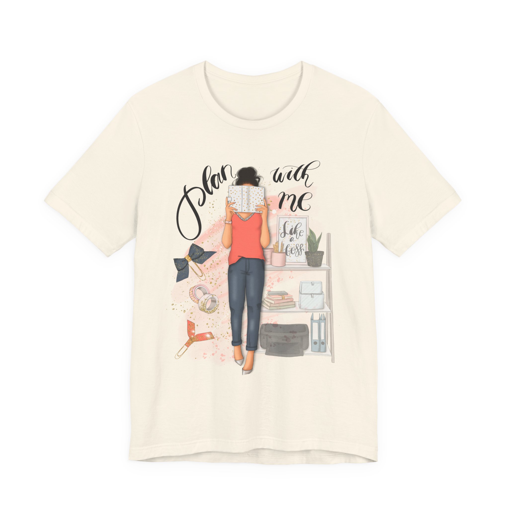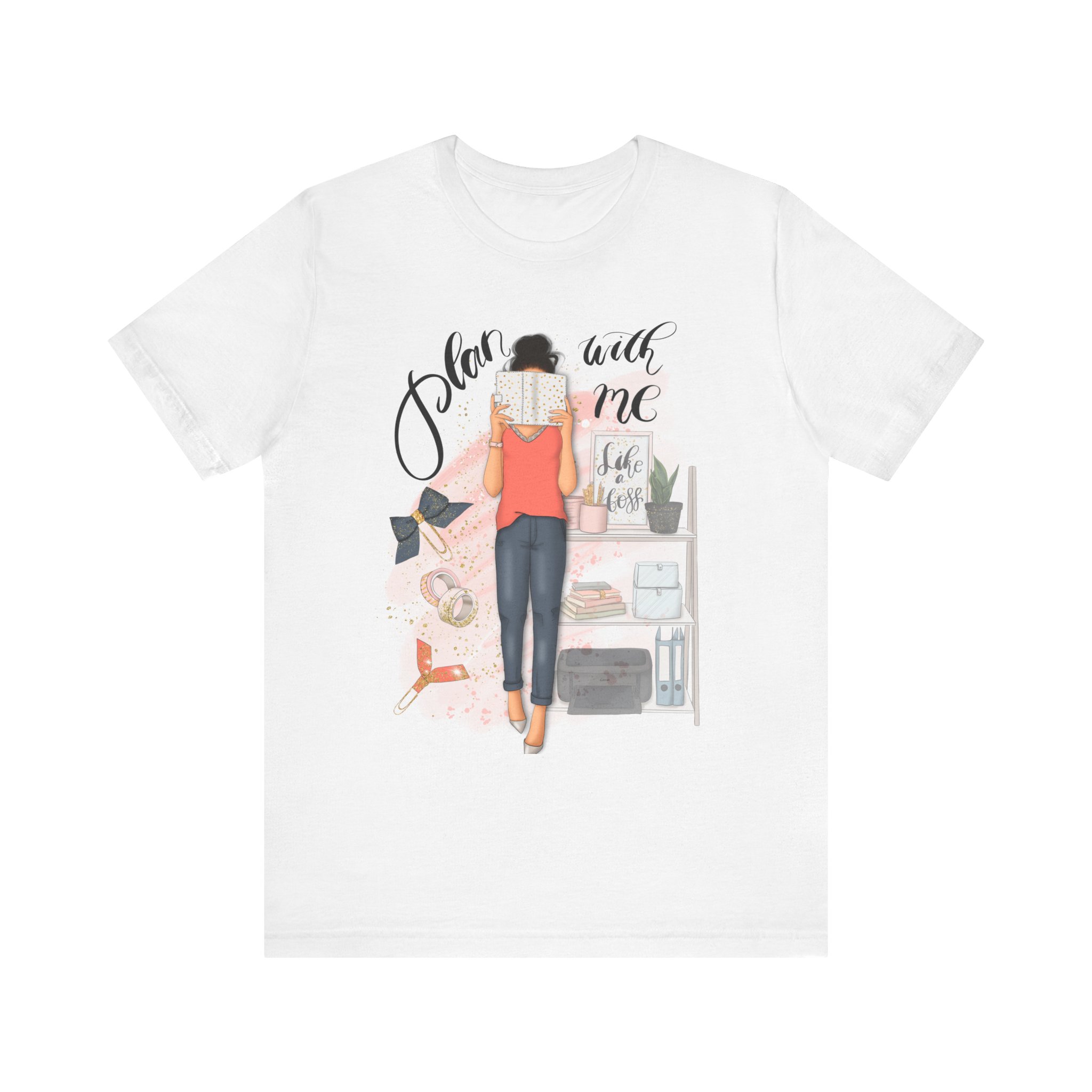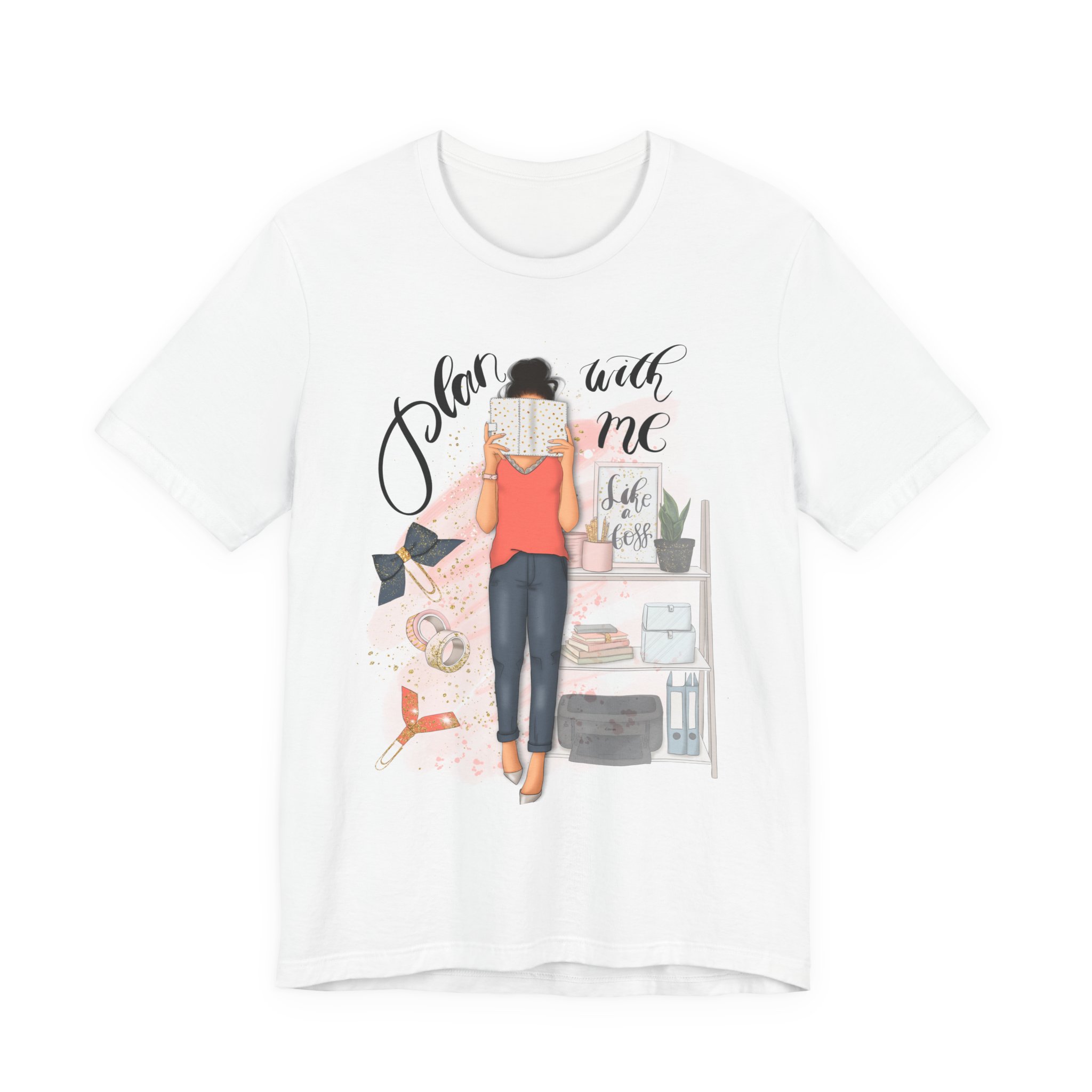 A trendy and comfortable T-Shirt featuring a plan with me girl illustration with her accessories. Perfect for casual wear and adding a touch of style to any outfit. Ideal for those who love planning and organizing their life. Great for gifting during birthdays or as a thoughtful surprise for friends and family.