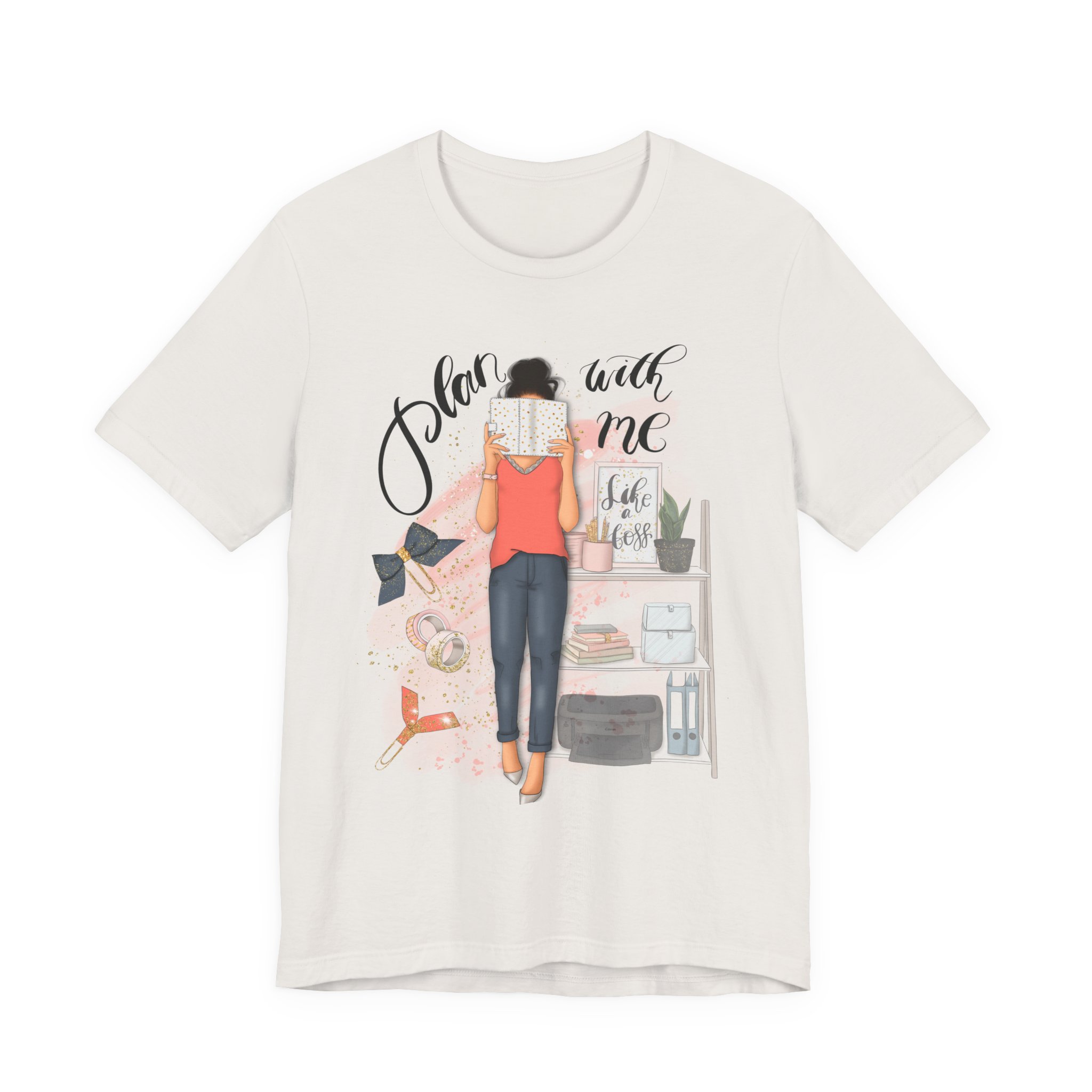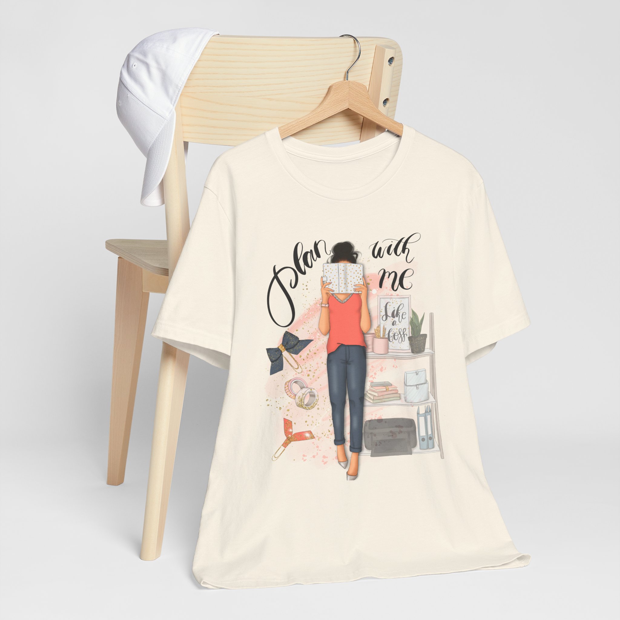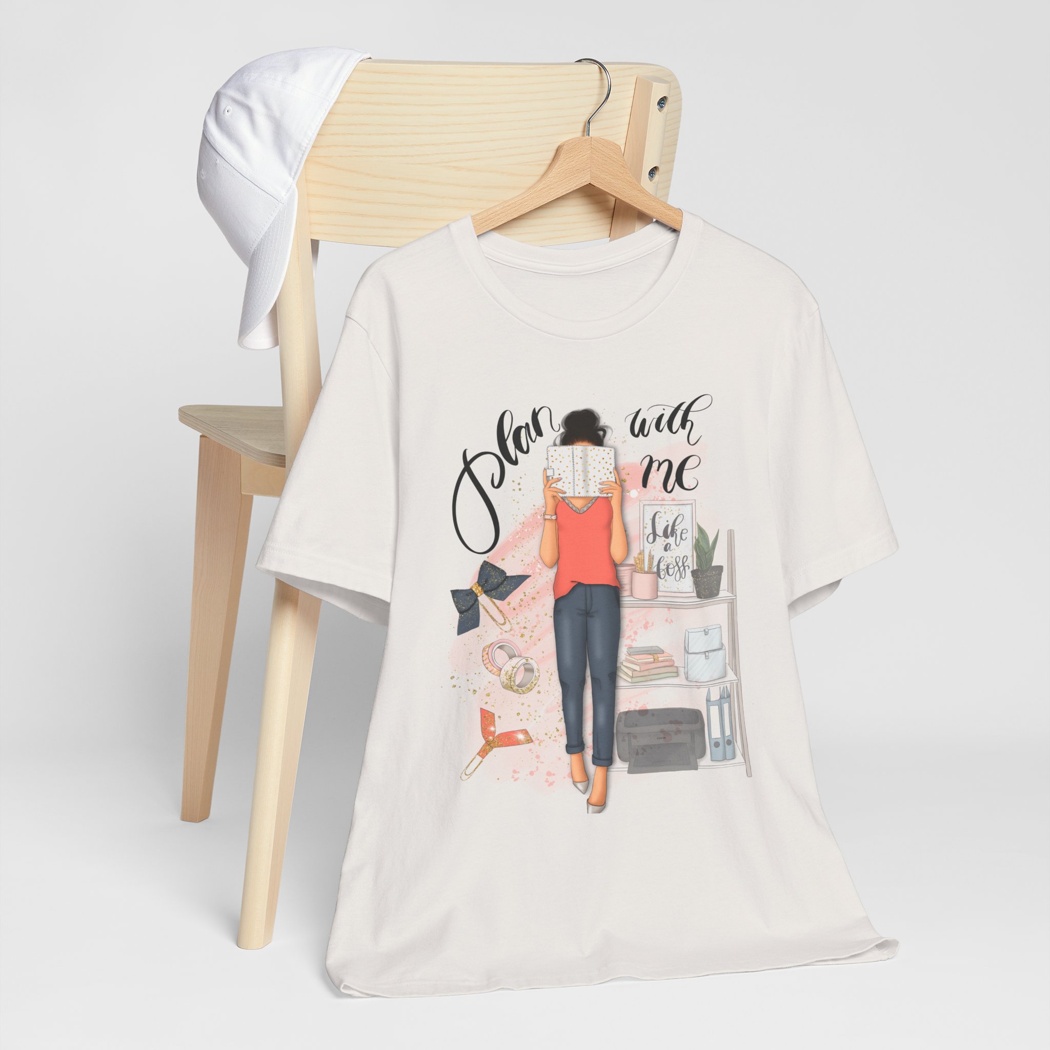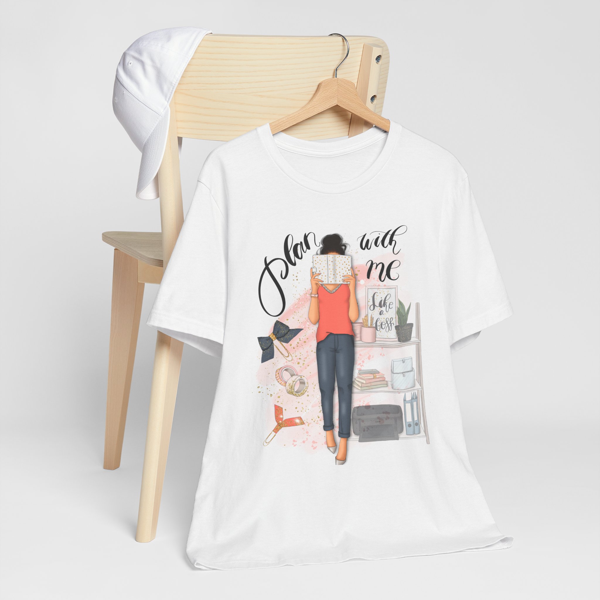 A trendy and comfortable T-Shirt featuring a plan with me girl illustration with her accessories. Perfect for casual wear and adding a touch of style to any outfit. Ideal for those who love planning and organizing their life. Great for gifting during birthdays or as a thoughtful surprise for friends and family.