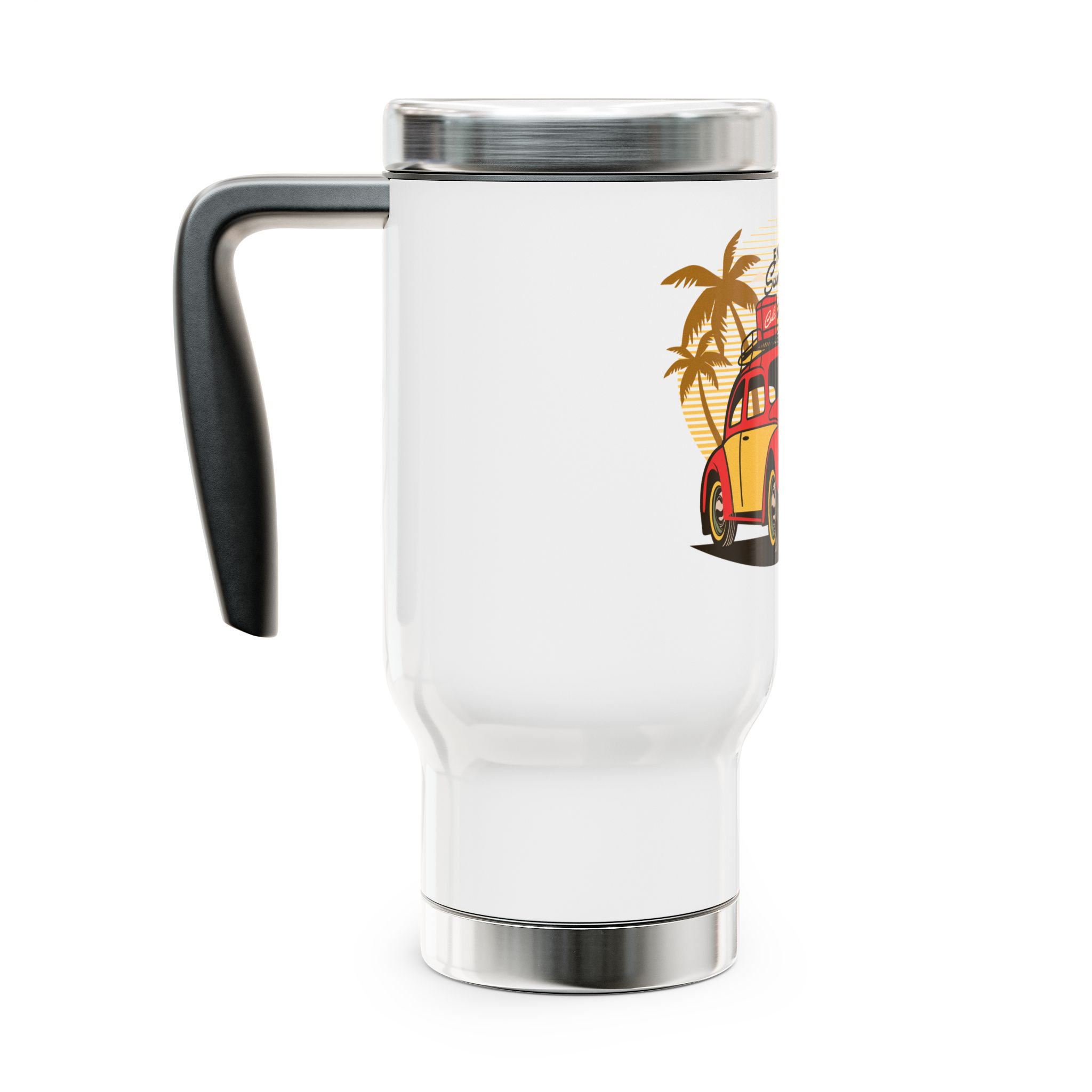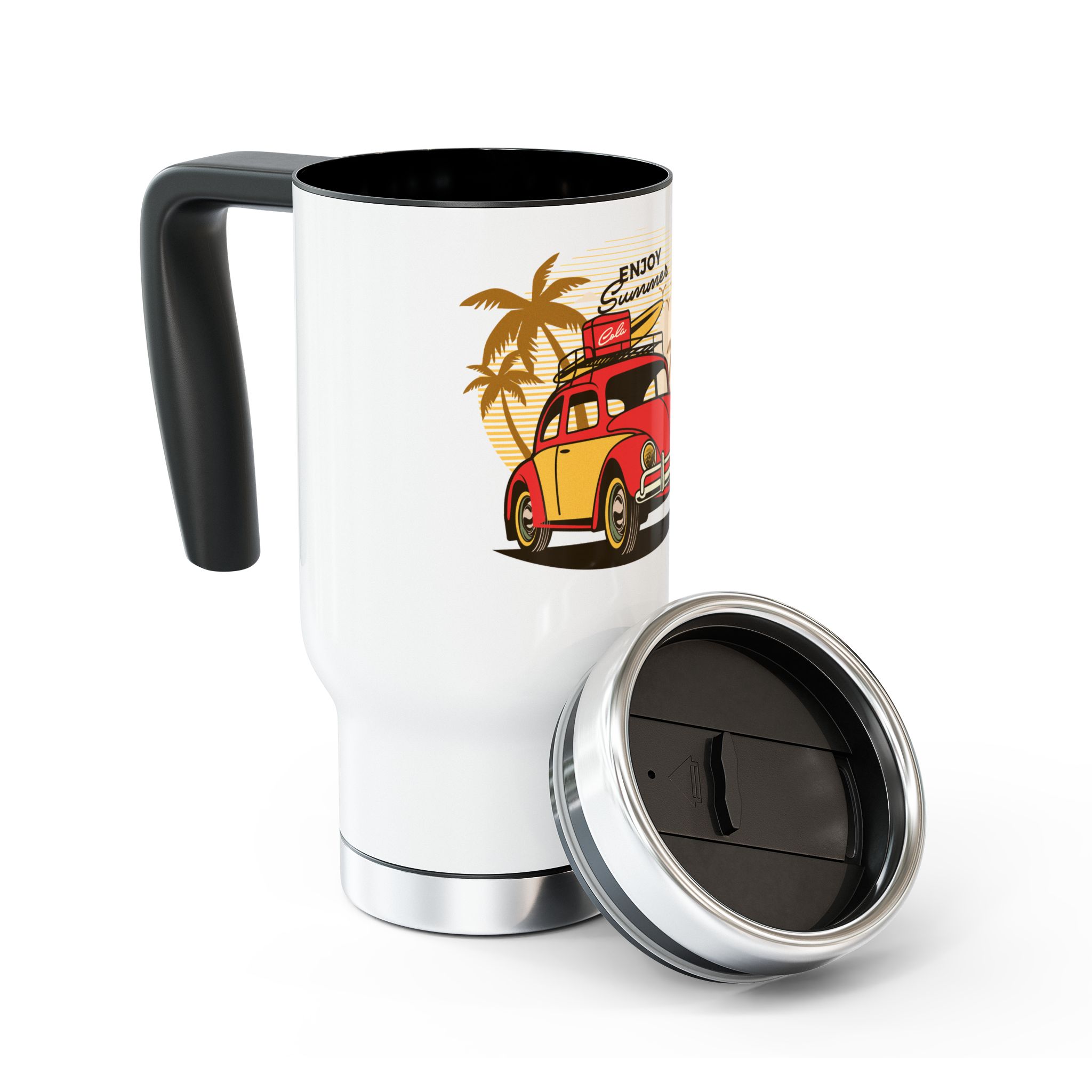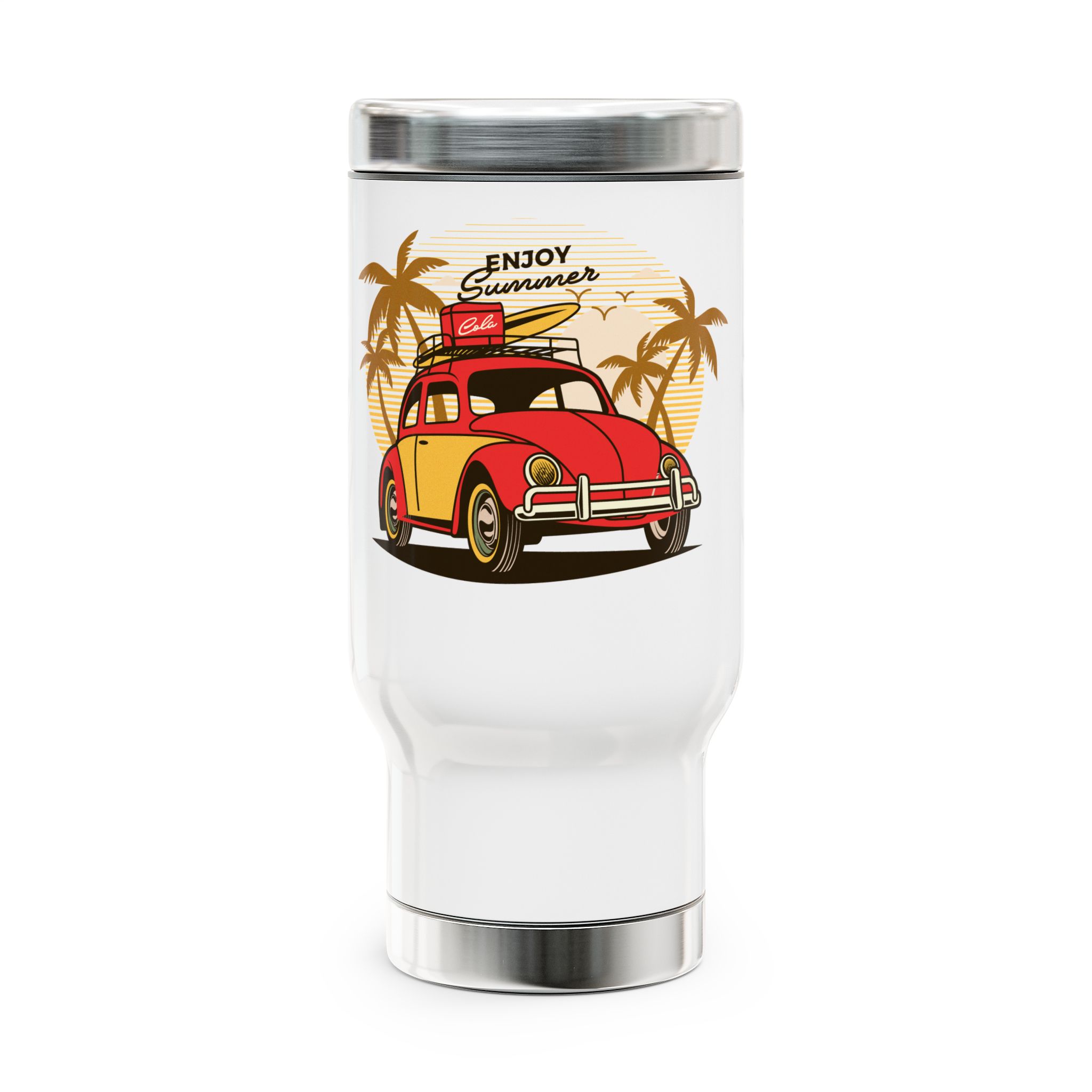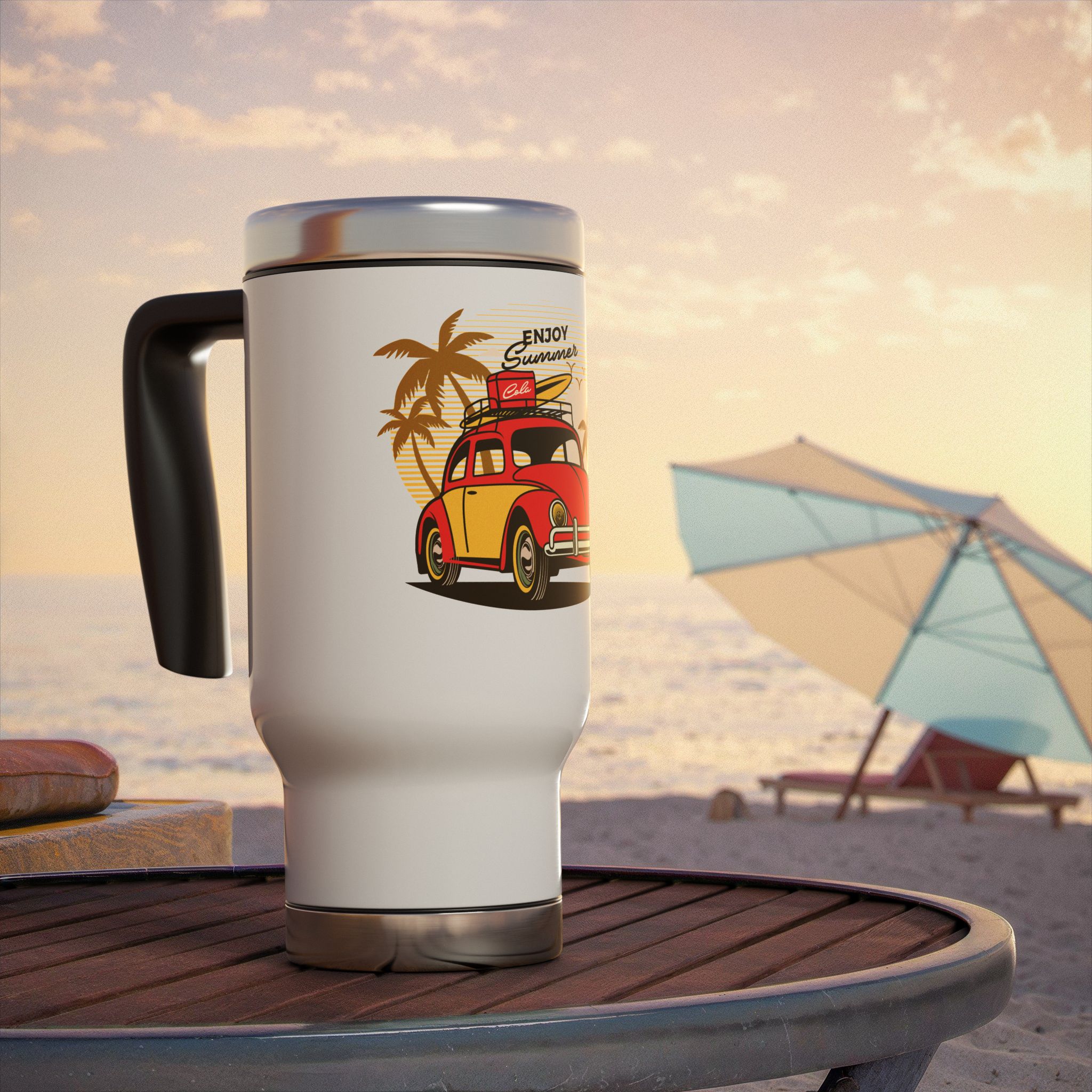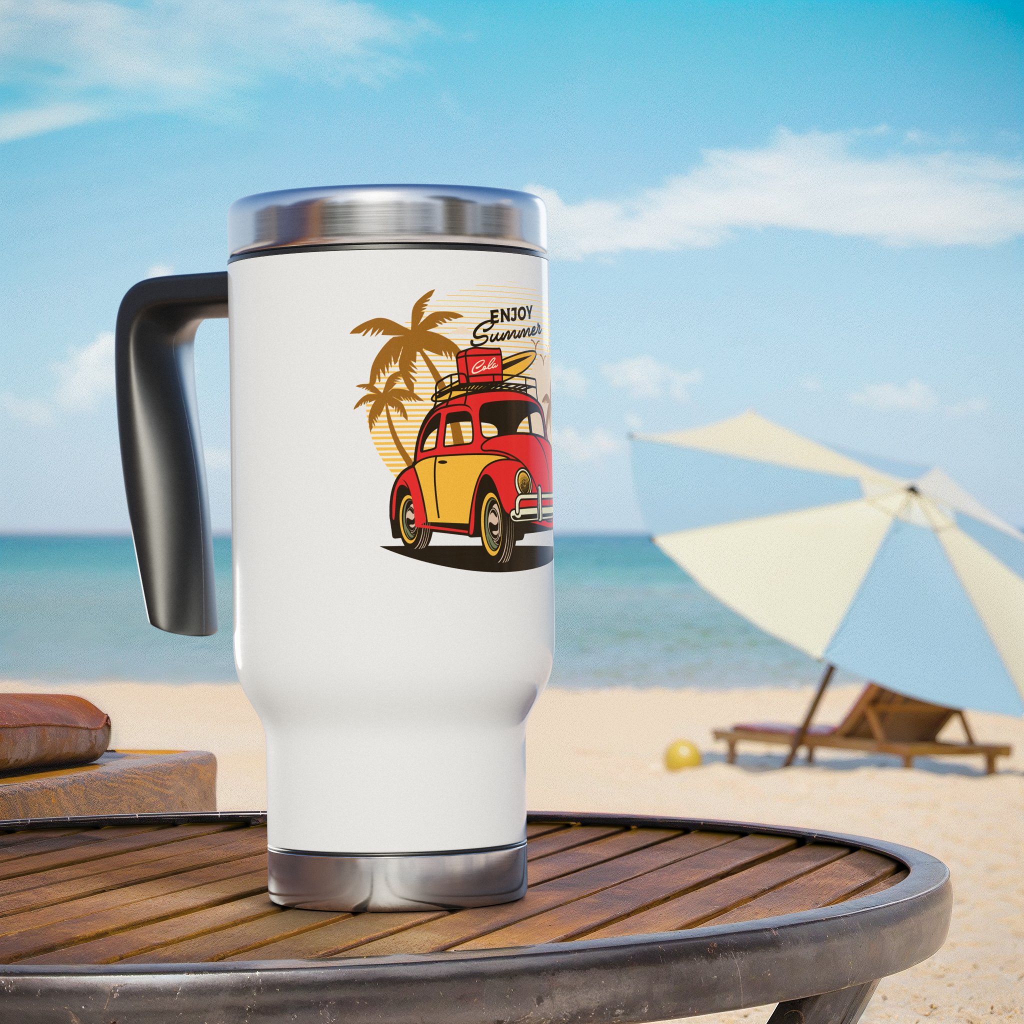This Stainless Steel Travel Mug with Handle is perfect for those who enjoy picnics in the summer. The vibrant colors of the Enjoy Summer picnic design will brighten up your day and keep your drinks at the perfect temperature. Ideal for outdoor enthusiasts and those who love to stay hydrated on the go. Perfect for summer vacations, picnics, and road trips.