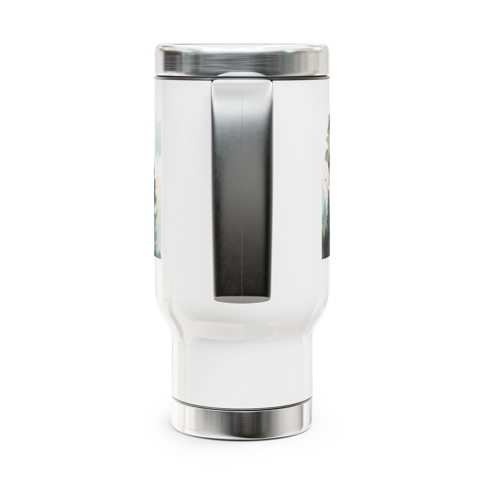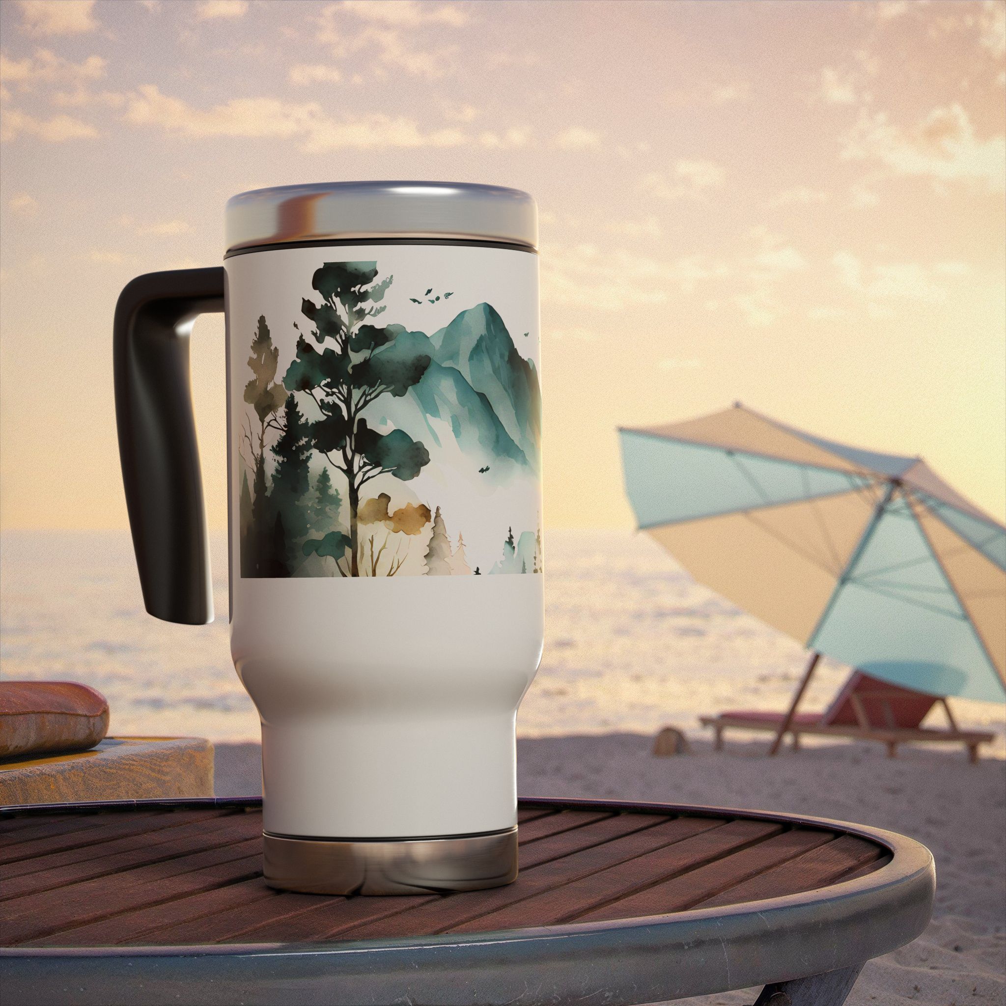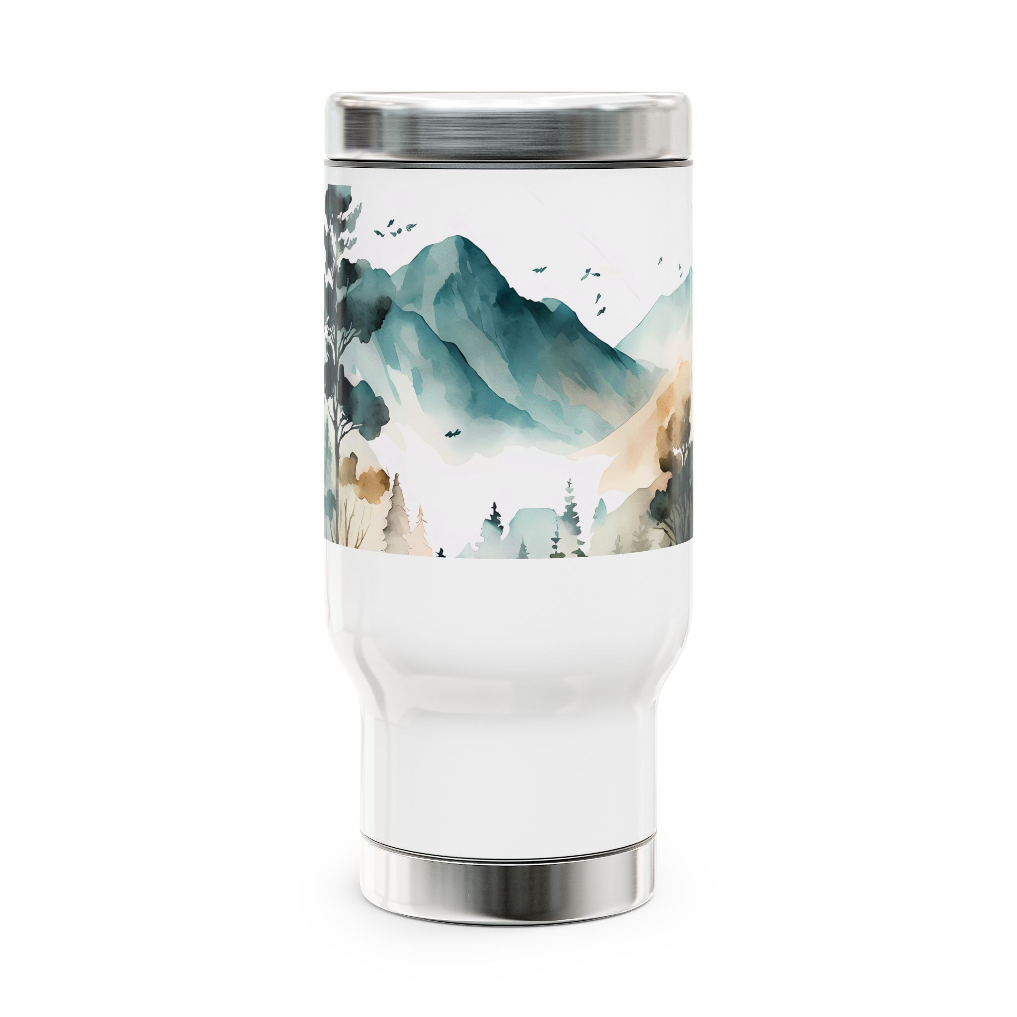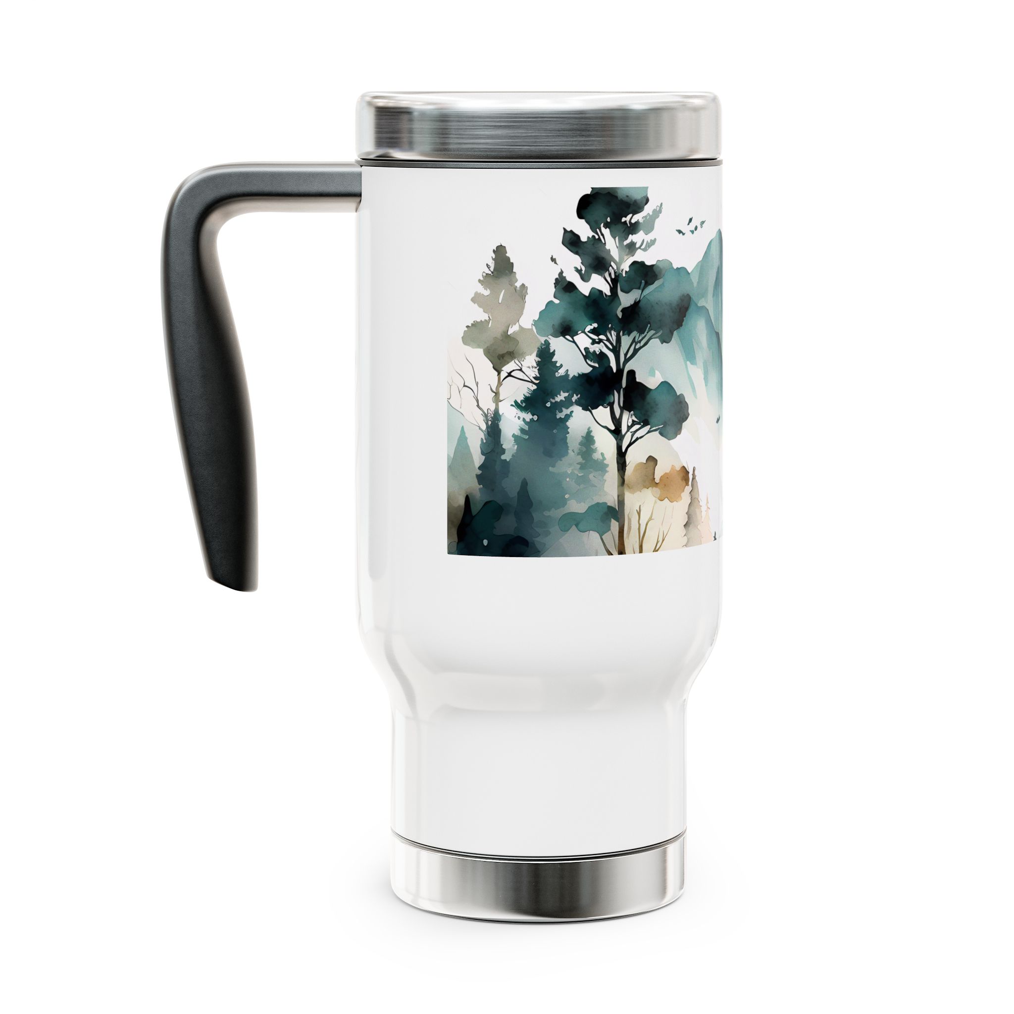 This stainless steel travel mug with handle features a watercolor mountain view design, giving off a serene and peaceful vibe. Perfect for nature lovers and outdoor enthusiasts, this travel mug is ideal for those who enjoy exploring the great outdoors. It’s a great gift for hikers, campers, and nature lovers, perfect for birthdays, holidays, or as a stocking stuffer.