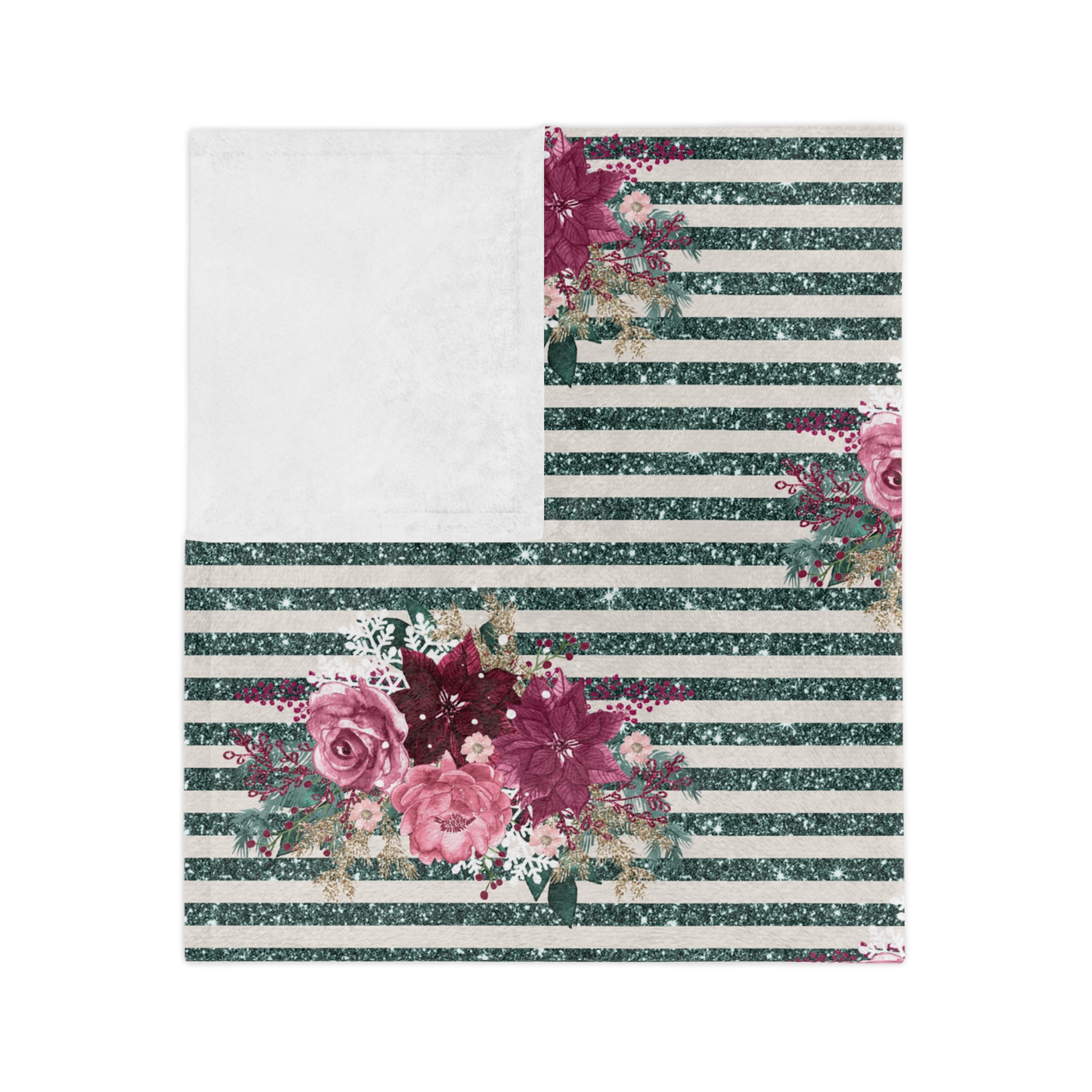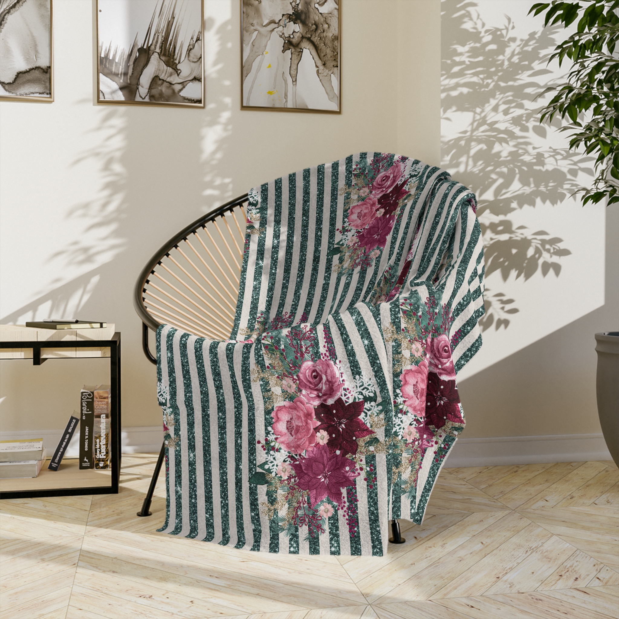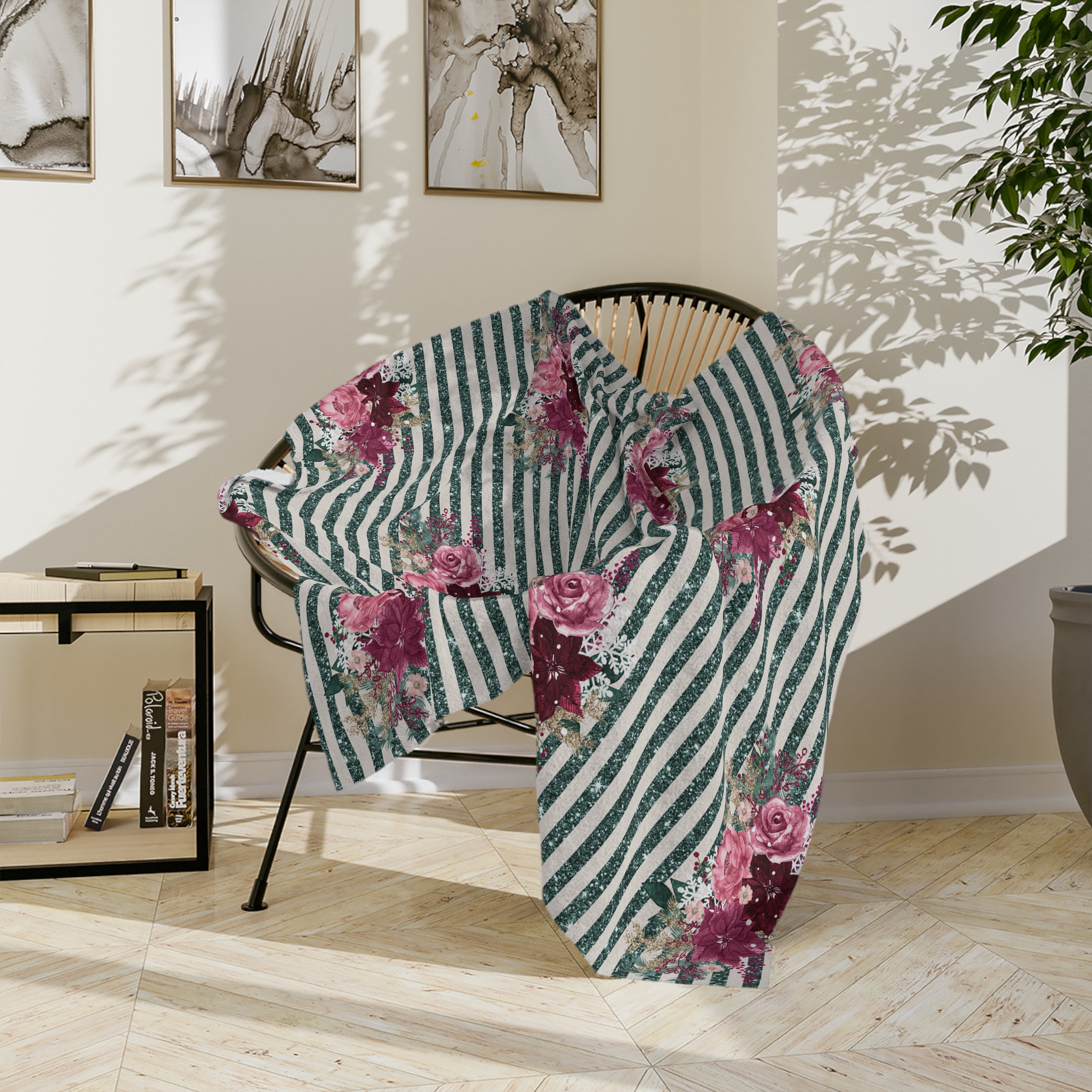 This Christmas flower pattern blanket features a beautiful mix of floral details and striped background, giving it a stylish yet cozy holiday look. The vibrant colors stay bright and crisp, making it a perfect decorative piece for the winter season.