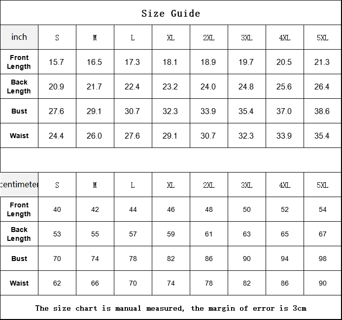 | centimeter | S | M | L | XL | 2XL | 3XL | 4XL | 5XL |