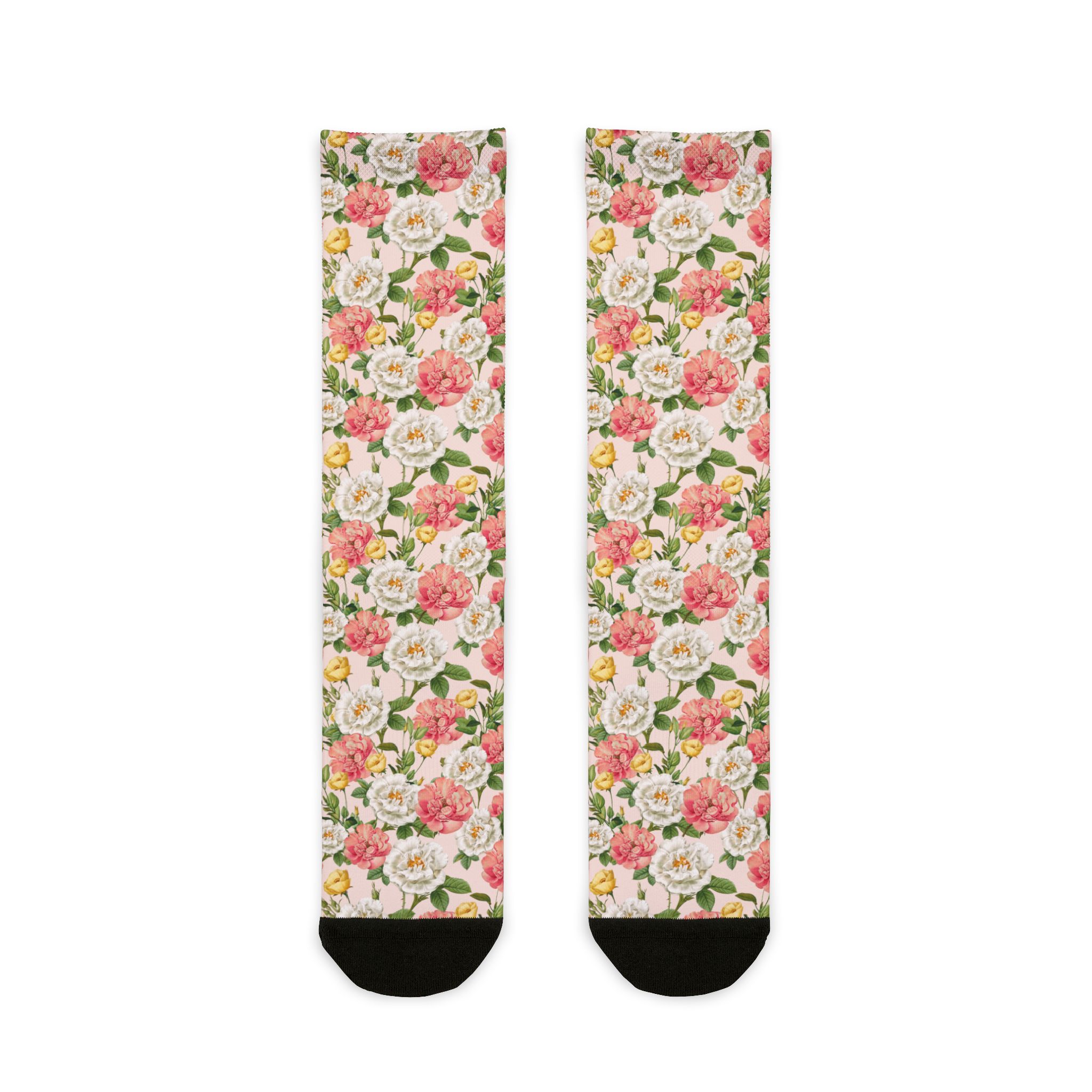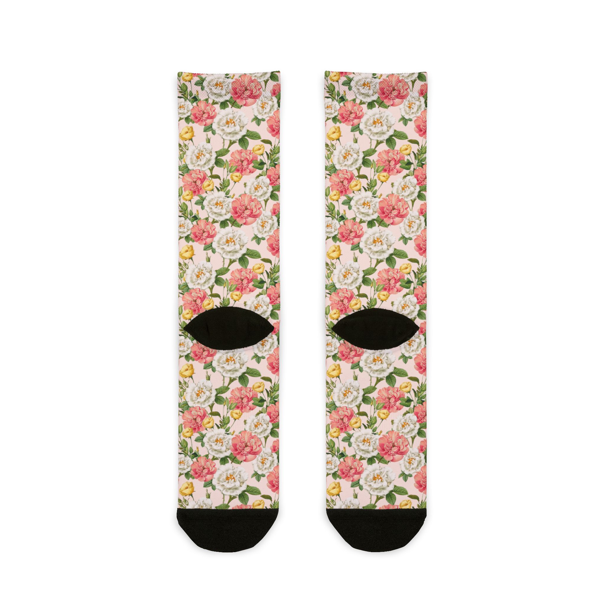 White Pink Flowers Pattren Design, Comfort and style is the name of the game for these sublimation crew socks. Designed to fit universally from women’s size 5 US up to men’s size 13 US, these socks strike the perfect balance of durability and flexibility thanks to their fabric blend. (60% polyester, 10% acrylic, 25% nylon, 5% spandex) All socks come with stylish black heel and toe accents.