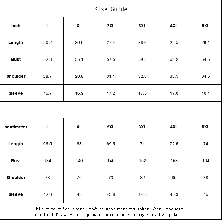 | Inch | L | XL | 2XL | 3XL | 4XL | 5XL |